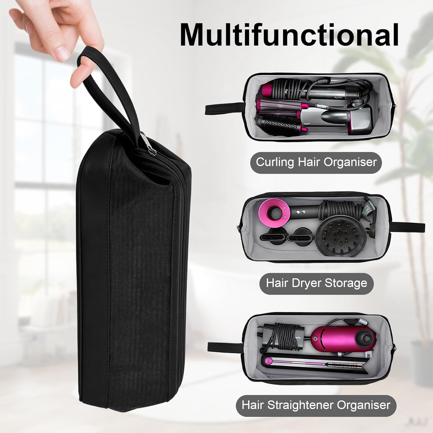 【Compatibile con il modello】Questa custodia da viaggio è compatibile con Dyson Airwrap Styler, ferro arricciacapelli, Supersonic Styler, Shark FlexStyle e accessori. Per altri modelli, controlla le dimensioni del tuo modello prima dell'acquisto 【Tonnellate di spazio】Le ampie tasche con cerniera in metallo sono ideali per riporre Dyson Airwrap Styler, asciugacapelli, arricciacapelli e accessori, mantenendo l'oggetto interno lontano dalla polvere 【Protezione eccellente】Realizzato in resistente materiale in pelle impermeabile e interno morbido ben imbottito, protegge il tuo airwrap styler da sporco, graffi e polvere domestica 【Design portatile】La maniglia laterale e il design pieghevole lo rendono facile da trasportare e riporre, soddisferanno le tue esigenze di borsa per asciugacapelli che puoi mettere in valigia e negli zaini in viaggio 【Scelta ideale】Dimensioni: 15,3" x 6,7" x 4,9" compatibile con Dyson Airwrap Styler, asciugacapelli Dyson, arricciacapelli e accessori, viene fornito con organizer per accessori per i tuoi accessori Dyson Airwrap, ottimo regalo per tua madre, familiari, amici per la festa della mamma, San Valentino e Natale ecc.
