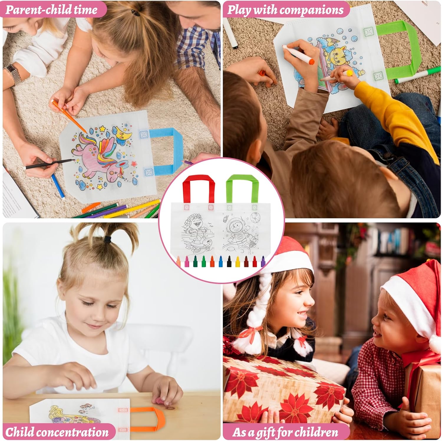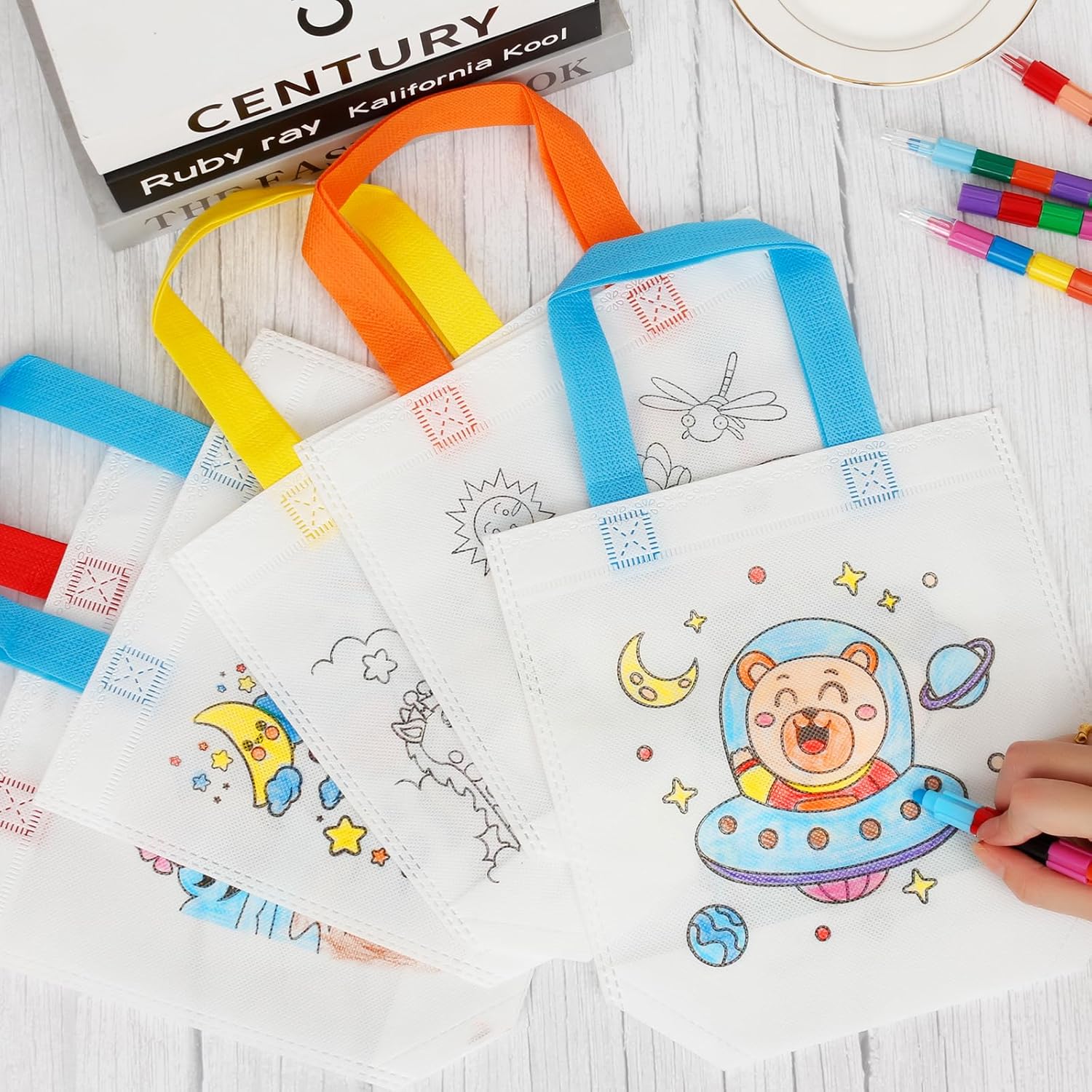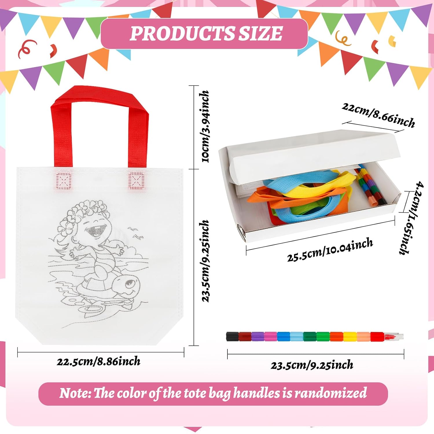 Set di borse per pastelli fai da te: il set di borse in tessuto per bambini include 12 borse in tessuto non tessuto e 6 pastelli a cera impilabili. Un pastello a cera è composto da 12 pastelli singoli di colori diversi, comodi e pratici. Soddisfa le esigenze di colorazione del tuo bambino con un solo pastello a cera, ideale per i regali di compleanno per bambini, per i regali di matrimonio per bambini e per i regali di Natale. MATERIALI DI QUALITÀ: Borsa in tessuto non tessuto per colorare realizzata in tessuto non tessuto di alta qualità, resistente, non tossico, insapore, sicuro e rispettoso dell'ambiente, stampa chiara, facile da colorare.Pastelli impilabili per bambini realizzati in cera di alta qualità, colori brillanti, colorazione senza macchiare le mani, non facile da rompere. Il portamatite è realizzato in plastica sicura, senza odori. Borse da colorare per bambini: la dimensione delle nostre borse per graffiti fai da te è di 22,5 cm*23,5 cm, il manico è di circa 10 cm, ogni borsa ha un disegno diverso su entrambi i lati, non c'è ripetizione, tra cui unicorni, babbi natale, sirene, dinosauri ecc. Le borse da colorare per bambini sono stampate in modo chiaro, così i bambini possono dare sfogo alla loro immaginazione e creare le loro borse di stoffa uniche.(Nota: il colore della maniglia della borsa da trasporto è casuale) Pastelli impilabili per bambini: i nostri pastelli a cera impilabili sono lunghi 23,5 cm e sono composti da 12 pastelli colorati individuali. Non solo i pastelli possono essere regolati in lunghezza per adattarsi alle preferenze del bambino, ma possono anche essere utilizzati come blocchi da costruzione per creare forme e modelli diversi, incoraggiando le abilità pratiche e l'immaginazione dei bambini. È un ottimo giocattolo educativo. Regalo per bambini: il set di sacchetti fai-da-te per dipingere è un regalo perfetto per i bambini, i bambini possono facilmente colorare il disegno e ottenere un senso di realizzazione nella colorazione, anche i pastelli che sono deformati sono molto interessanti, il set di sacchetti fai-da-te per dipingere è adatto per tutti i tipi di regali di festa, compresi i regali per gli ospiti per Natale, compleanni, Halloween, sacchetti di caramelle di Halloween e così via.