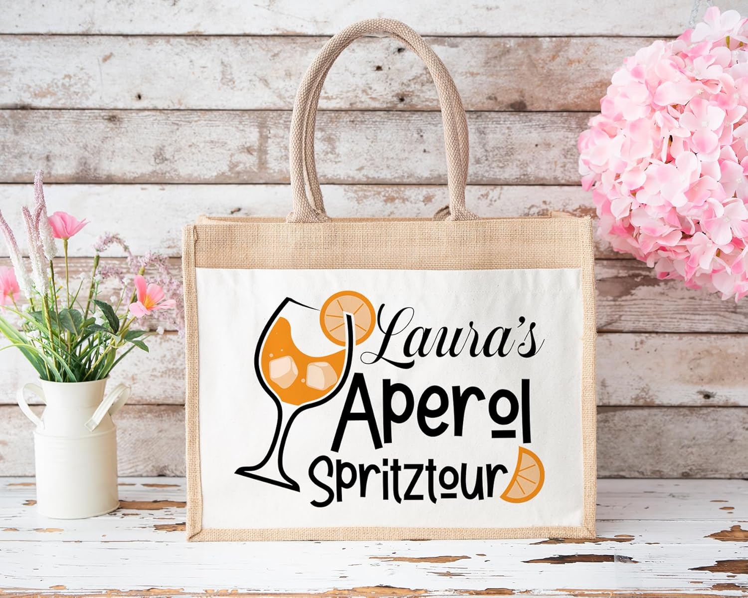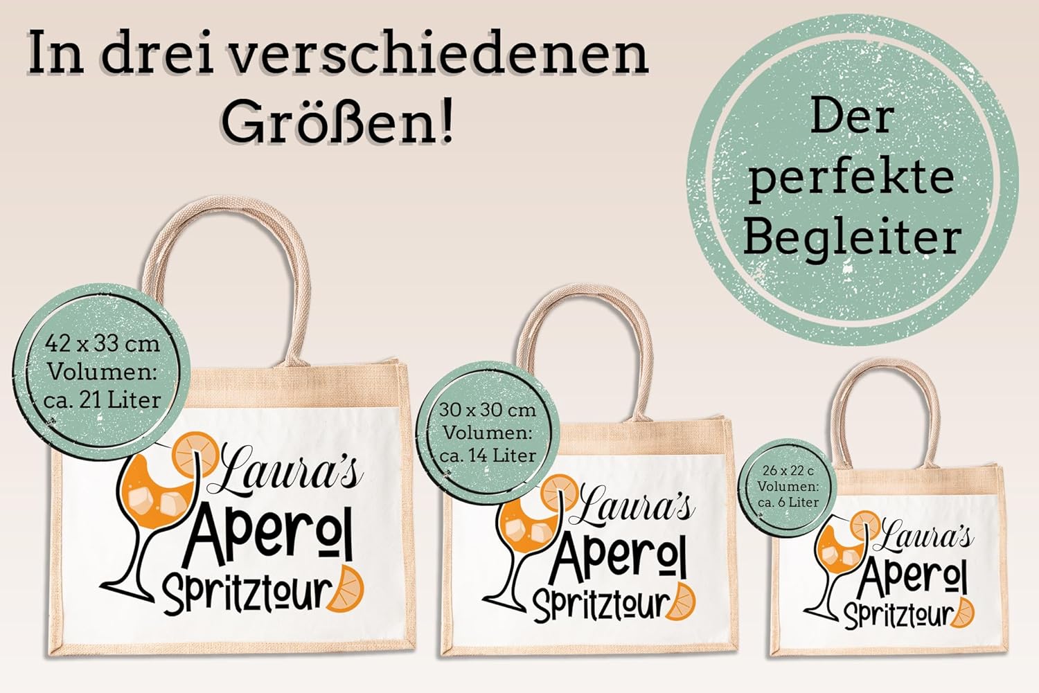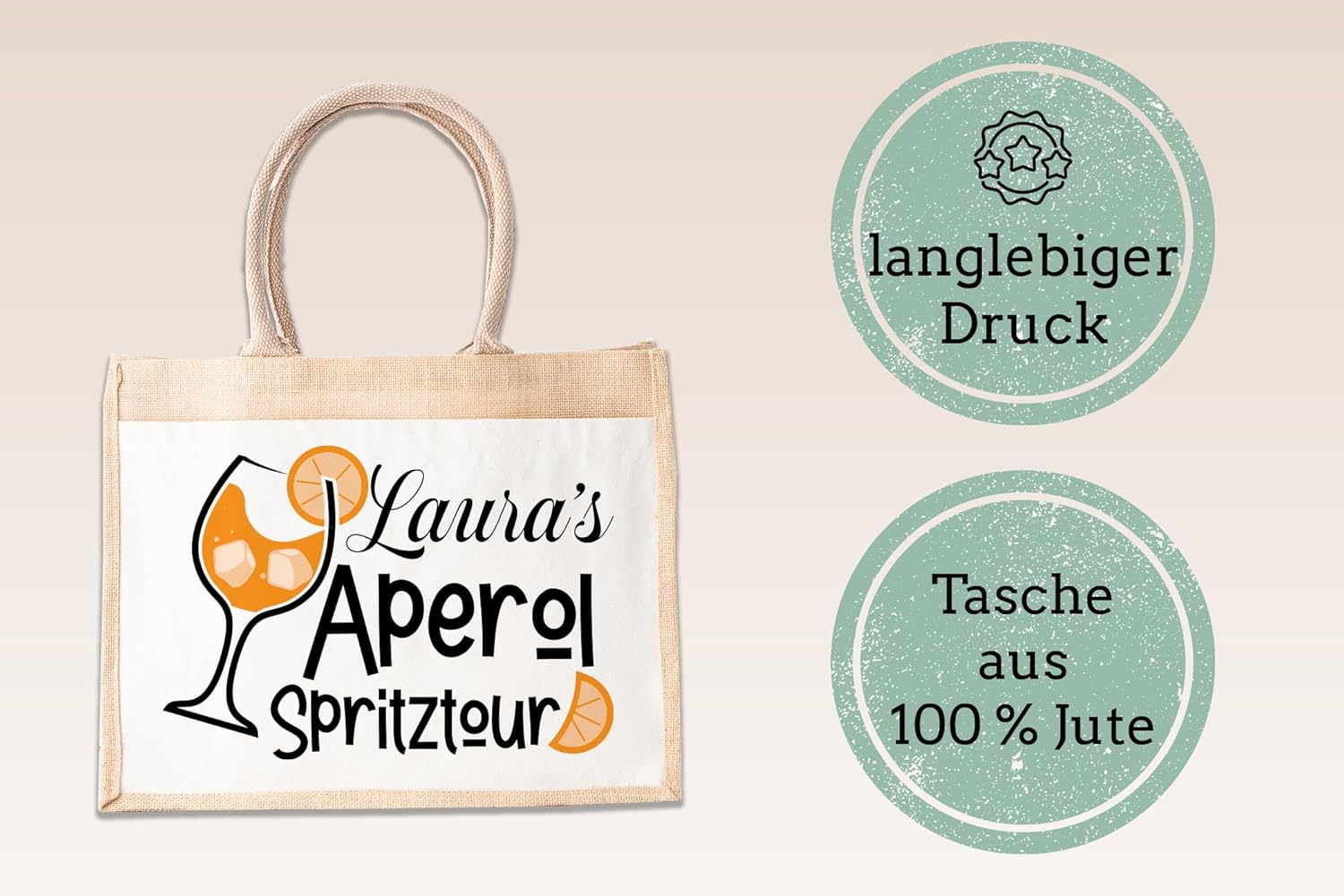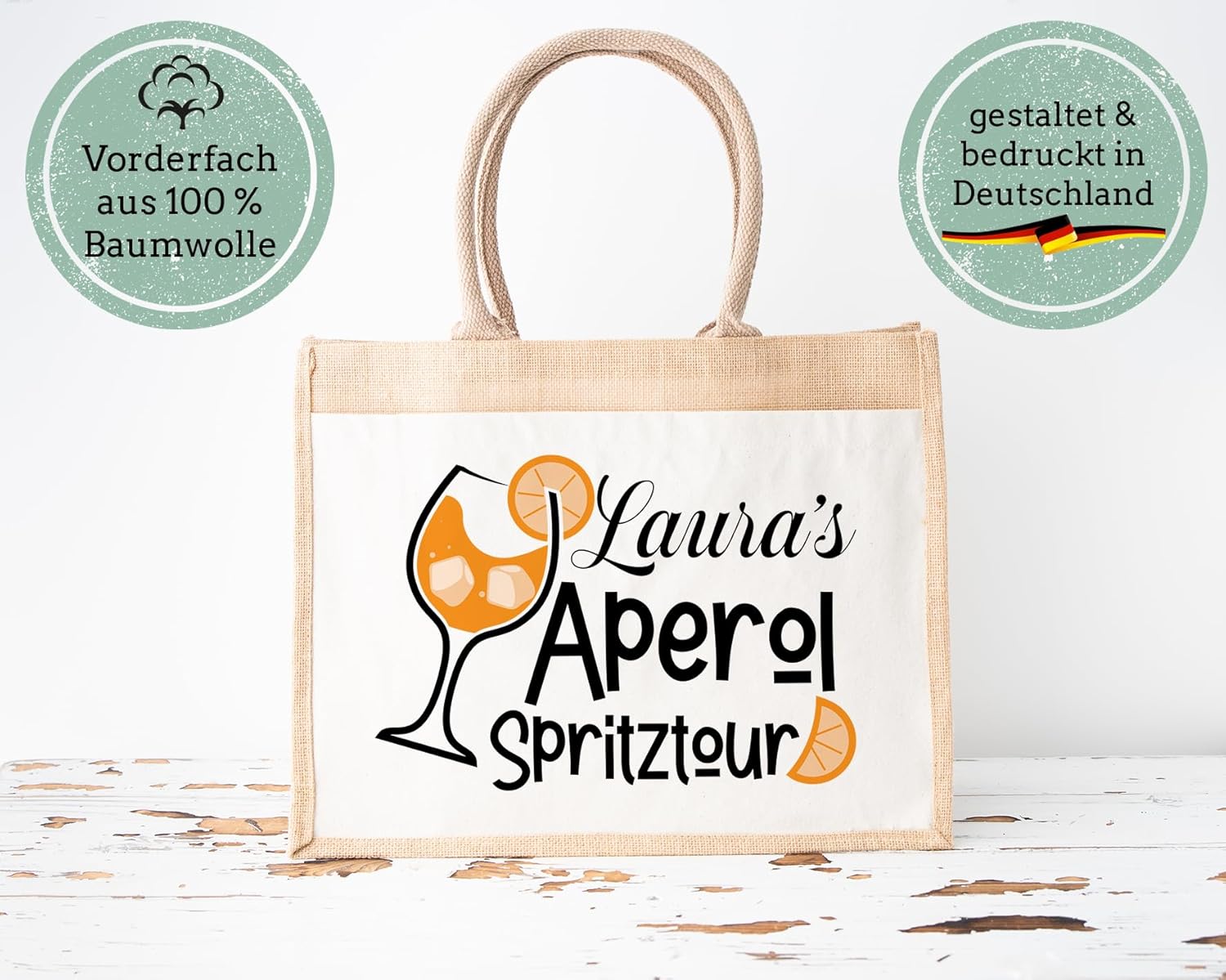 Regalo perfetto per gli appassionati di Aperol Spritz: questa borsa in iuta personalizzata è il regalo ideale per chi ama il proprio Aperol Spritz. Fornito con il nome che preferisci, diventa un regalo unico per gli amici o le amiche che amano la bevanda frizzante. Alta qualità e rispetto per l'ambiente: realizzata in resistente iuta e cotone, questa borsa non è solo estremamente robusta ma anche rispettosa dell'ambiente. Ideale per gli amanti dell'Aperol alla moda che apprezzano la qualità e la sostenibilità. Molto elegante e versatile: sia come borsa da spiaggia che per l'uso quotidiano, questa borsa in iuta attira davvero l'attenzione. Perfetto per ogni amante dell'aperitivo che vuole esprimere il proprio amore per la bevanda con un accessorio alla moda. IDEALE PER GLI ACCESSORI APEROL: questa borsa è abbastanza grande da contenere tutti gli ingredienti e gli accessori essenziali di Aperol Spritz: un fantastico set regalo per i fan di Aperol. Un accessorio pratico ma elegante per feste o picnic con Aperol. Regalo personale con il nome desiderato: Rendi il regalo ancora più speciale aggiungendo sul sacchetto di iuta il nome della persona che riceverà il regalo. Perfetto per le donne e le amiche che amano Aperol: un regalo unico, utile e chic.