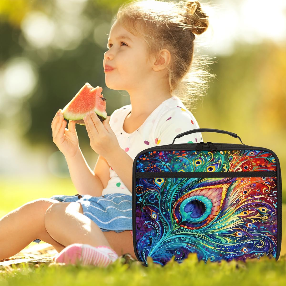 Borsa per il pranzo per bambini, etnica colorata, con piume di pavone, borsa per il pranzo per ragazzi e ragazze, riutilizzabile, isolata, bento, borsa tote per scuola, picnic, lavoro