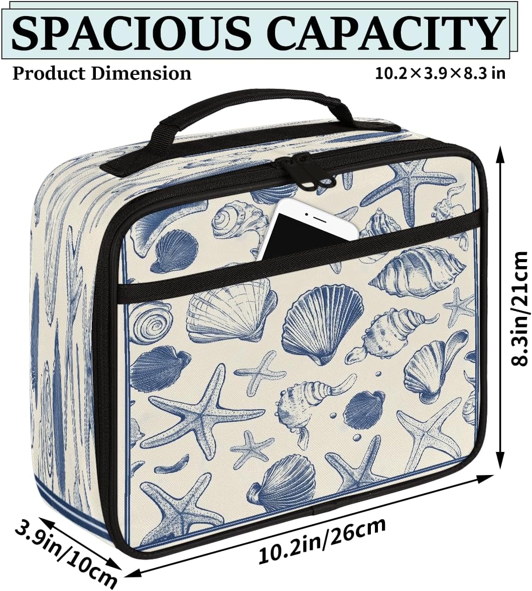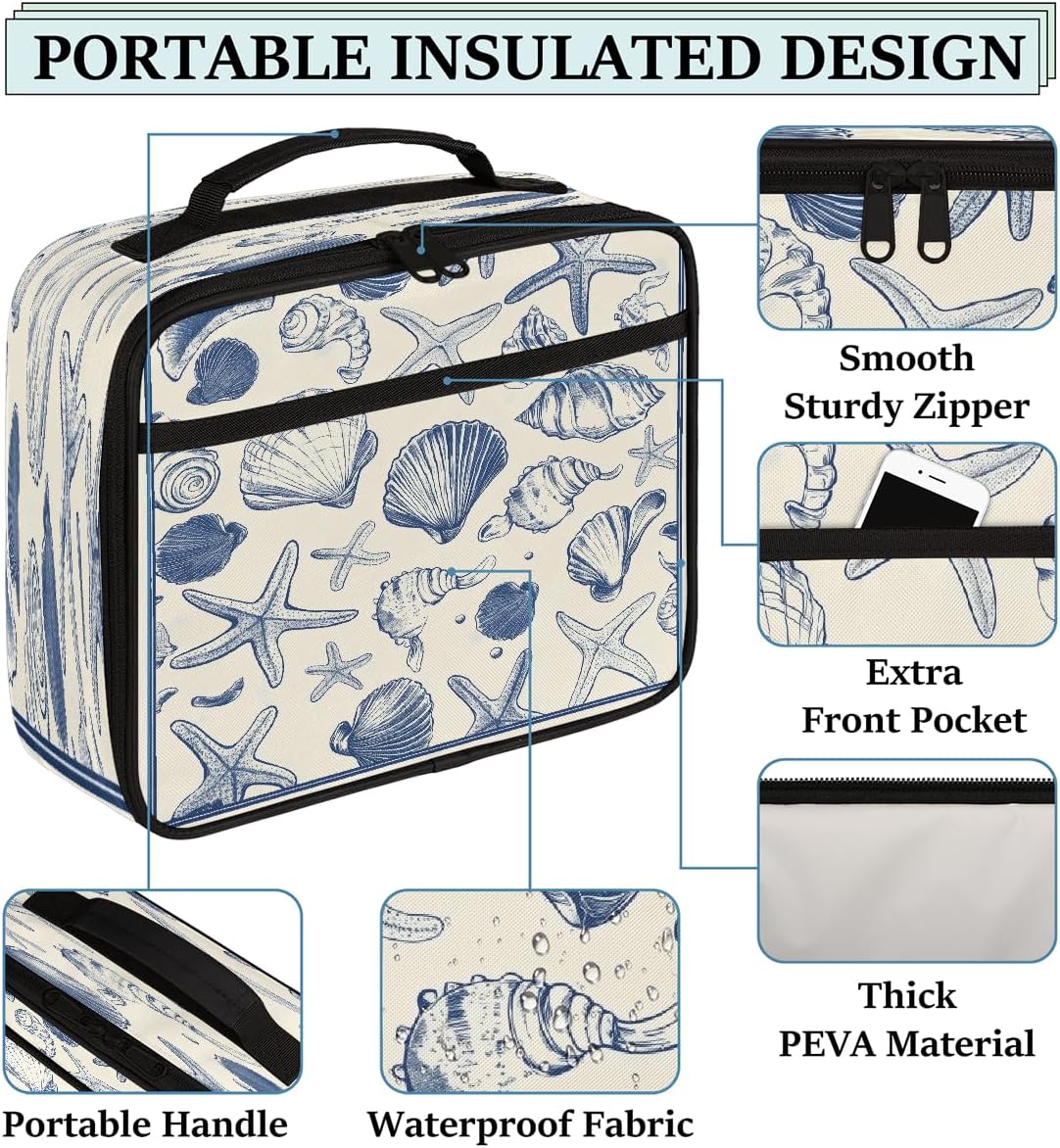 Borsa per il pranzo per bambini, motivo con conchiglie acquerellate e stelle marine, borsa per il pranzo per ragazzi e ragazze, riutilizzabile, isolata, bento, per scuola, picnic, lavoro