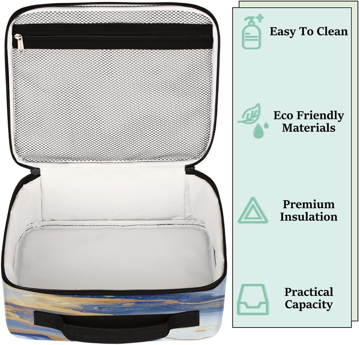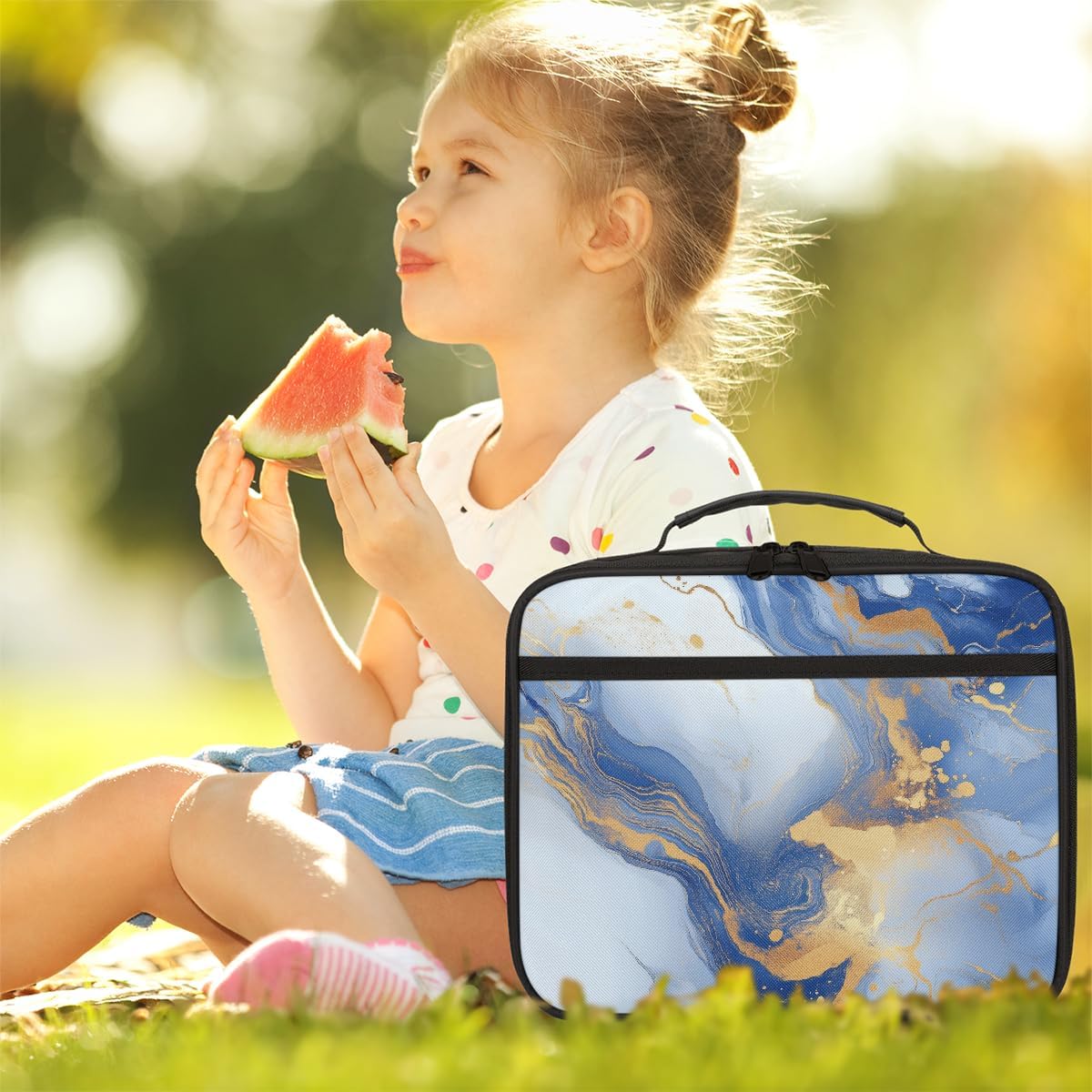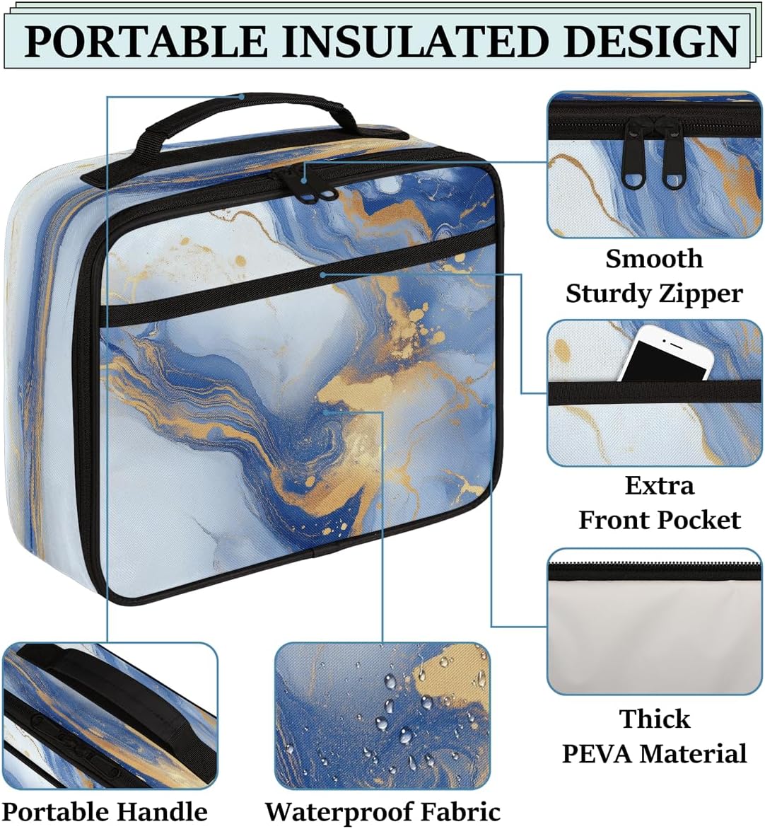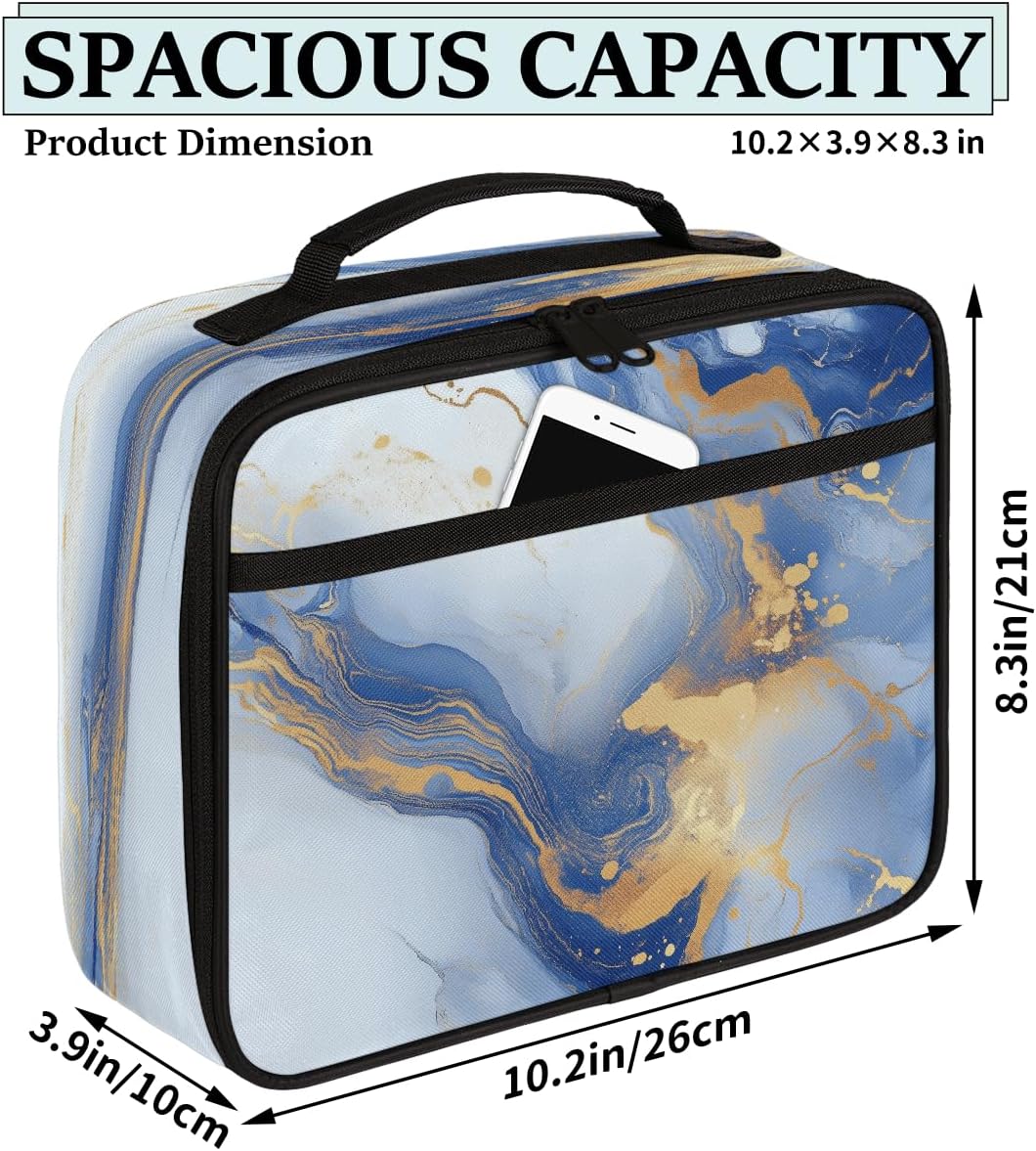 Borsa per il pranzo per bambini, motivo marmorizzato blu dorato, borsa per il pranzo per ragazzi e ragazze, riutilizzabile, isolata, bento, borsa tote per scuola, picnic, lavoro