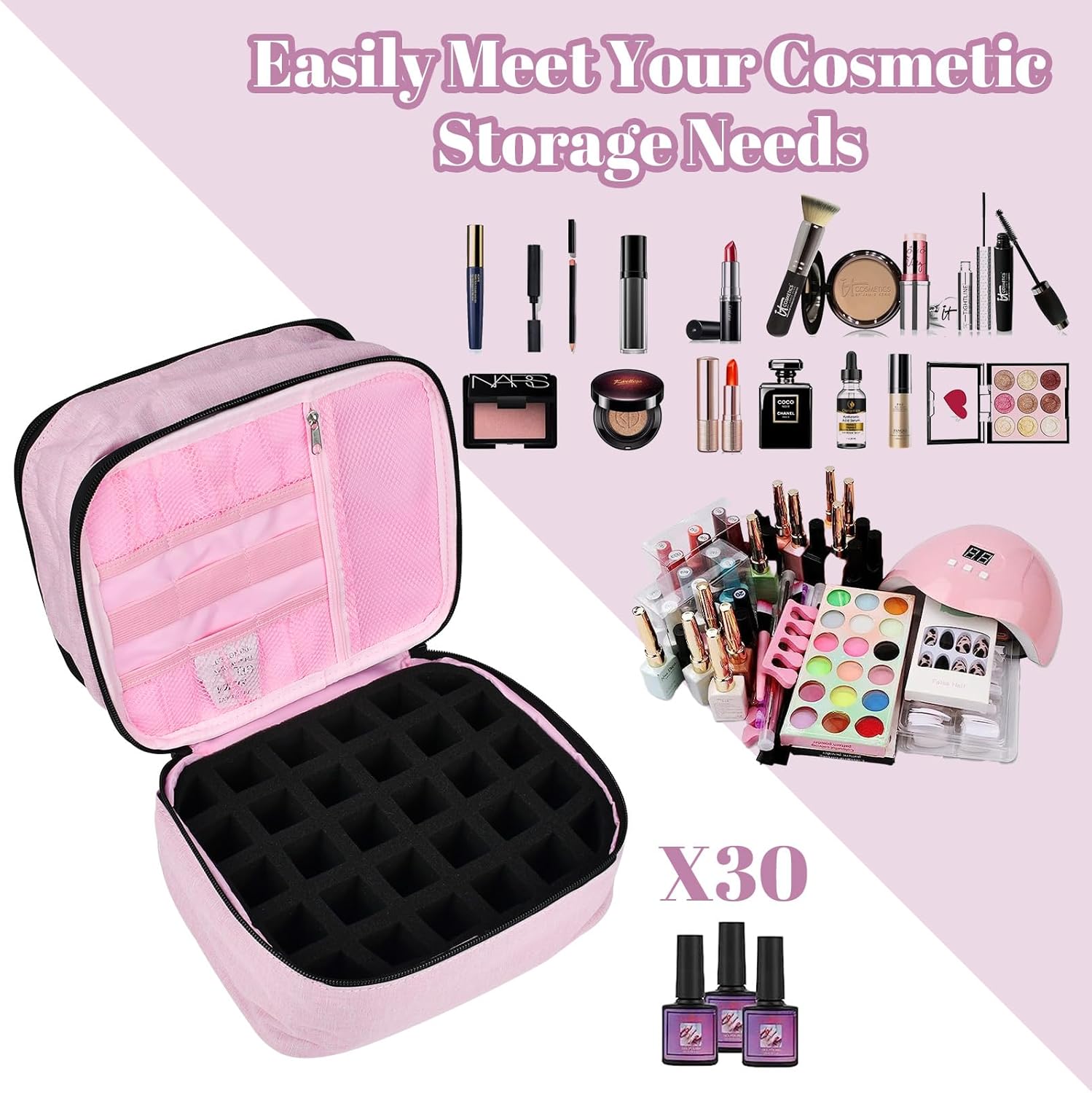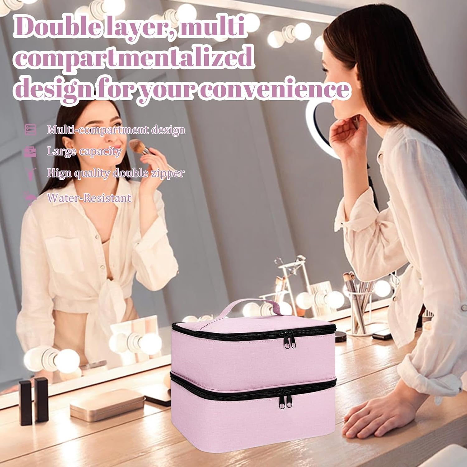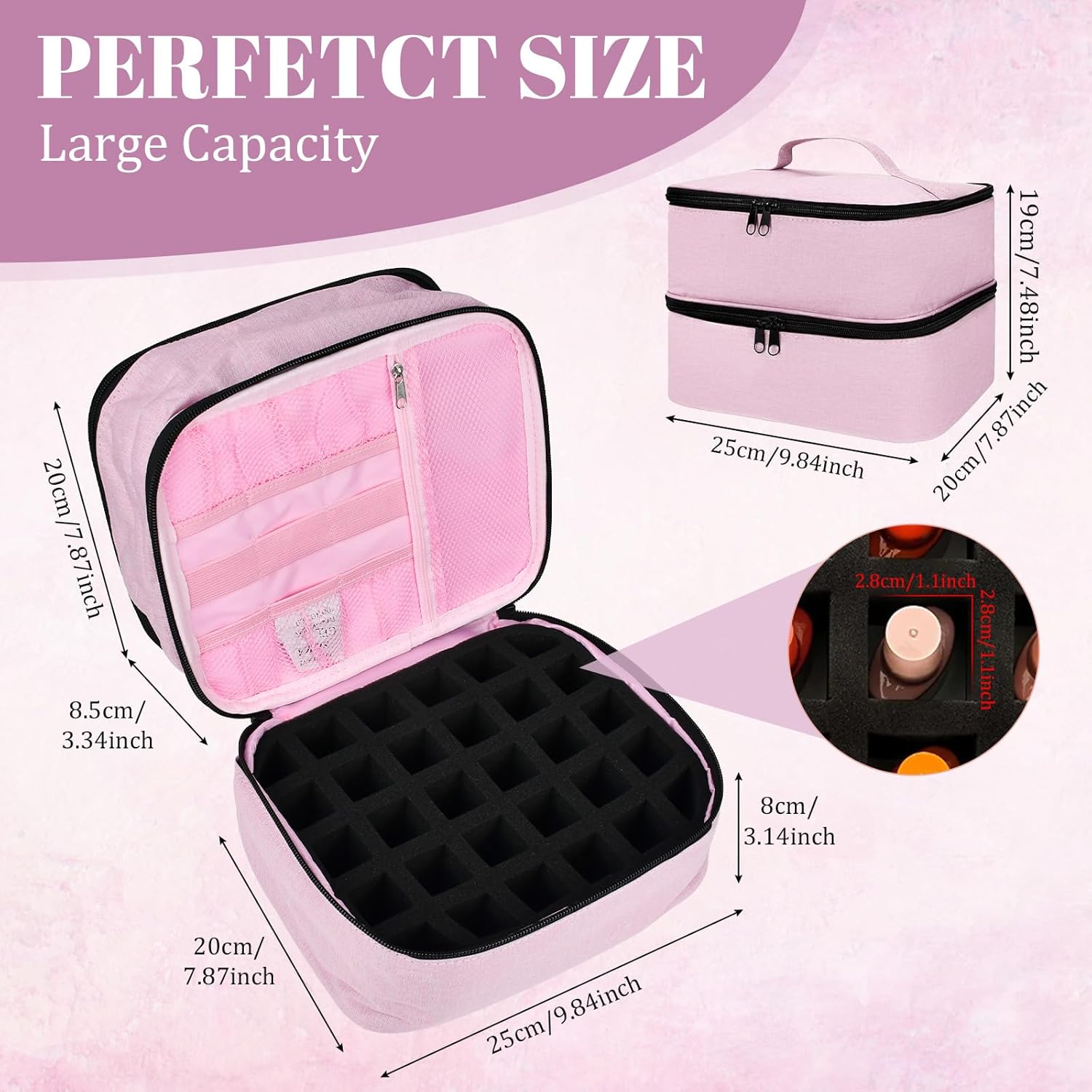 Design a doppio strato: Questa borsa per cosmetici a doppio strato ha due livelli, il livello superiore ha 2 tasche elastiche aperte, 1 tasca con zip e 1 tasca principale, 1 divisorio regolabile; il livello inferiore ha 6 tasche elastiche, 1 tasca con zip e un compartimento per smalto EVA estraibile, che può contenere fino a 30 flaconcini di smalto da 7,5 ml. Questa borsa organizer offre spazio sufficiente per i tuoi cosmetici. Grande capacità: Il beauty case dispone di diversi scomparti e sezioni. Puoi riporre non solo trucco, prodotti per la cura della pelle, ombretti e fondotinta, ma anche spazzole per unghie, solventi per unghie, lampade per unghie, oli essenziali, smalti, ecc. Non dovrai più preoccuparti che i tuoi cosmetici siano troppo disordinati per trovare ciò di cui hai bisogno. Questa borsa di stoccaggio rende la tua organizzazione cosmetica più comoda e ordinata. Materiale in nylon di alta qualità e impermeabile: questo beauty case è realizzato in nylon di alta qualità, che offre una buona durata, non si strappa facilmente, è impermeabile, robusto e resistente ai graffi. La doppia cerniera è molto liscia e non si arrugginisce facilmente, oltre a essere facile da pulire e mantenere. Non solo protegge i tuoi cosmetici, ma conferisce anche eleganza al tuo uso quotidiano. Design portatile: borsa per cosmetici dimensioni: 25*21*18CM, questa borsa per cosmetici a doppio strato con manico ha un design portatile, perfetto per viaggi e spostamenti. Grazie alla sua dimensione moderata e al suo peso leggero, si inserisce facilmente nella tua borsa o nella tua valigia. Che tu stia andando in palestra, per un viaggio d'affari o in vacanza, questa borsa per cosmetici è la soluzione perfetta per tenere il tuo trucco in ordine e a portata di mano. Borsa cosmetica multifunzionale e stilosa: Con il suo aspetto elegante e stiloso, può essere utilizzata come borsa per il trucco, organizzatore da viaggio, borsa cosmetica, ecc. Perfetta per i viaggi brevi o per l'uso quotidiano a casa. Il regalo migliore per donne e ragazze per la Festa della Mamma, la Giornata Internazionale della Donna, il Natale, i compleanni, gli anniversari e San Valentino.