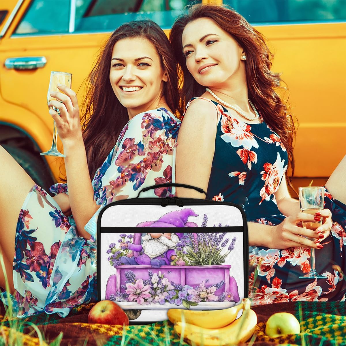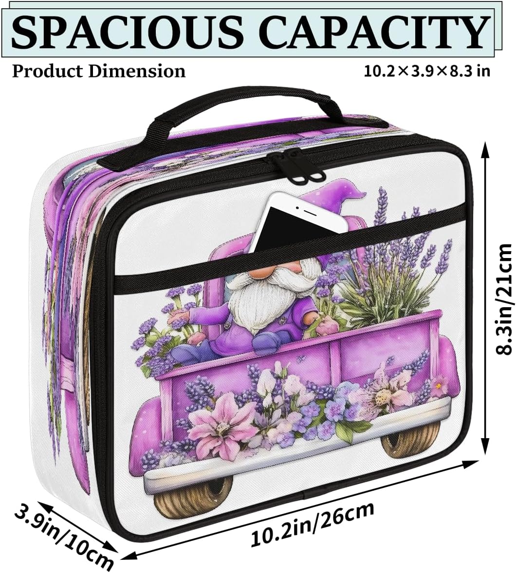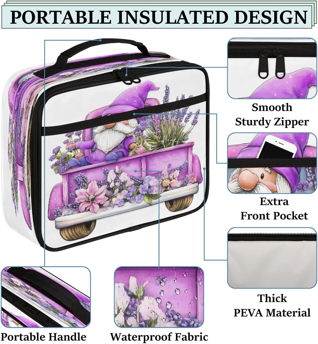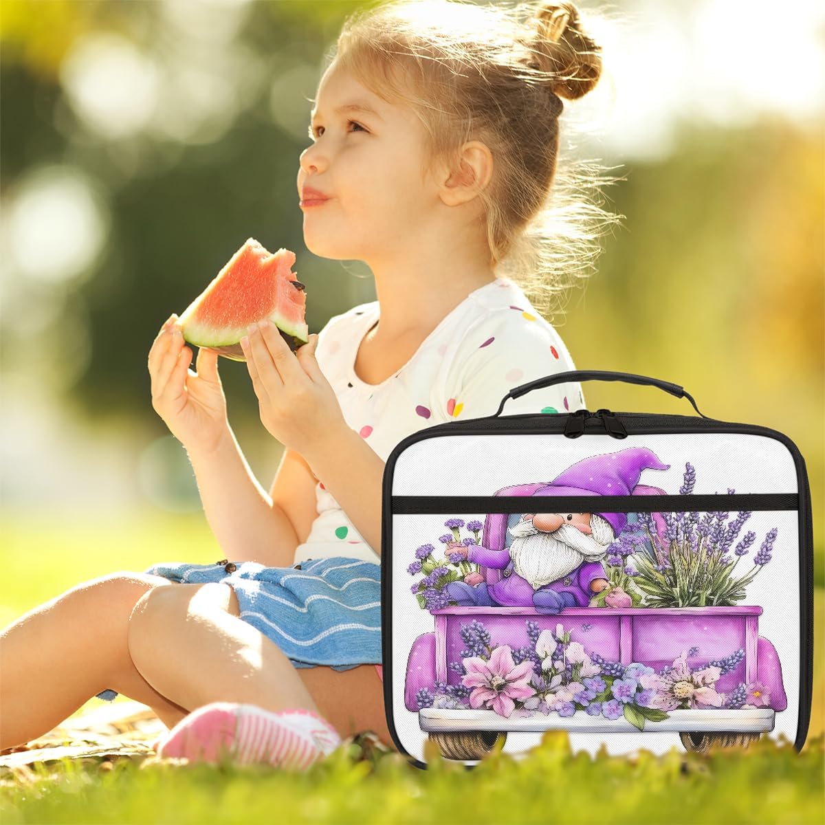 Borsa portapranzo per bambini con gnomo viola e lavanda, borsa per il pranzo per ragazzi e ragazze, riutilizzabile, isolata, bento, per scuola, picnic, lavoro