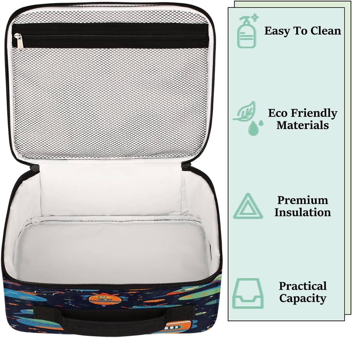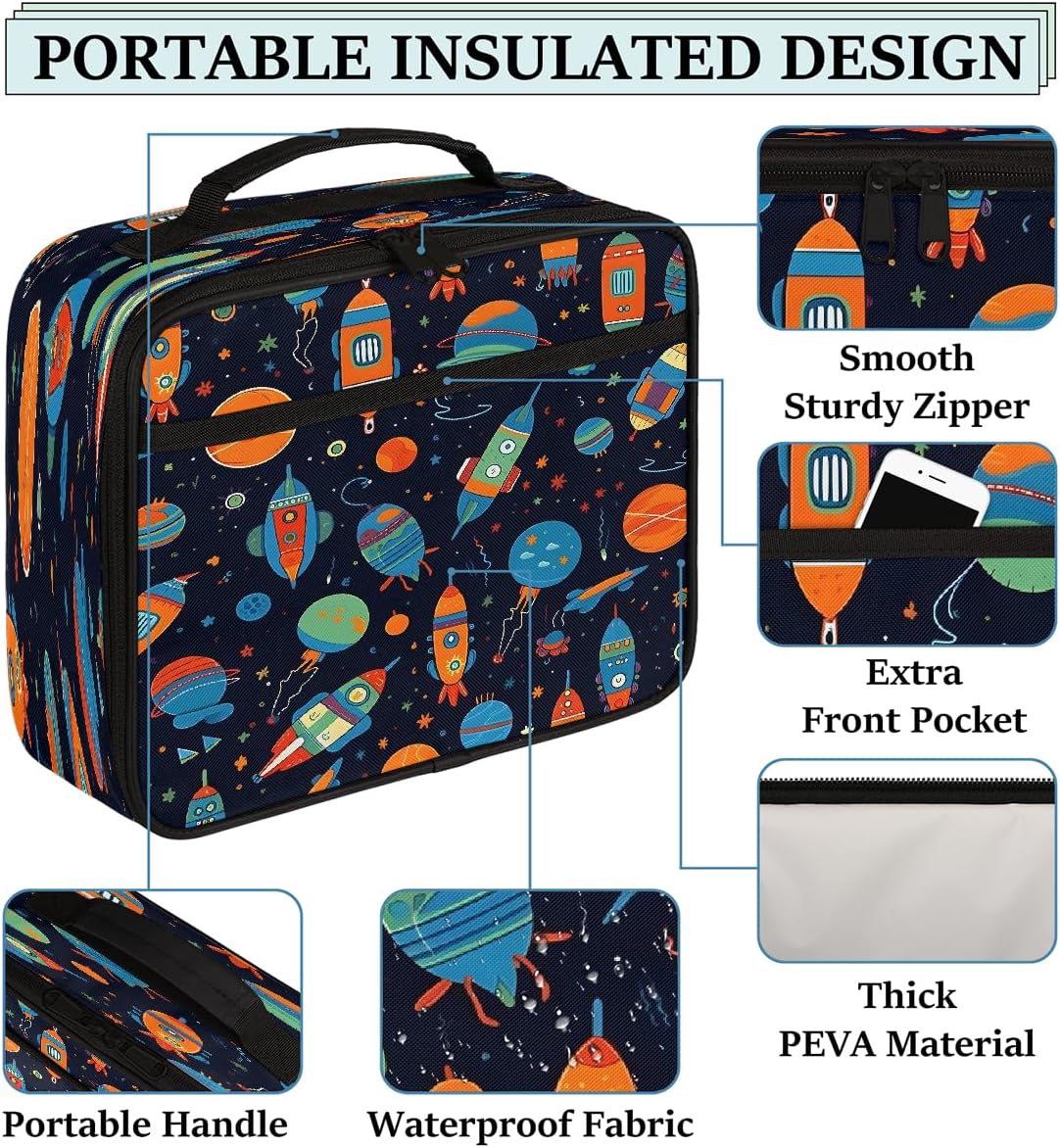 Borsa portapranzo per bambini con razzi spaziali in stile cartone animato, borsa per il pranzo per ragazzi e ragazze, riutilizzabile, isolata, bento, per scuola, picnic, lavoro