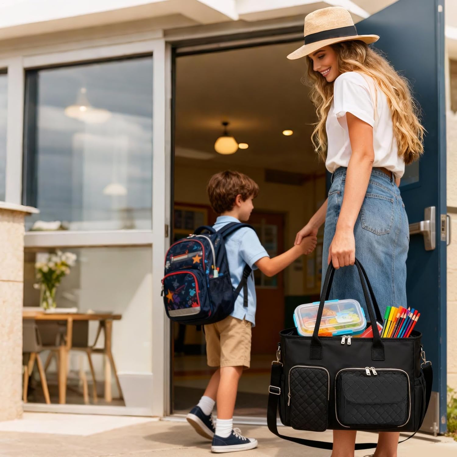 Stabilità Autoportante: Con un esterno in poliestere resistente all'usura che mantiene la struttura, questa borsa pranzo offre protezione da schizzi e abrasioni e un design eretto autoportante, assicurando un posizionamento facile su scrivanie o banconi da cucina. Il tessuto impermeabile mantiene i contenuti al sicuro e organizzati tutto il giorno, per un utilizzo pratico in ambienti domestici e professionali. Opzioni di Trasporto Versatili: Dotata di un cinturino regolabile, la borsa pranzo per donna può essere indossata a tracolla o a spalla, offrendo una convenienza adattabile per professionisti o studenti con stile di vita dinamico. I multiple scomparti interni facilitano l'organizzazione degli articoli, rendendo la borsa pratica e onale per l'uso quotidiano, con facile accesso a tutti gli oggetti in modo ordinato e efficiente. Resistente e Pratico: Questa borsa pranzo per donne unisce una costruzione e durevole a un design professionale ed elegante, assicurando che i tuoi effetti personali rimangano protetti da spruzzi d'acqua e pioggerella durante gli spostamenti quotidiani come il pendolarismo o andando a scuola. Ideale per insegnanti, professionisti e chiunque cerchi una soluzione pratica e affidabile per trasportare i propri oggetti, questa borsa offre protezione e stile per un uso intenso, combinando Soluzione Borsa Professionale: La borsa pranzo offre un design rifinito ma pratico, unendo la protezione isolante per i pasti con i benefici organizzativi. Assicura una transizione senza interruzioni dagli ambienti di commute a quelli di lavoro, senza il fastidio di cambiare borsa. Ideale per professionisti, combina onalità e stile in una soluzione efficiente che preserva la freschezza del cibo e migliora la gestione degli oggetti durante gli spostamenti quotidiani. Supporto per Pendolari: Progettata per donne impegnate in movimento, questa borsa con scomparto pranzo assicura che i pasti rimangano freschi e accessibili, fornendo supporto affidabile durante i frenetici spostamenti mentre si integra perfettamente in stile di vita organizzato, ideale per regalare durante feste o occasioni speciali.