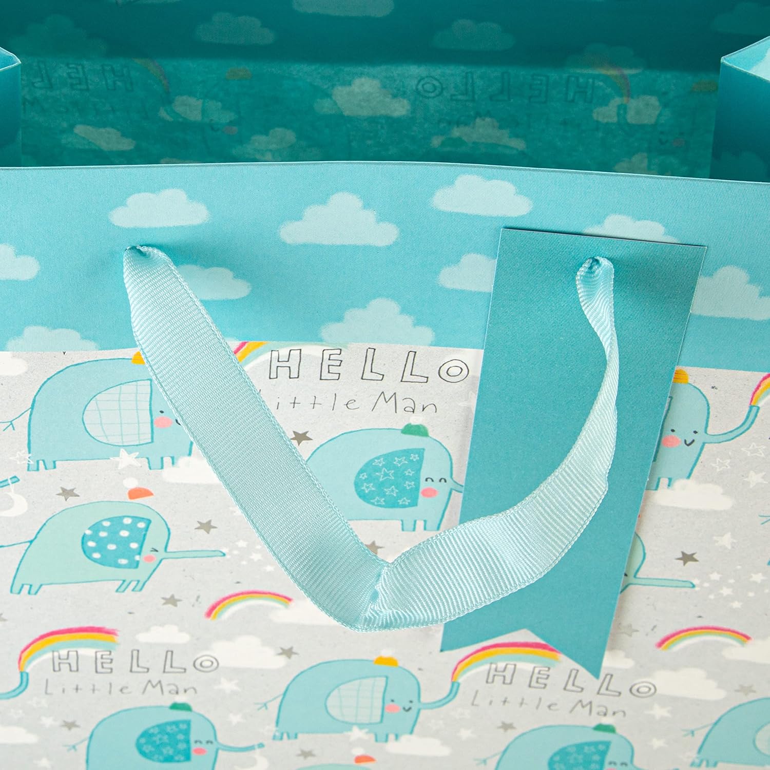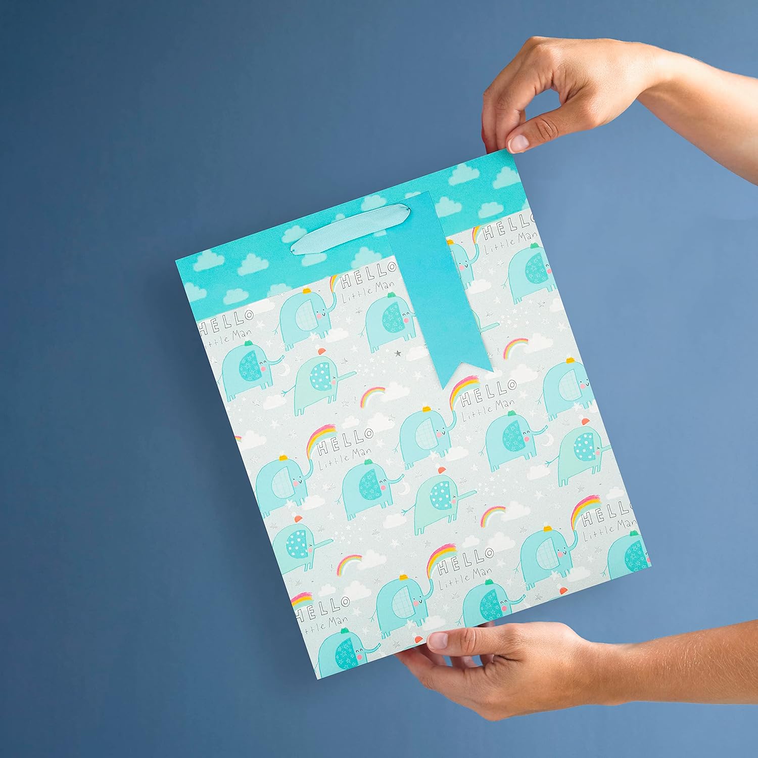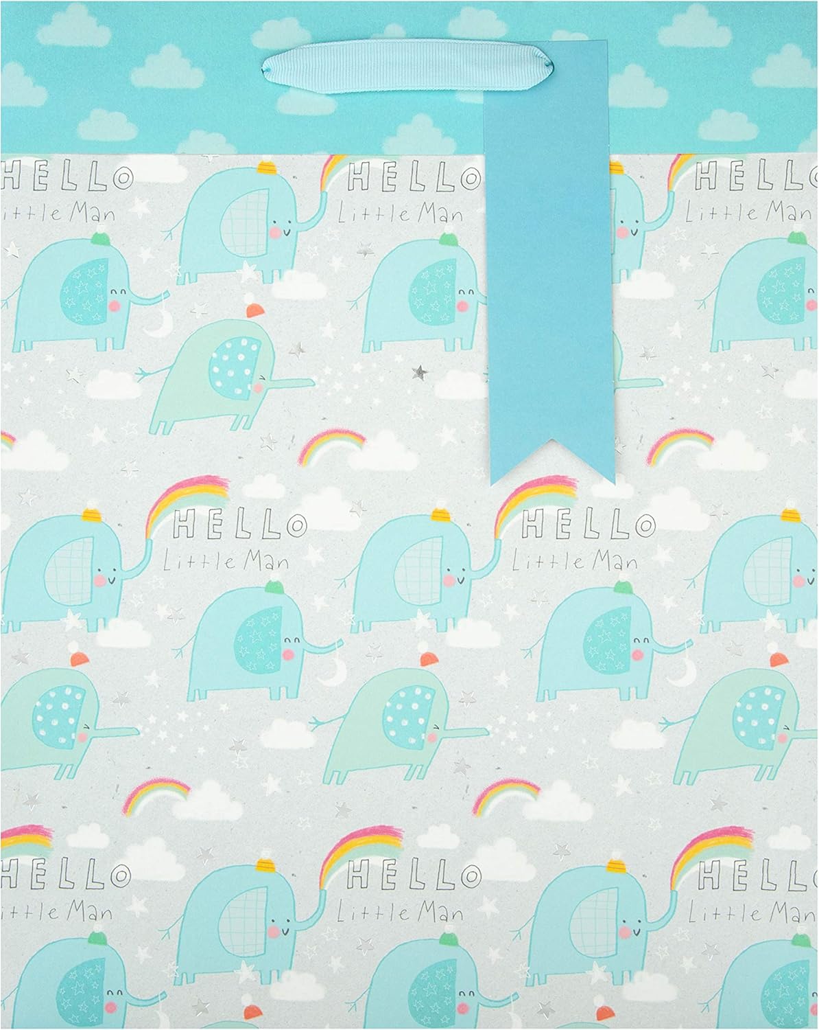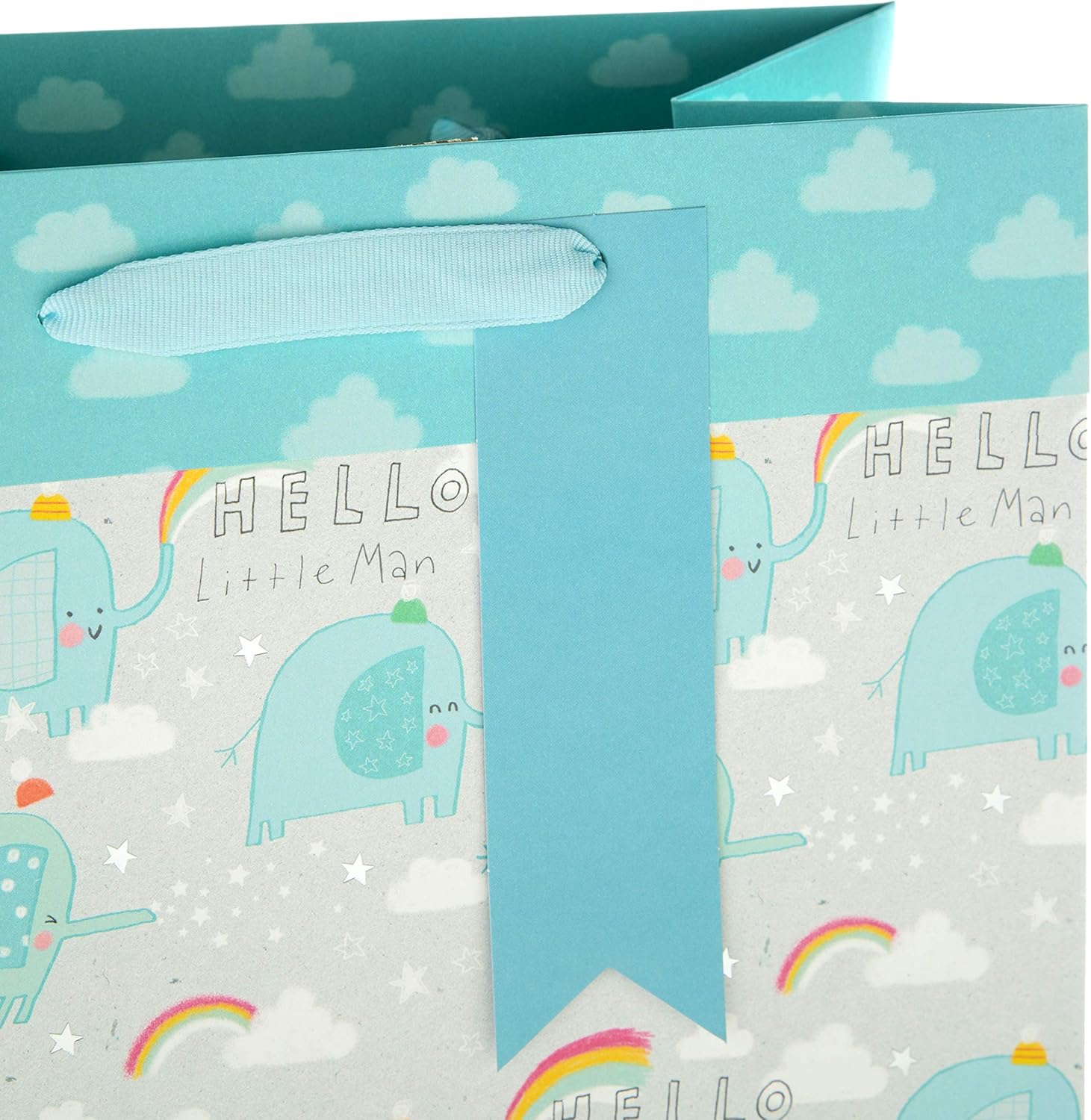 Dai il benvenuto a un ometto speciale con stile con alcuni regali carini in questa bellissima borsa di Hallmark! La lavorazione di alta qualità, il grande formato e l'orientamento verticale consentono di offrire una varietà di regali come giocattoli, libri, vestiti e altro ancora. Stampato su misto carta certificata FSC con dettagli in lamina d'argento, manici in nastro di gros grain azzurro e etichetta regalo fustellata abbinata. Sulla borsa c'è scritto in inglese: Hello Little Man.