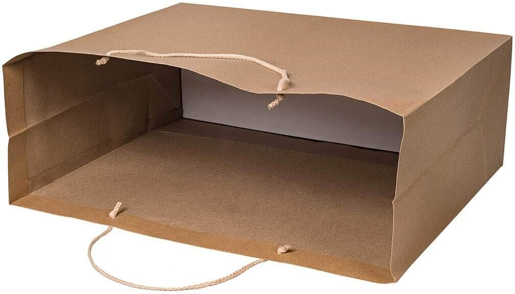 Queste borse per la spesa di alta qualità in carta kraft sono prive di plastica e completamente riciclabili, compostabili e biodegradabili dopo l'uso. Dimensioni (senza manico): 56 x 45 x 20 cm - Materiale: carta Kraft 160 g/m² - Manico in cordoncino di cotone Le nostre borse con manici in cotone sono stabili, di alta qualità e durevoli. Possono essere utilizzati più volte come sacchetto regalo e sono sostenibili da utilizzare. Un ulteriore rinforzo sul fondo del sacchetto di carta garantisce elevata capacità di carico e stabilità. Utilizza la borsa come borsa per bottiglie, borsa regalo, per fiere, conferenze, come borsa per la spesa per moda, scarpe, vino e liquori