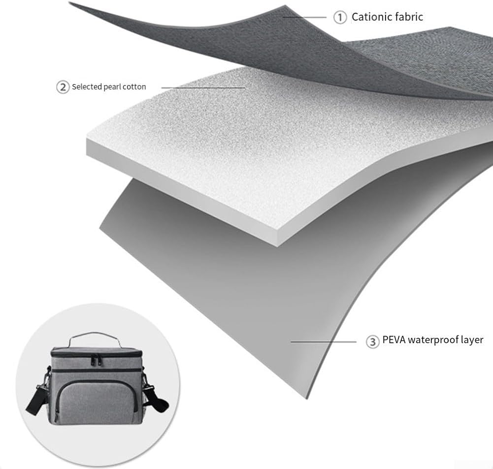 Protezione a prova di perdite: costruito con spessa fodera in PEVA e cuciture saldate a caldo per evitare perdite; facile da pulire pulendo l'interno dopo ogni utilizzo. Ampia capacità di archiviazione: con dimensioni di 20,3 x 20,8 x 21,8 cm, questa borsa offre ampio spazio tra cui uno scomparto principale per cibo/bevande e tasche multiple per l'organizzazione di oggetti più piccoli. [Comode opzioni di trasporto] Dispone sia di un manico robusto che di una tracolla regolabile che consente un comodo trasporto a mano o attaccamento ad altre borse. Alla moda e funzionale: questa borsa per il pranzo leggera e riutilizzabile è adatta sia per uomini che per donne; funge da accessorio essenziale sia che tu stia andando al lavoro o ti godi un picnic.