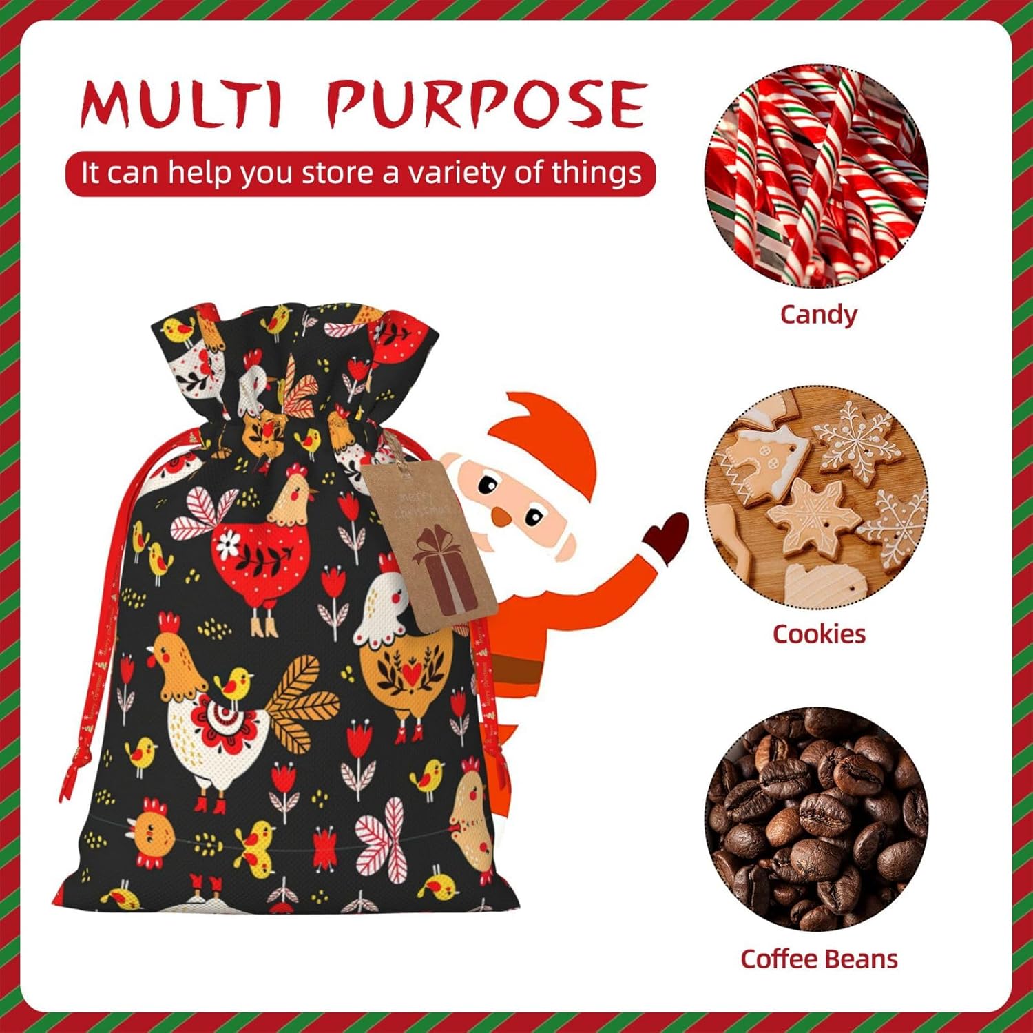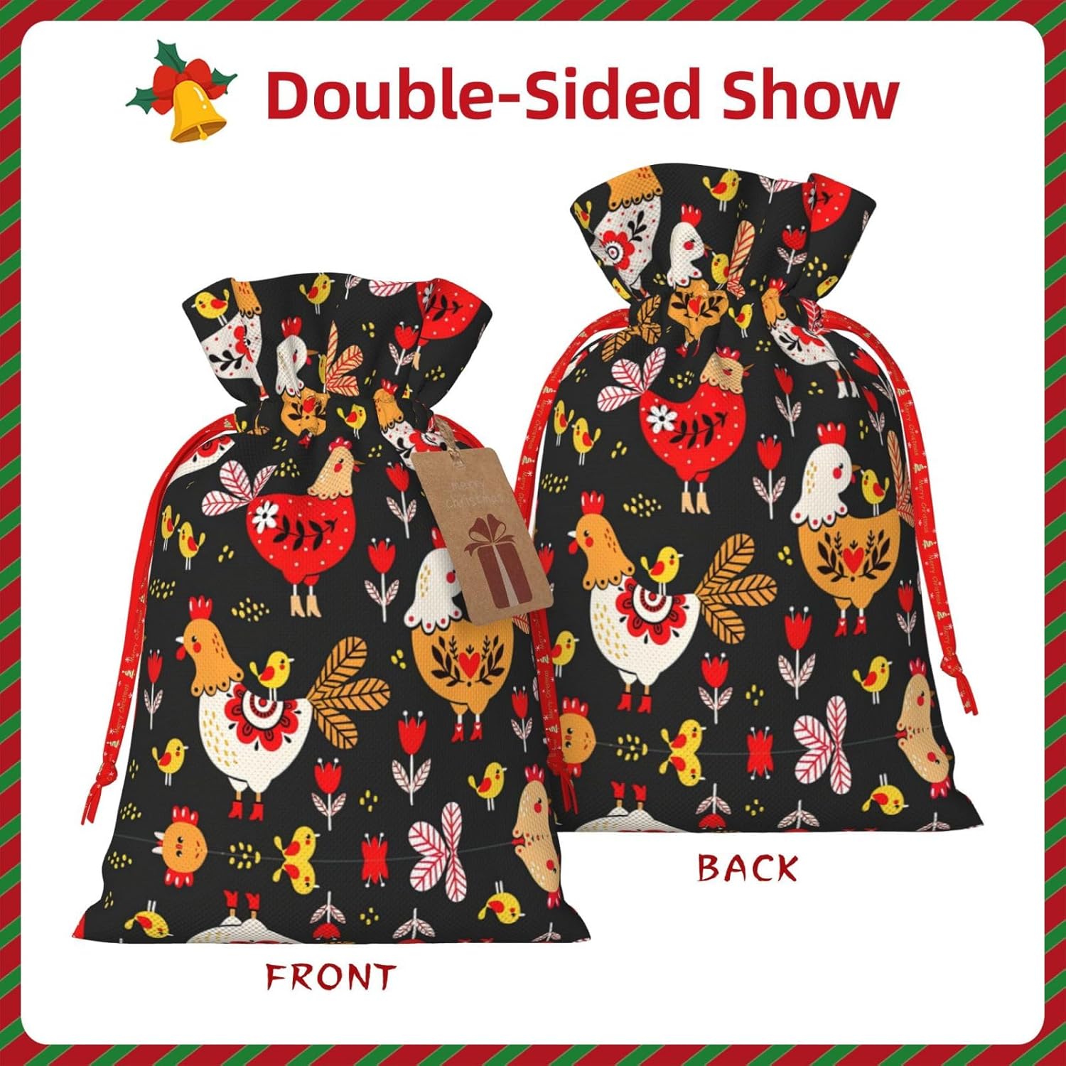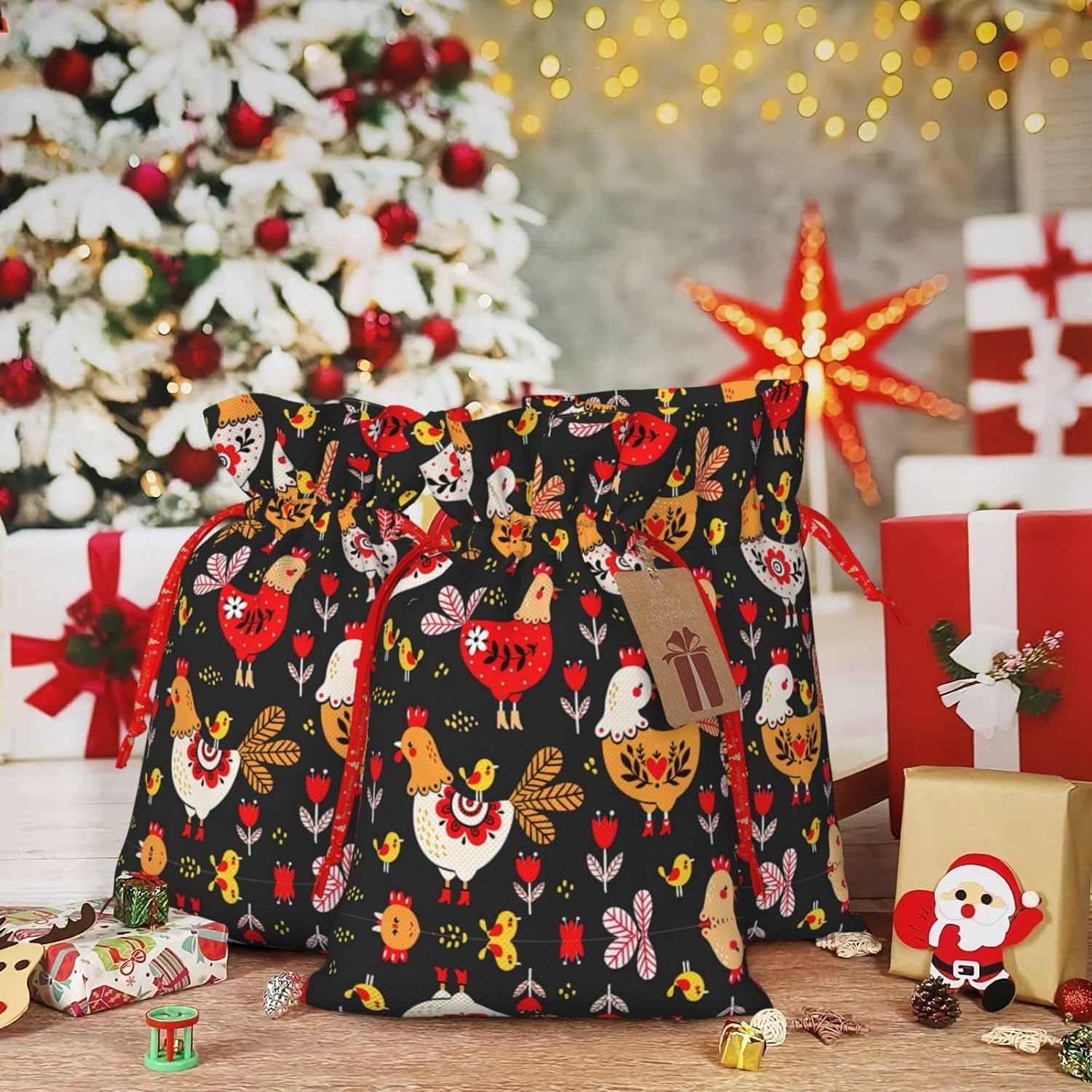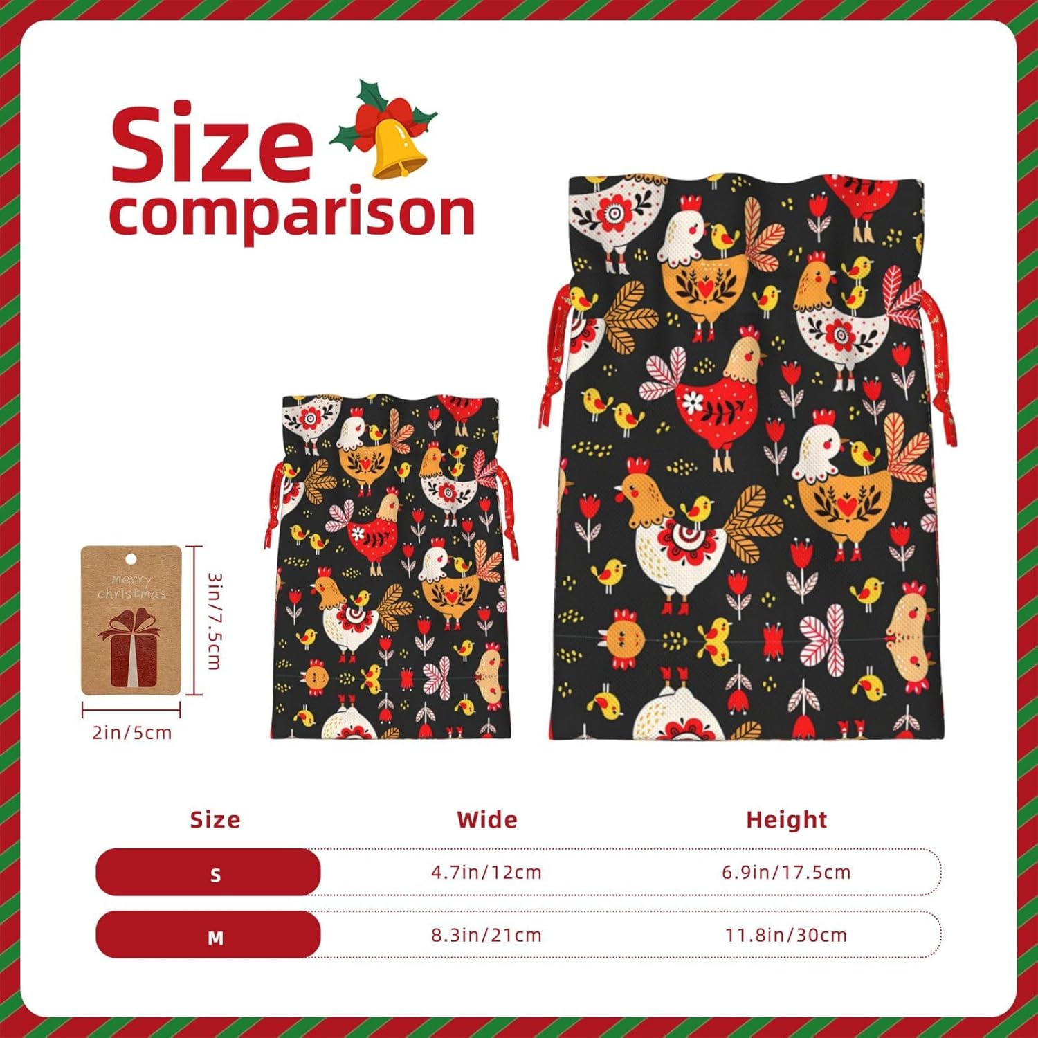 BORSE REGALO DI ALTO VALORE: la graziosa borsa per galline gallo è dotata di sacchetti regalo con cordoncini colorati ed etichette. I sacchetti regalo sono aggiornati con un design con chiusura a coulisse, sacchetti regalo realizzati in poliestere, resistenti e riutilizzabili. Non si strappano come la carta, ottimi per incartare i regali. 10 secondi per incartare un regalo: il simpatico sacchetto gallo galline per confezionare facilmente i regali, è facile da usare, basta inserire il regalo nei sacchetti, far scorrere l'etichetta regalo attraverso il nastro, tirare il nastro, annodare un fiocco e il gioco è fatto. Puoi evitare il fastidio associato a carta da imballaggio, forbici, nastro adesivo e nastro, risparmiare tempo e molto conveniente. Dimensioni del sacchetto regalo: i sacchetti regalo in 2 dimensioni possono soddisfare le preferenze di diverse persone e sono sufficienti per l'uso quotidiano e la festa di Natale. La S misura 12 x 17,5 cm e la M misura 12 x 30 cm. Sacchetti regalo in formati assortiti sfusi, perfetti per confezionare regali di diverse dimensioni. REGALO NEL REGALO: questi adorabili sacchetti regalo con gallo possono essere riutilizzati molte volte. Un set di sacchetti regalo riutilizzabili sarà un'aggiunta meravigliosa a qualsiasi regalo e migliorerà l'esperienza complessiva del regalo. Inoltre, abbiamo rinforzato il fondo per una maggiore stabilità e una struttura robusta con carichi pesanti. Non facile da rompere per un uso durevole e duraturo. Sacchetti regalo multifunzionali: questi graziosi sacchetti a forma di gallo possono essere utilizzati per conservare regali di Natale, giocattoli, bambole, cappelli natalizi, caramelle e regali durante una festa di Natale. Conservare i regali in questa borsa darà ai bambini più sorprese perché non sanno cosa c'è dentro.