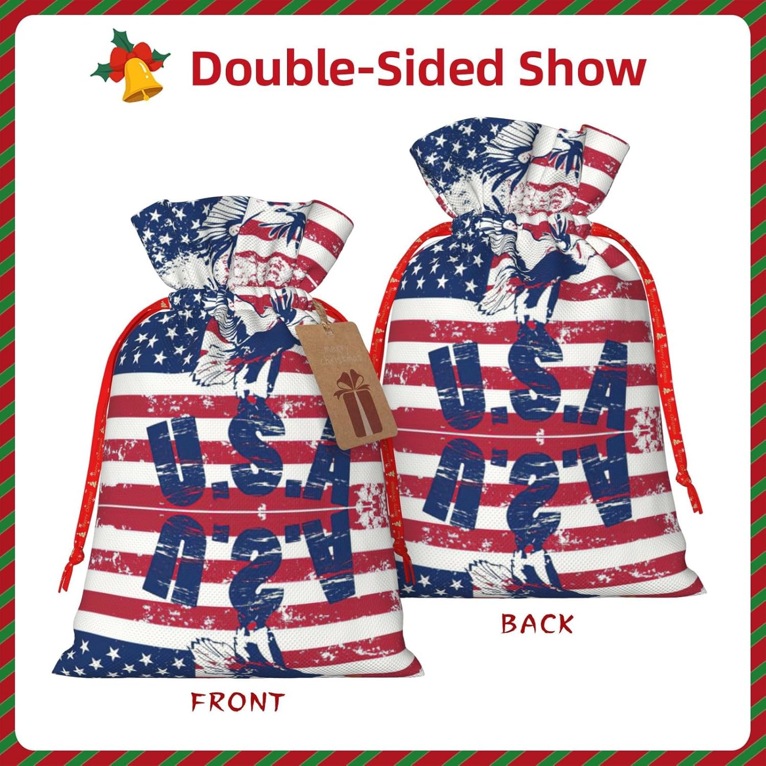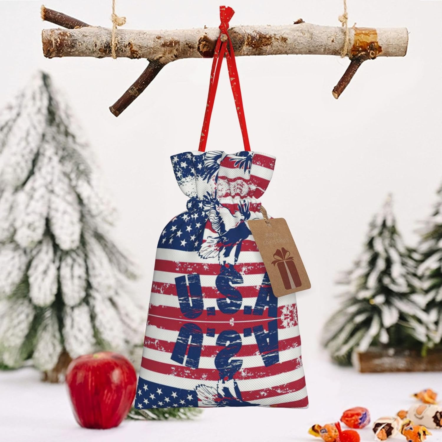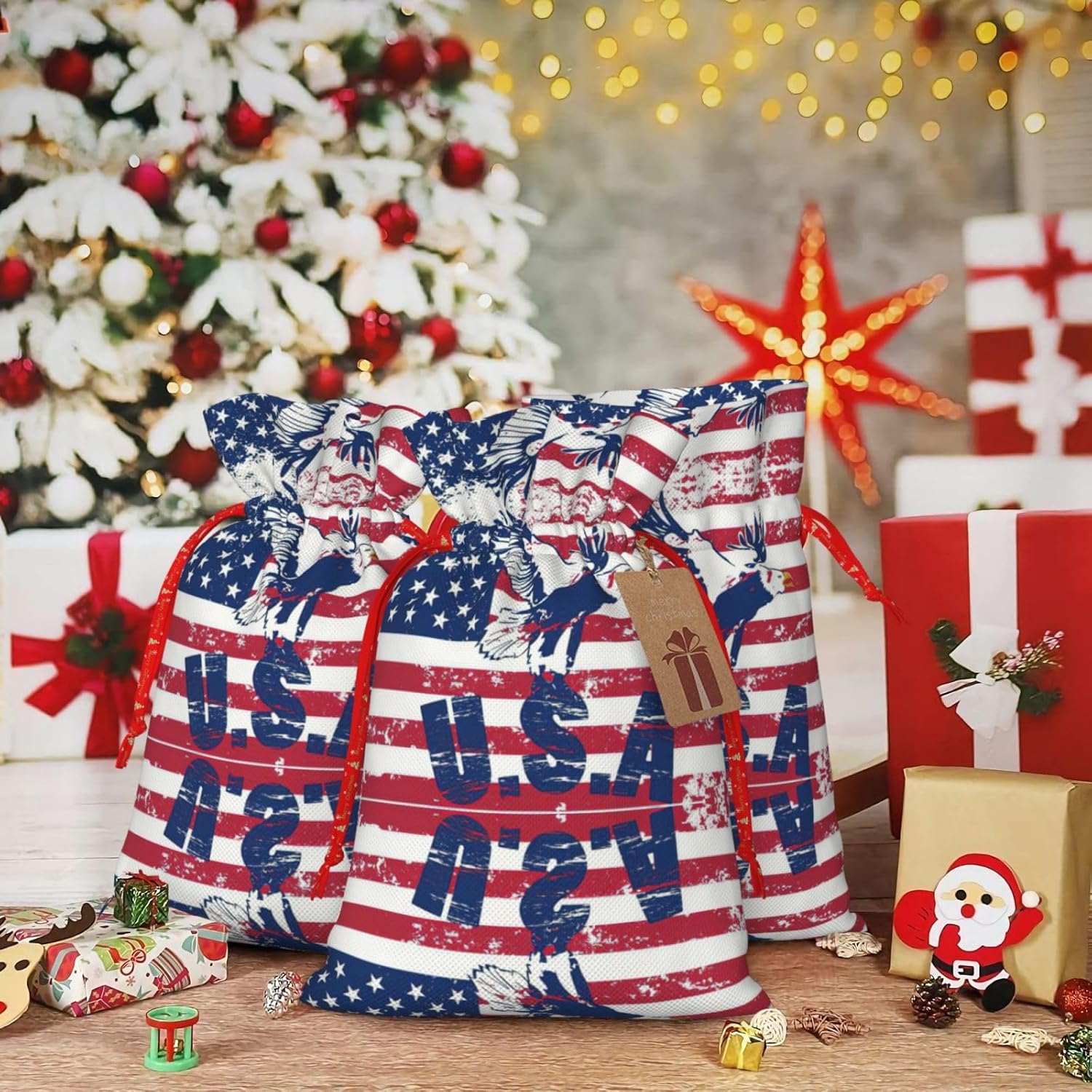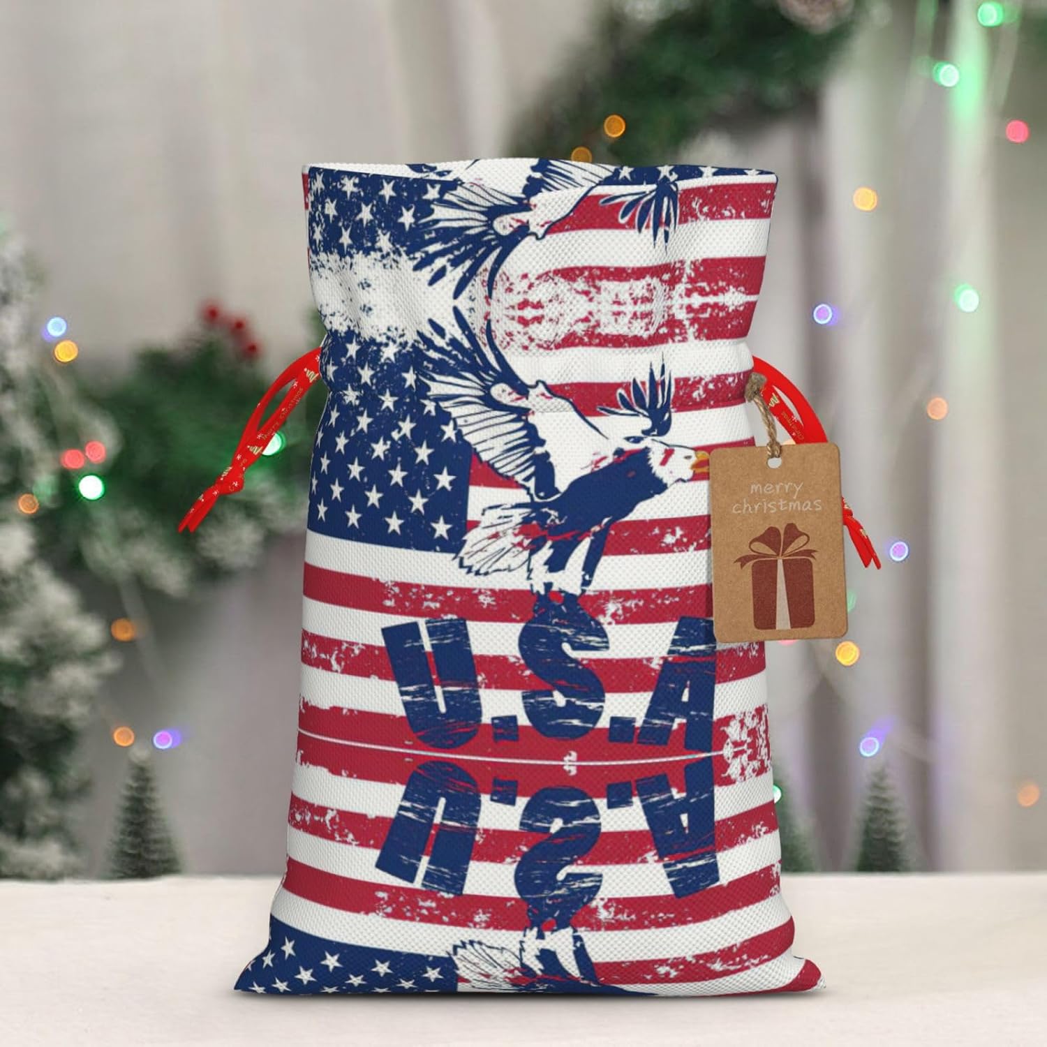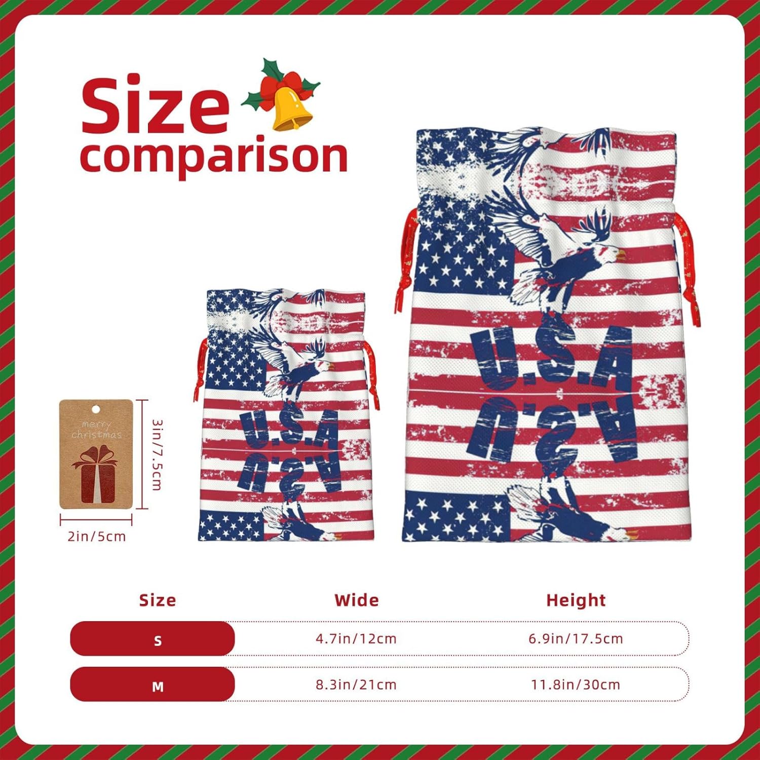 BORSE REGALO DI ALTO VALORE: la bandiera nazionale americana con borsa con aquila presenta sacchetti regalo con cordoncini colorati ed etichette. I sacchetti regalo sono aggiornati con un design con chiusura a coulisse, sacchetti regalo realizzati in poliestere, resistenti e riutilizzabili. Non si strappano come la carta, ottimi per incartare i regali. 10 secondi per incartare un regalo: la bandiera nazionale americana con sacchetto con l'aquila per confezionare facilmente i regali, è facile da usare, basta inserire il regalo nei sacchetti, far scorrere l'etichetta regalo attraverso il nastro, tirare il nastro, annodare un fiocco e il gioco è fatto. Puoi evitare il fastidio associato a carta da imballaggio, forbici, nastro adesivo e nastro, risparmiare tempo e molto conveniente. Dimensioni del sacchetto regalo: i sacchetti regalo in 2 dimensioni possono soddisfare le preferenze di diverse persone e sono sufficienti per l'uso quotidiano e la festa di Natale. La S misura 12 x 17,5 cm e la M misura 12 x 30 cm. Sacchetti regalo in formati assortiti sfusi, perfetti per confezionare regali di diverse dimensioni. REGALO NEL REGALO: questi sacchetti regalo con bandiera nazionale americana con aquila possono essere riutilizzati molte volte. Un set di sacchetti regalo riutilizzabili sarà un'aggiunta meravigliosa a qualsiasi regalo e migliorerà l'esperienza complessiva del regalo. Inoltre, abbiamo rinforzato il fondo per una maggiore stabilità e una struttura robusta con carichi pesanti. Non facile da rompere per un uso durevole e duraturo. Sacchetti regalo multifunzionali: questi sacchetti regalo natalizi con bandiera nazionale americana con sacchetti con aquila possono essere utilizzati per conservare regali di Natale, giocattoli, bambole, cappelli natalizi, caramelle e regali durante una festa di Natale. Conservare i regali in questa borsa darà ai bambini più sorprese perché non sanno cosa c'è dentro.