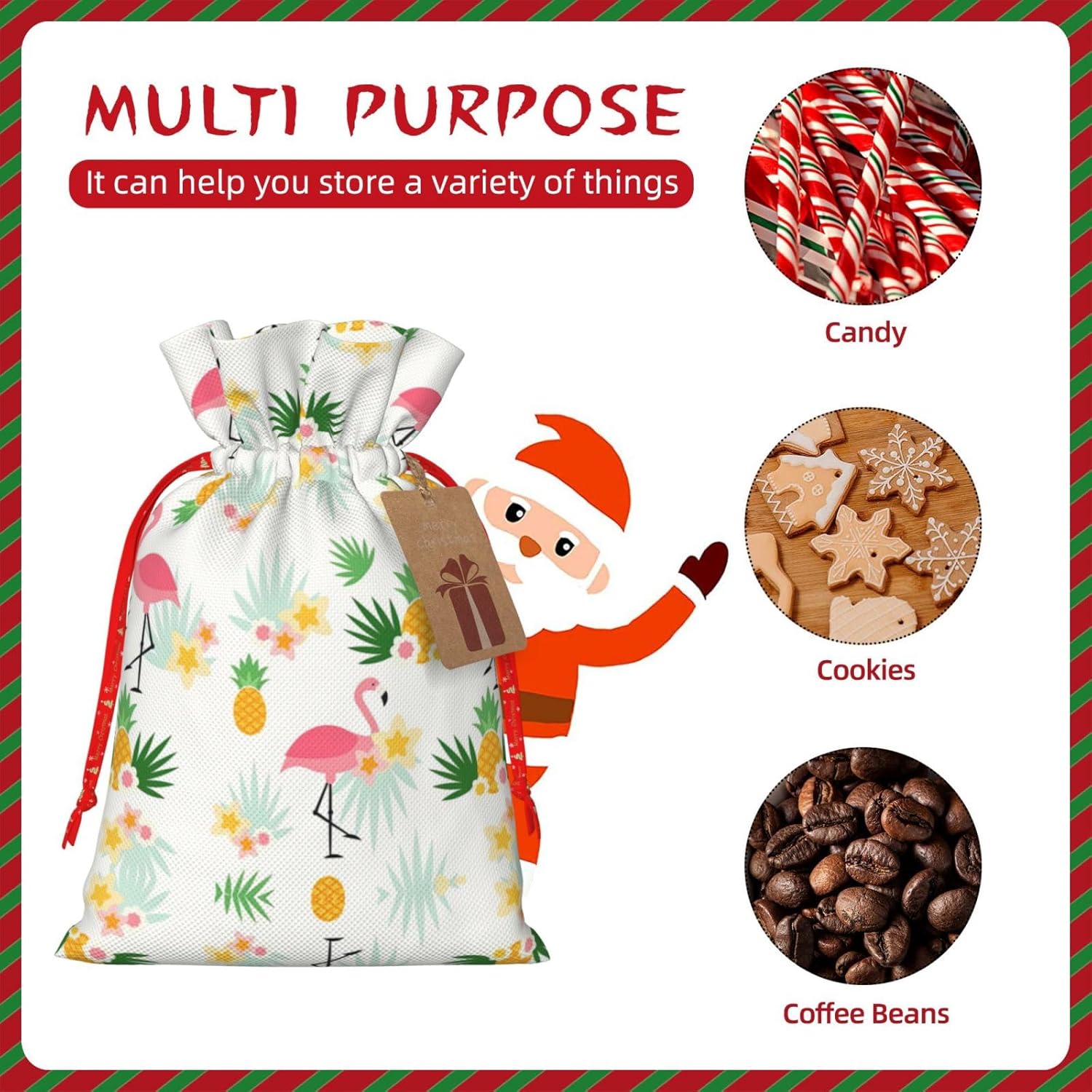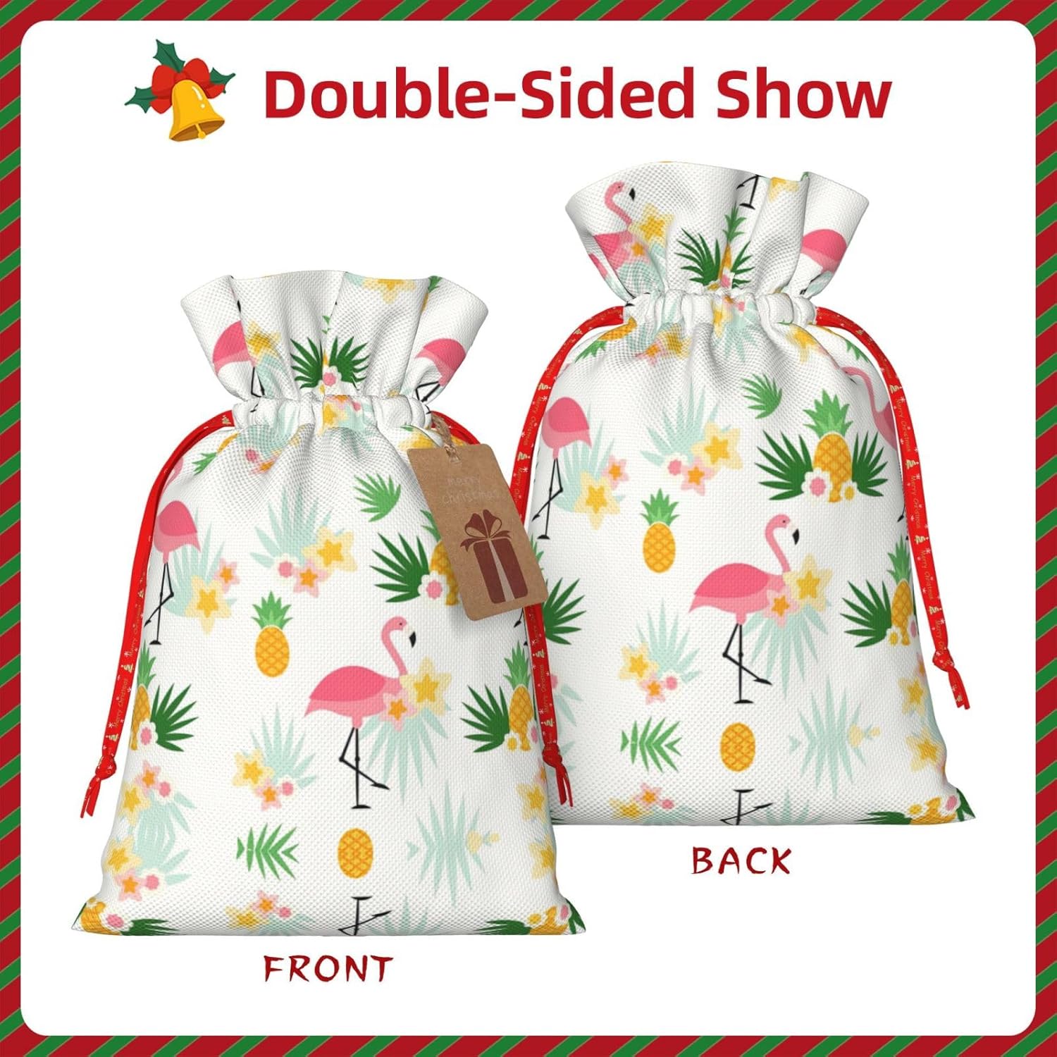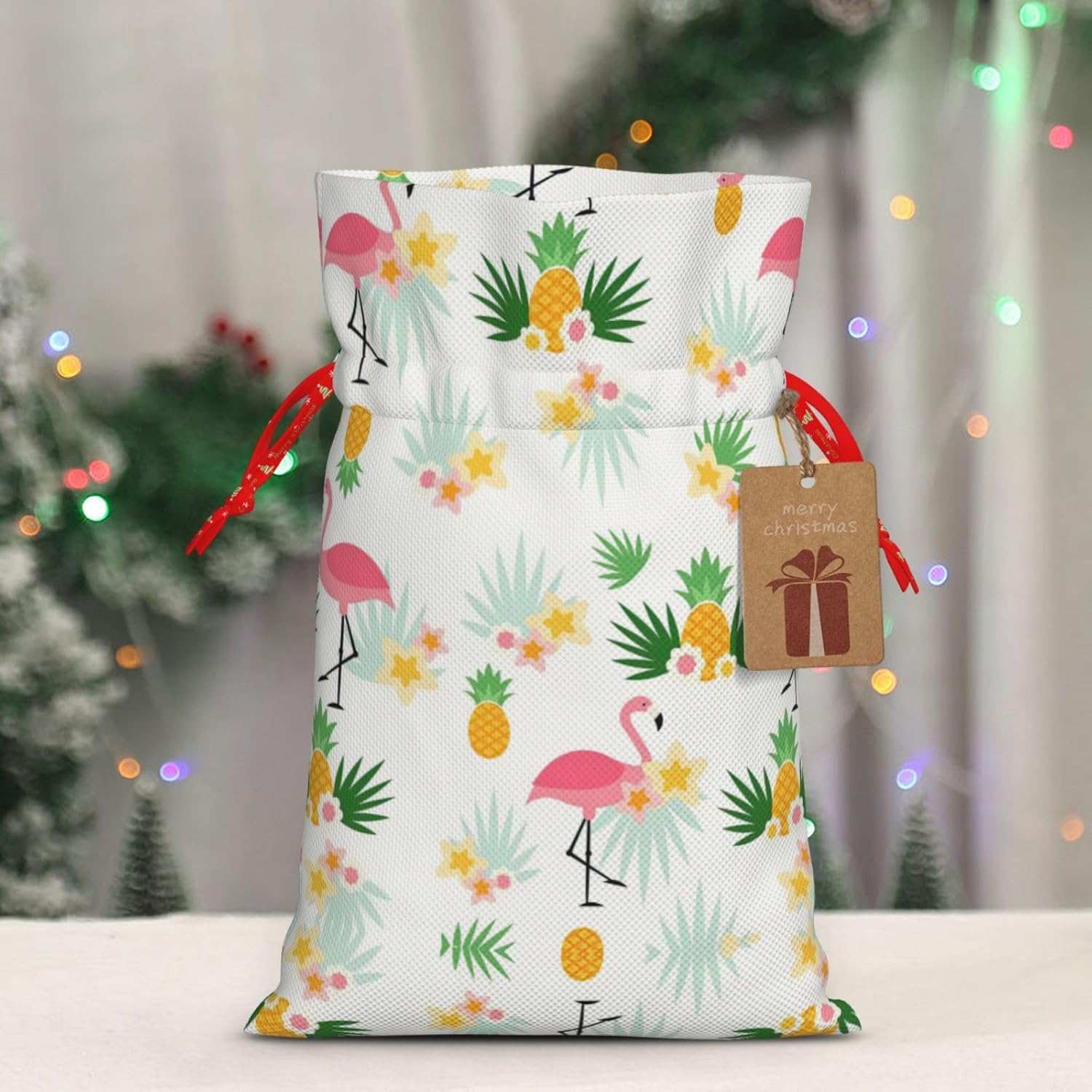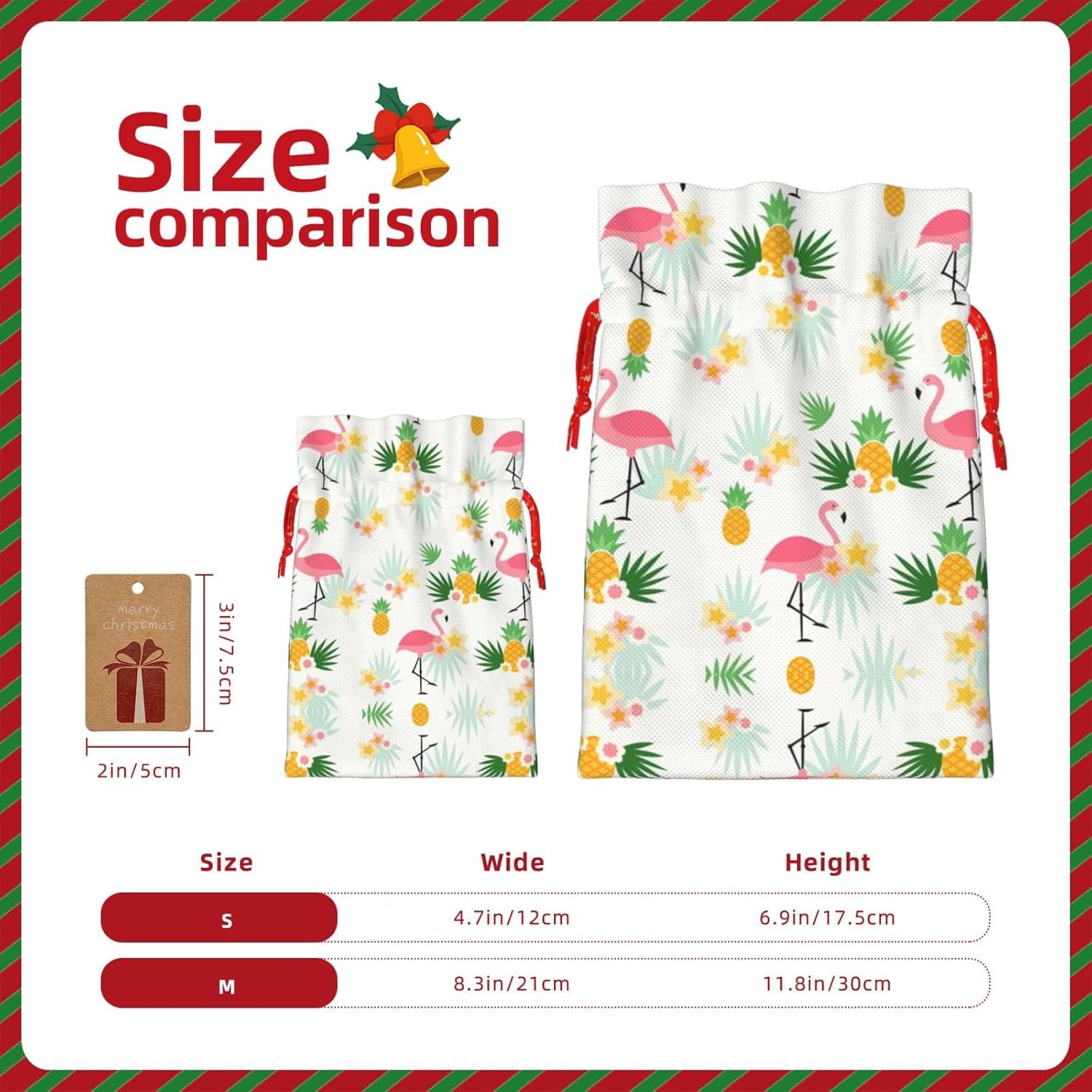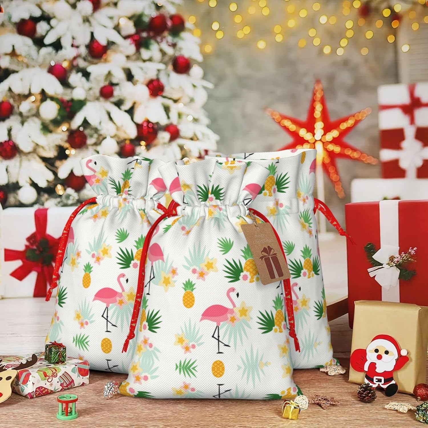 BORSE REGALO DI ALTO VALORE: la borsa Flamingo e Ananas è dotata di sacchetti regalo con cordoncini colorati ed etichette. I sacchetti regalo sono aggiornati con un design con chiusura a coulisse, sacchetti regalo realizzati in poliestere, resistenti e riutilizzabili. Non si strappano come la carta, ottimi per incartare i regali. 10 secondi per incartare un regalo: il sacchetto con fenicotteri e ananas per confezionare facilmente i regali, è facile da usare, basta inserire il regalo nei sacchetti, far scorrere l'etichetta regalo attraverso il nastro, tirare il nastro, annodare un fiocco e il gioco è fatto. Puoi evitare il fastidio associato a carta da imballaggio, forbici, nastro adesivo e nastro, risparmiare tempo e molto conveniente. Dimensioni del sacchetto regalo: i sacchetti regalo in 2 dimensioni possono soddisfare le preferenze di diverse persone e sono sufficienti per l'uso quotidiano e la festa di Natale. La S misura 12 x 17,5 cm e la M misura 12 x 30 cm. Sacchetti regalo in formati assortiti sfusi, perfetti per confezionare regali di diverse dimensioni. REGALO IDEALE: questi sacchetti regalo con fenicotteri e ananas possono essere riutilizzati molte volte. Un set di sacchetti regalo riutilizzabili sarà un'aggiunta meravigliosa a qualsiasi regalo e migliorerà l'esperienza complessiva del regalo. Inoltre, abbiamo rinforzato il fondo per una maggiore stabilità e una struttura robusta con carichi pesanti. Non facile da rompere per un uso durevole e duraturo. Sacchetti regalo multifunzionali: questi sacchetti regalo natalizi con fenicotteri e ananas possono essere utilizzati per conservare regali di Natale, giocattoli, bambole, cappelli natalizi, caramelle e regali durante una festa di Natale. Conservare i regali in questa borsa darà ai bambini più sorprese perché non sanno cosa c'è dentro.