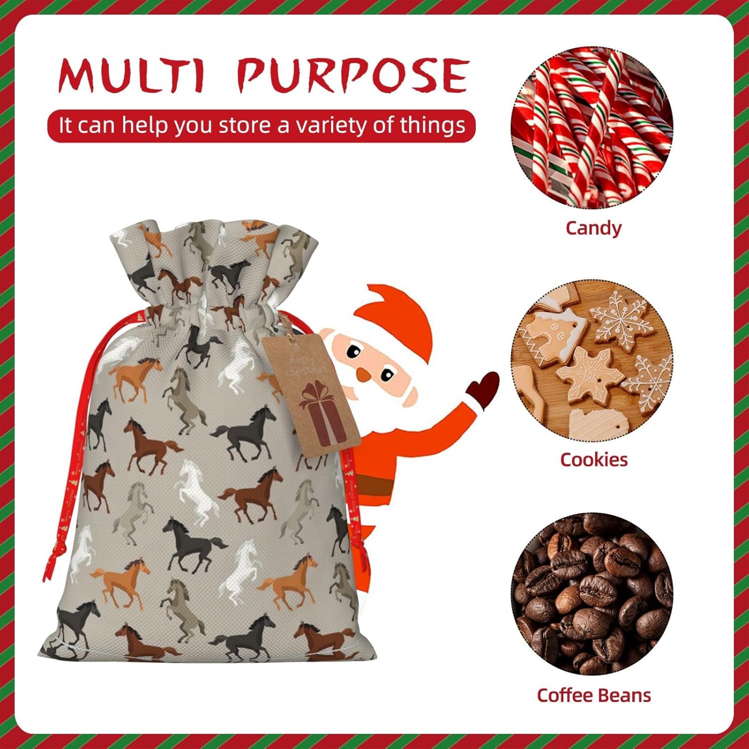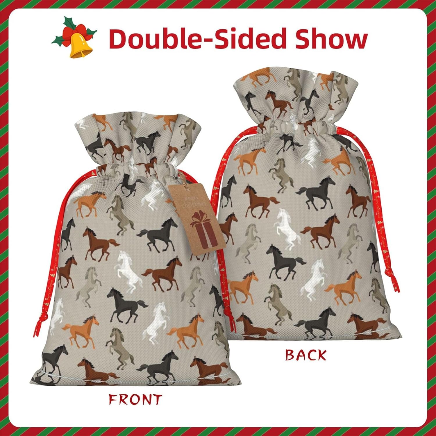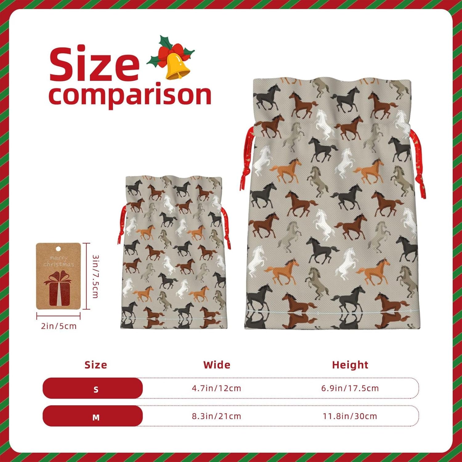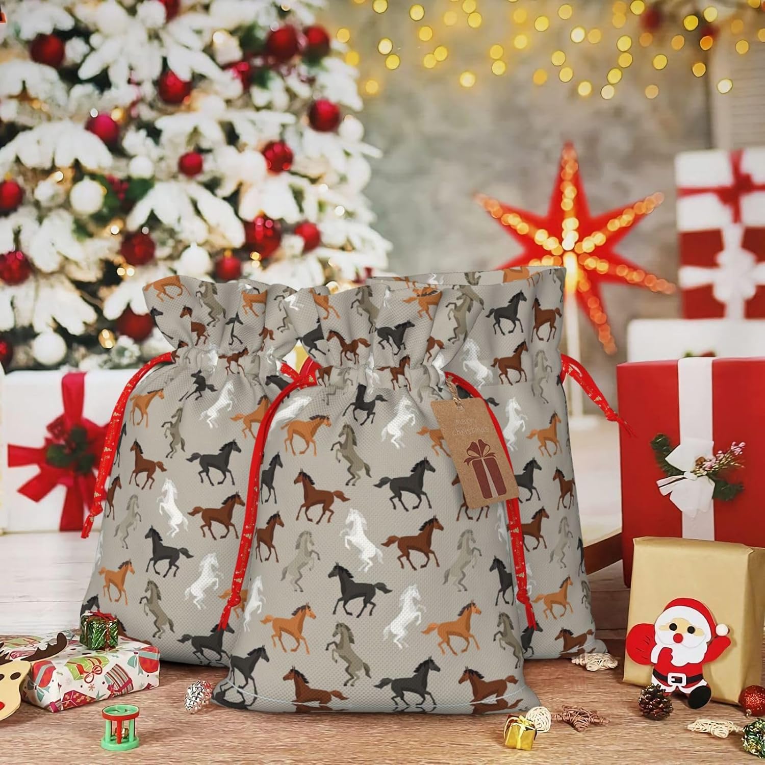 BORSE REGALO DI ALTO VALORE: la graziosa borsa per cavalli è dotata di sacchetti regalo con cordoncini colorati ed etichette. I sacchetti regalo sono aggiornati con un design con chiusura a coulisse, sacchetti regalo realizzati in poliestere, resistenti e riutilizzabili. Non si strappano come la carta, ottimi per incartare i regali. 10 secondi per incartare un regalo: la simpatica borsa a forma di cavallo per confezionare facilmente i regali, è facile da usare, basta inserire il regalo nelle buste, far scorrere l'etichetta regalo attraverso il nastro, tirare il nastro, annodare un fiocco e il gioco è fatto. Puoi evitare il fastidio associato a carta da imballaggio, forbici, nastro adesivo e nastro, risparmiare tempo e molto conveniente. Dimensioni del sacchetto regalo: i sacchetti regalo in 2 dimensioni possono soddisfare le preferenze di diverse persone e sono sufficienti per l'uso quotidiano e la festa di Natale. La S misura 12 x 17,5 cm e la M misura 12 x 30 cm. Sacchetti regalo in formati assortiti sfusi, perfetti per confezionare regali di diverse dimensioni. REGALO NEL REGALO: questi adorabili sacchetti regalo per cavalli possono essere riutilizzati molte volte. Un set di sacchetti regalo riutilizzabili sarà un'aggiunta meravigliosa a qualsiasi regalo e migliorerà l'esperienza complessiva del regalo. Inoltre, abbiamo rinforzato il fondo per una maggiore stabilità e una struttura robusta con carichi pesanti. Non facile da rompere per un uso durevole e duraturo. Sacchetti regalo multifunzionali: questi graziosi sacchetti natalizi a forma di cavallo possono essere utilizzati per conservare regali di Natale, giocattoli, bambole, cappelli natalizi, caramelle e regali durante la festa di Natale. Conservare i regali in questa borsa darà ai bambini più sorprese perché non sanno cosa c'è dentro.