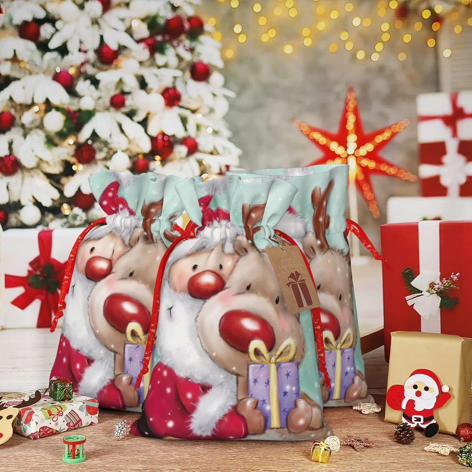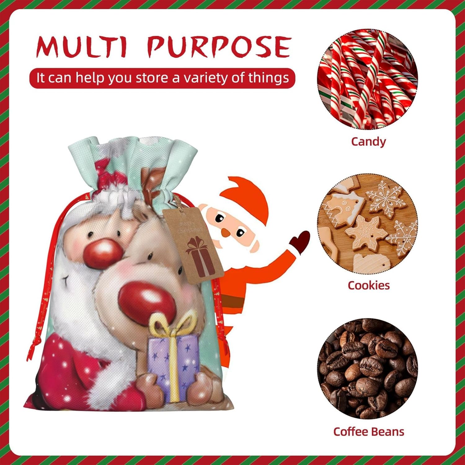 SACCHETTI REGALO DI ALTO VALORE: il sacco Merry Christmas è dotato di sacchetti regalo con cordoncini colorati ed etichette. I sacchetti regalo sono aggiornati con un design con chiusura a coulisse, sacchetti regalo realizzati in poliestere, resistenti e riutilizzabili. Non si strappano come la carta, ottimi per incartare i regali. 10 secondi per incartare un regalo: sacchetto Merry Christmas per confezionare facilmente i regali, è facile da usare, basta inserire il regalo nei sacchetti, far scorrere l'etichetta regalo attraverso il nastro, tirare il nastro, annodare un fiocco e il gioco è fatto. Puoi evitare il fastidio associato a carta da imballaggio, forbici, nastro adesivo e nastro, risparmiare tempo e molto conveniente. Dimensioni del sacchetto regalo: i sacchetti regalo in 2 dimensioni possono soddisfare le preferenze di diverse persone e sono sufficienti per l'uso quotidiano e la festa di Natale. La S misura 12 x 17,5 cm e la M misura 12 x 30 cm. Sacchetti regalo in formati assortiti sfusi, perfetti per confezionare regali di diverse dimensioni. Regalo nel regalo: questi sacchetti regalo di Natale possono essere riutilizzati più volte. Un set di sacchetti regalo riutilizzabili sarà un'aggiunta meravigliosa a qualsiasi regalo e migliorerà l'esperienza complessiva del regalo. Inoltre, abbiamo rinforzato il fondo per una maggiore stabilità e una struttura robusta con carichi pesanti. Non facile da rompere per un uso durevole e duraturo. Sacchetti regalo multifunzionali: questi sacchetti natalizi di Buon Natale possono essere utilizzati per conservare regali di Natale, giocattoli, bambole, cappelli di Natale, caramelle e regali durante una festa di Natale. Conservare i regali in questa borsa darà ai bambini più sorprese perché non sanno cosa c'è dentro.