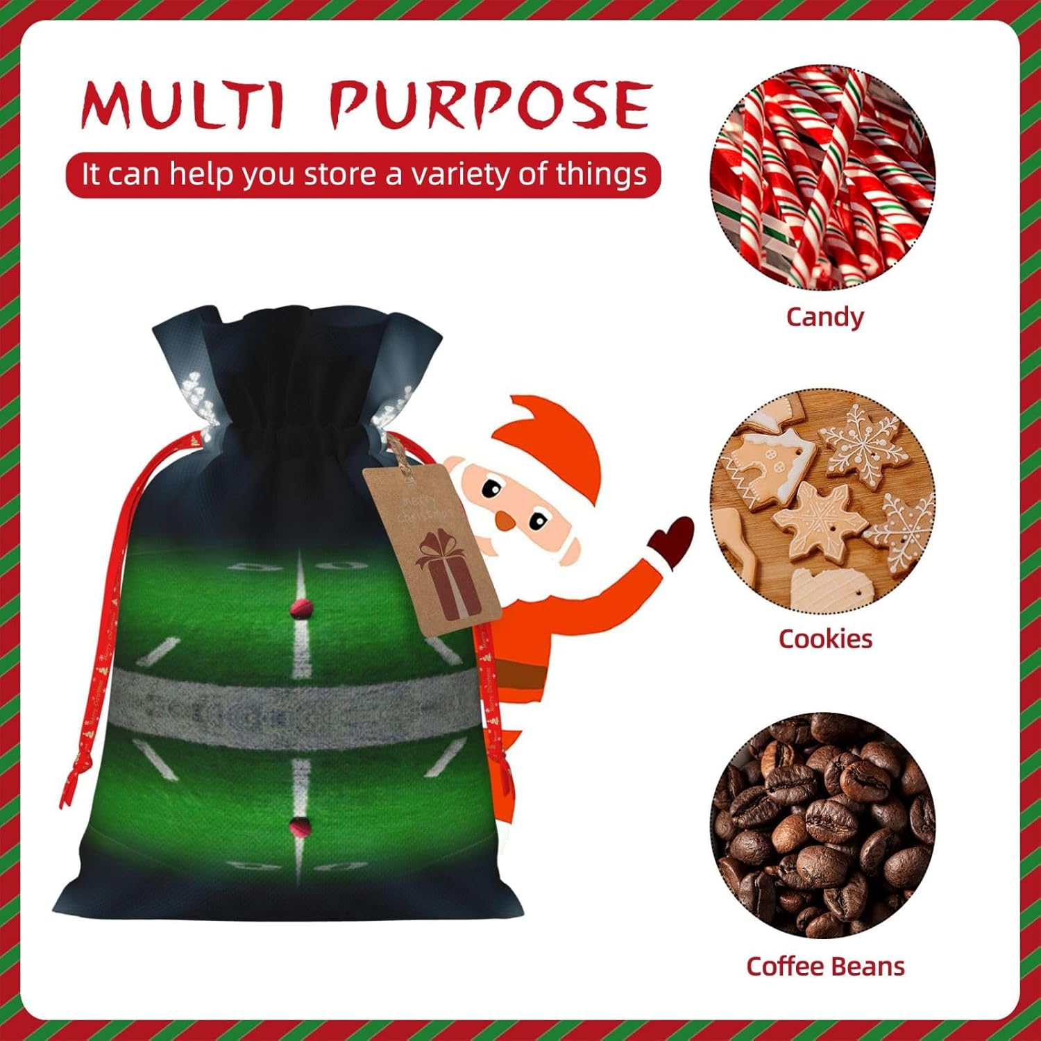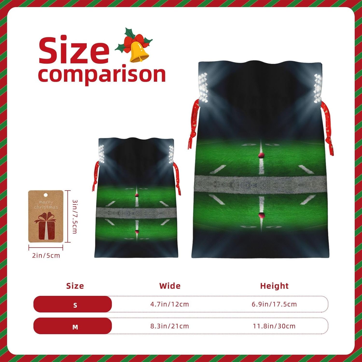 BORSE REGALO DI ALTO VALORE: la borsa da stadio per football americano è dotata di sacchetti regalo con cordoncini colorati ed etichette. I sacchetti regalo sono aggiornati con un design con chiusura a coulisse, sacchetti regalo realizzati in poliestere, resistenti e riutilizzabili. Non si strappano come la carta, ottimi per incartare i regali. 10 secondi per incartare un regalo: la borsa da football americano per confezionare facilmente i regali, è facile da usare, basta inserire il regalo nelle buste, far scorrere l'etichetta regalo attraverso il nastro, tirare il nastro, annodare un fiocco e il gioco è fatto. Puoi evitare il fastidio associato a carta da imballaggio, forbici, nastro adesivo e nastro, risparmiare tempo e molto conveniente. Dimensioni del sacchetto regalo: i sacchetti regalo in 2 dimensioni possono soddisfare le preferenze di diverse persone e sono sufficienti per l'uso quotidiano e la festa di Natale. La S misura 12 x 17,5 cm e la M misura 12 x 30 cm. Sacchetti regalo in formati assortiti sfusi, perfetti per confezionare regali di diverse dimensioni. REGALO NEL REGALO: questi sacchetti regalo per lo stadio di football americano possono essere riutilizzati molte volte. Un set di sacchetti regalo riutilizzabili sarà un'aggiunta meravigliosa a qualsiasi regalo e migliorerà l'esperienza complessiva del regalo. Inoltre, abbiamo rinforzato il fondo per una maggiore stabilità e una struttura robusta con carichi pesanti. Non facile da rompere per un uso durevole e duraturo. Sacchetti regalo multifunzionali: queste borse da football americano possono essere utilizzate per conservare regali di Natale, giocattoli, bambole, cappelli di Natale, caramelle e regali durante una festa di Natale. Conservare i regali in questa borsa darà ai bambini più sorprese perché non sanno cosa c'è dentro.