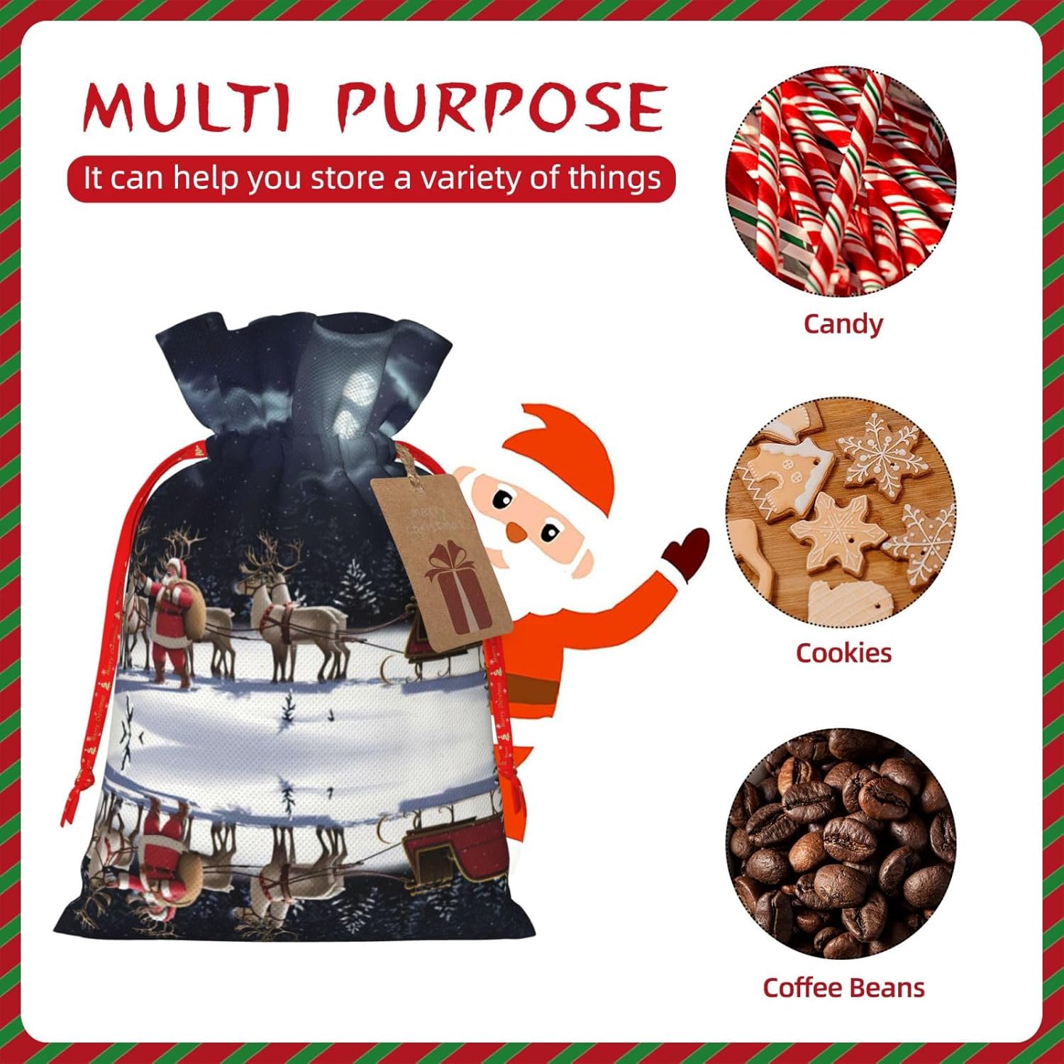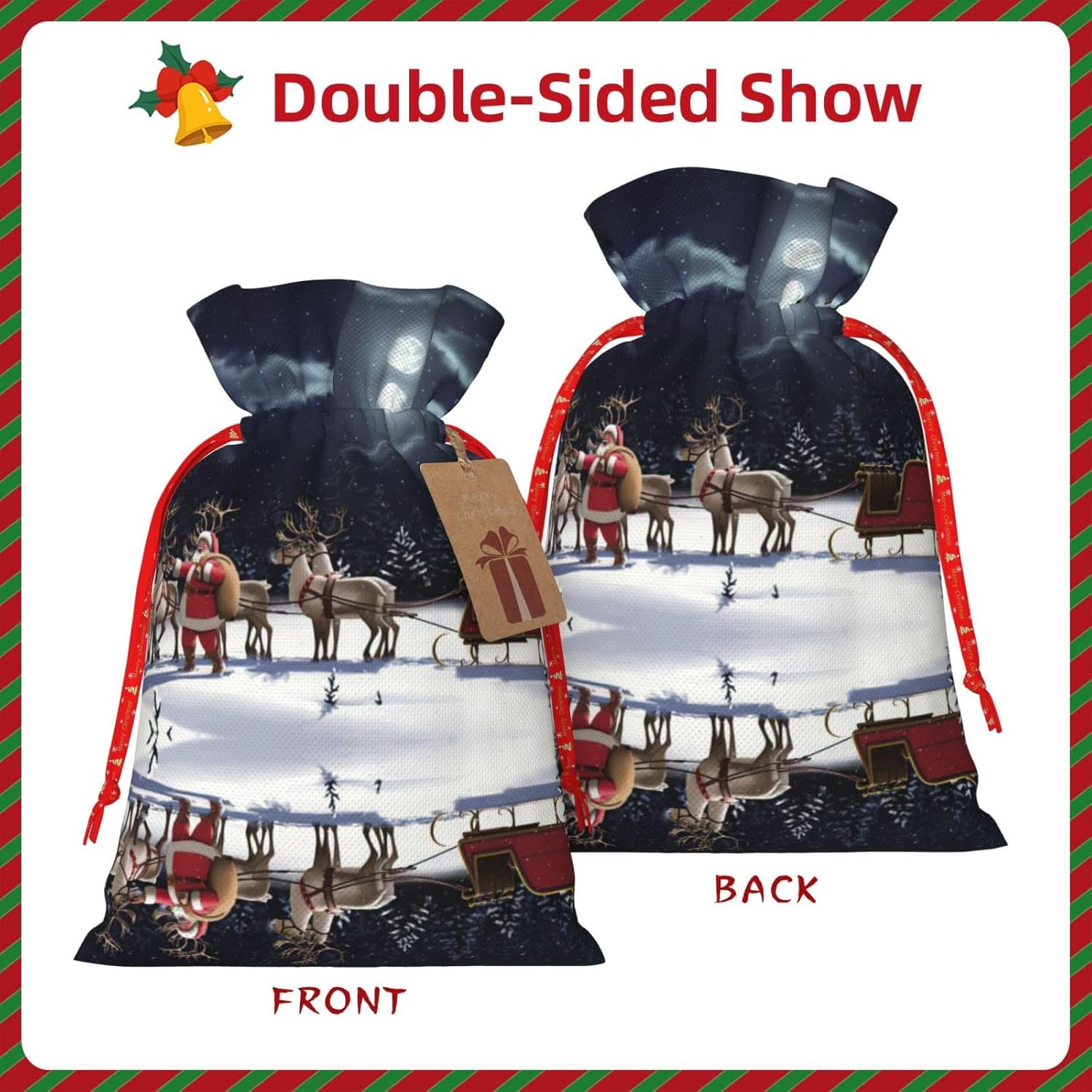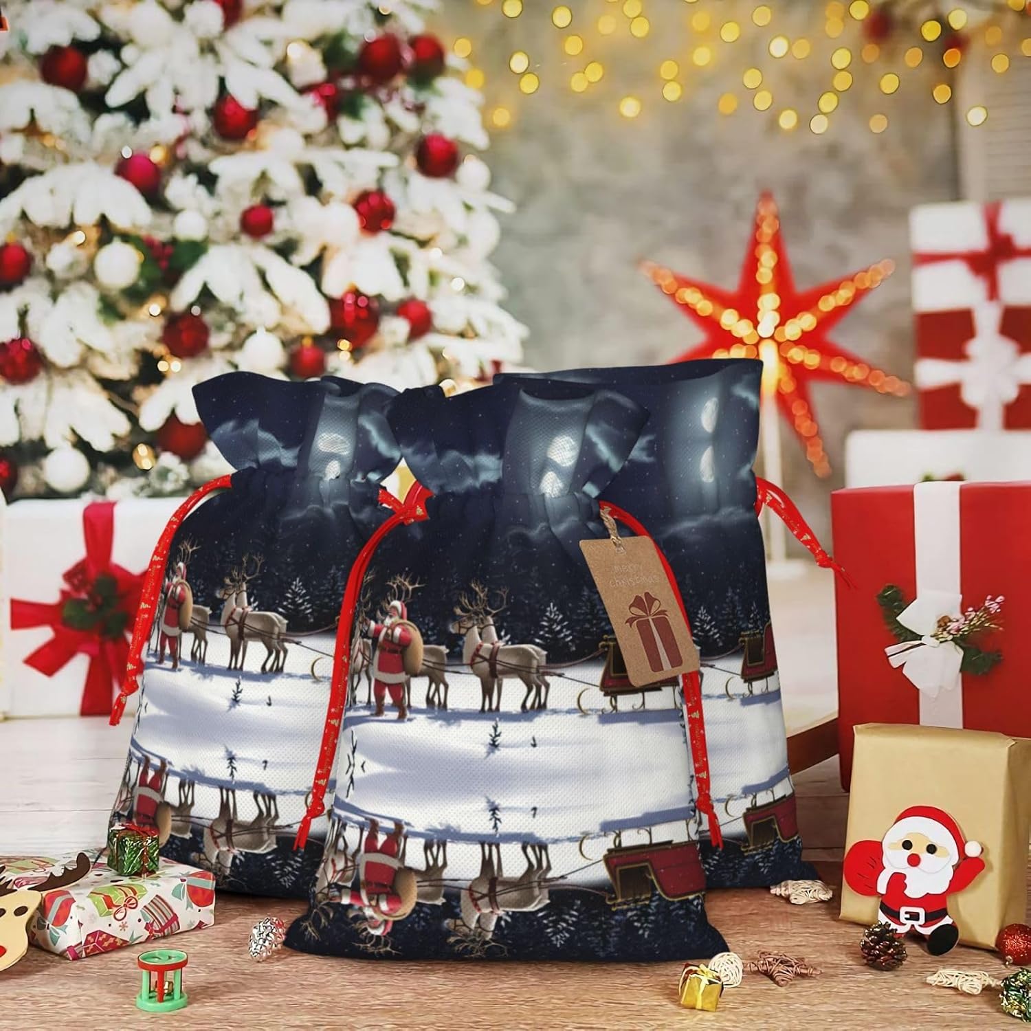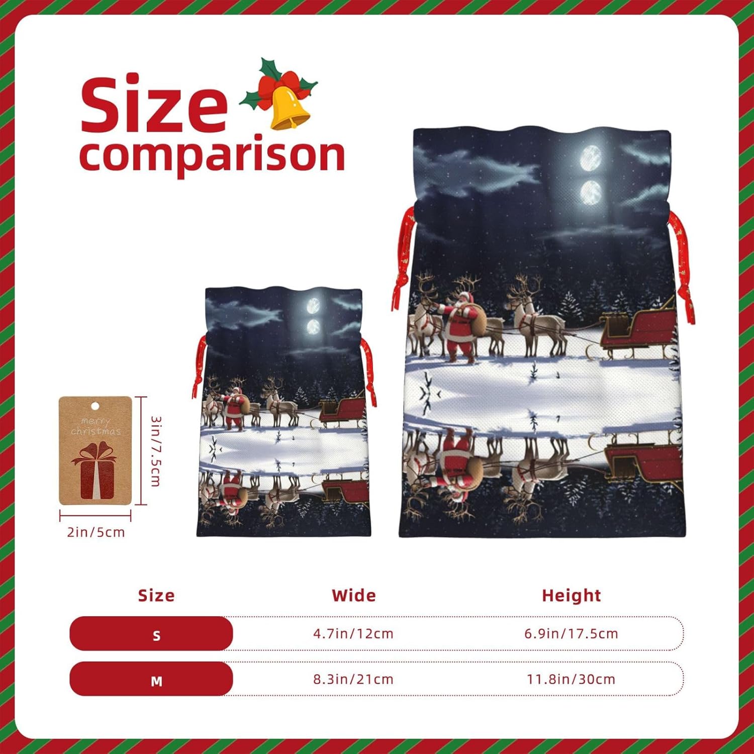 BORSE REGALO DI ALTO VALORE: la borsa da notte natalizia è dotata di sacchetti regalo con cordoncini colorati ed etichette. I sacchetti regalo sono aggiornati con un design con chiusura a coulisse, sacchetti regalo realizzati in poliestere, resistenti e riutilizzabili. Non si strappano come la carta, ottimi per incartare i regali. 10 secondi per incartare un regalo: la borsa da notte natalizia per confezionare facilmente i regali, è facile da usare, basta inserire il regalo nelle buste, far scorrere l'etichetta regalo attraverso il nastro, tirare il nastro, annodare un fiocco e il gioco è fatto. Puoi evitare il fastidio associato a carta da imballaggio, forbici, nastro adesivo e nastro, risparmiare tempo e molto conveniente. Dimensioni del sacchetto regalo: i sacchetti regalo in 2 dimensioni possono soddisfare le preferenze di diverse persone e sono sufficienti per l'uso quotidiano e la festa di Natale. La S misura 12 x 17,5 cm e la M misura 12 x 30 cm. Sacchetti regalo in formati assortiti sfusi, perfetti per confezionare regali di diverse dimensioni. Regalo ideale: questi sacchetti regalo di Natale possono essere riutilizzati più volte. Un set di sacchetti regalo riutilizzabili sarà un'aggiunta meravigliosa a qualsiasi regalo e migliorerà l'esperienza complessiva del regalo. Inoltre, abbiamo rinforzato il fondo per una maggiore stabilità e una struttura robusta con carichi pesanti. Non facile da rompere per un uso durevole e duraturo. Sacchetti regalo multifunzionali: questi sacchetti natalizi possono essere utilizzati per conservare regali di Natale, giocattoli, bambole, cappelli di Natale, caramelle e regali durante una festa di Natale. Conservare i regali in questa borsa darà ai bambini più sorprese perché non sanno cosa c'è dentro.