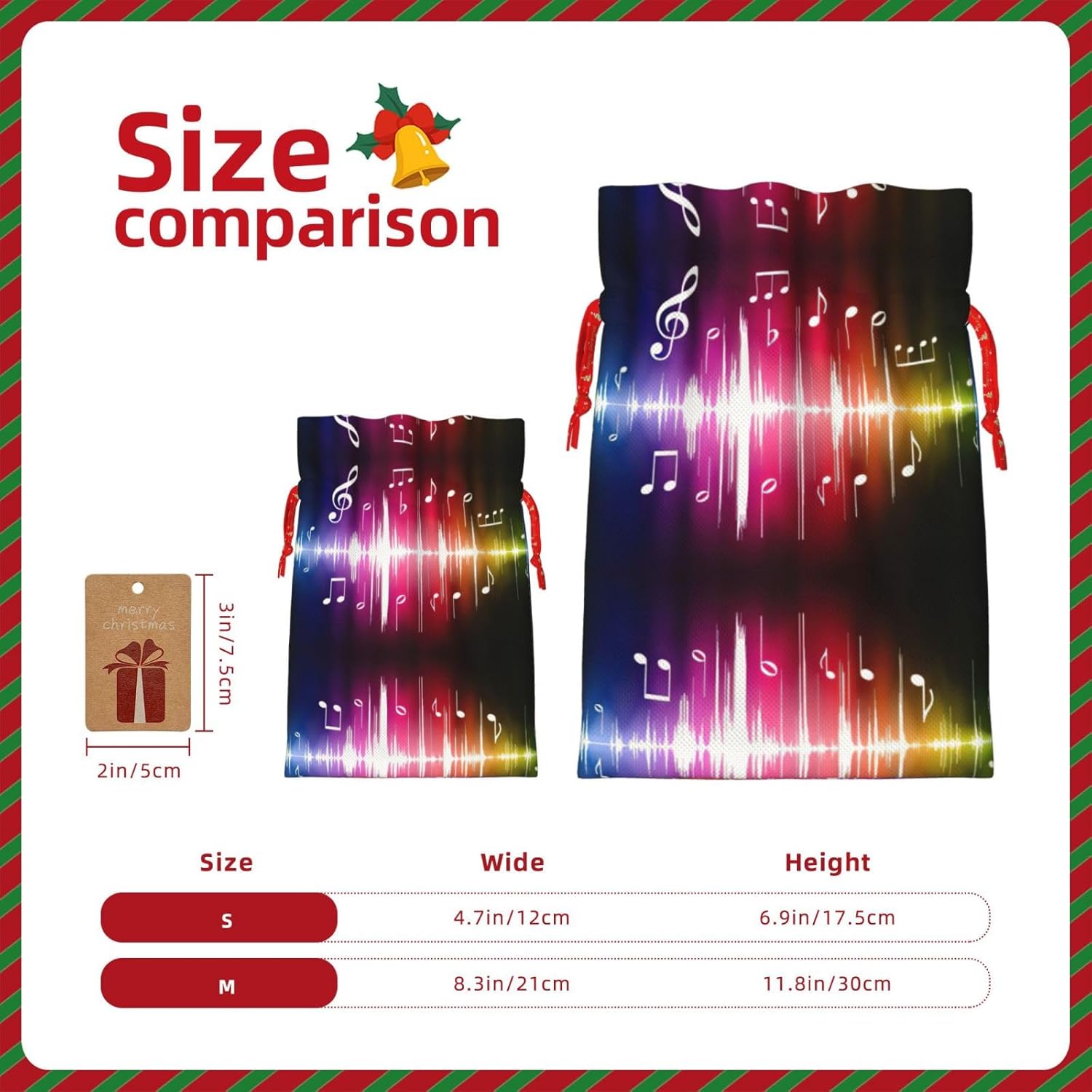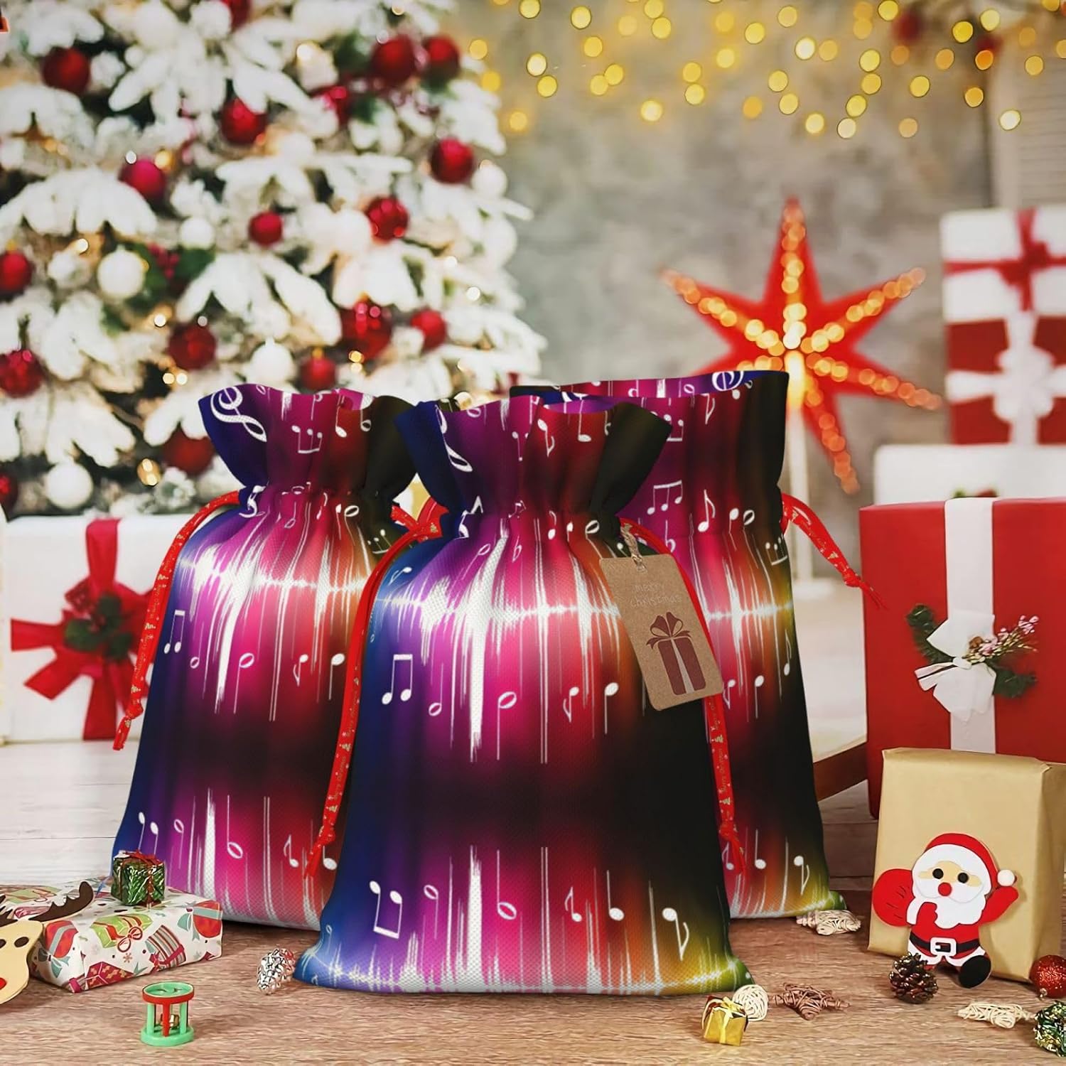BORSE REGALO DI ALTO VALORE: la borsa per note musicali saltanti è dotata di sacchetti regalo con cordoncini colorati ed etichette. I sacchetti regalo sono aggiornati con un design con chiusura a coulisse, sacchetti regalo realizzati in poliestere, resistenti e riutilizzabili. Non si strappano come la carta, ottimi per incartare i regali. 10 secondi per incartare un regalo: il sacchetto per note musicali scoppiettante per confezionare facilmente i regali, è facile da usare, basta inserire il regalo nei sacchetti, far scorrere l'etichetta regalo attraverso il nastro, tirare il nastro, annodare un fiocco e il gioco è fatto. Puoi evitare il fastidio associato a carta da imballaggio, forbici, nastro adesivo e nastro, risparmiare tempo e molto conveniente. Dimensioni del sacchetto regalo: i sacchetti regalo in 2 dimensioni possono soddisfare le preferenze di diverse persone e sono sufficienti per l'uso quotidiano e la festa di Natale. La S misura 12 x 17,5 cm e la M misura 12 x 30 cm. Sacchetti regalo in formati assortiti sfusi, perfetti per confezionare regali di diverse dimensioni. REGALO NEL REGALO: questi sacchetti regalo con note musicali saltellanti possono essere riutilizzati molte volte. Un set di sacchetti regalo riutilizzabili sarà un'aggiunta meravigliosa a qualsiasi regalo e migliorerà l'esperienza complessiva del regalo. Inoltre, abbiamo rinforzato il fondo per una maggiore stabilità e una struttura robusta con carichi pesanti. Non facile da rompere per un uso durevole e duraturo. Sacchetti regalo multifunzionali: questi sacchetti per note musicali saltellanti regalo di Natale possono essere utilizzati per conservare regali di Natale, giocattoli, bambole, cappelli di Natale, caramelle e regali in una festa di Natale. Conservare i regali in questa borsa darà ai bambini più sorprese perché non sanno cosa c'è dentro.