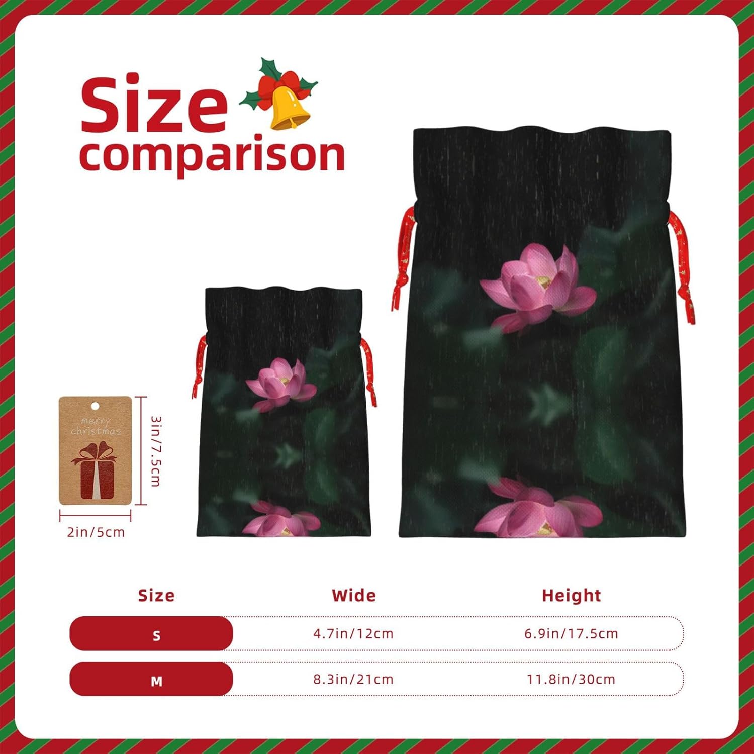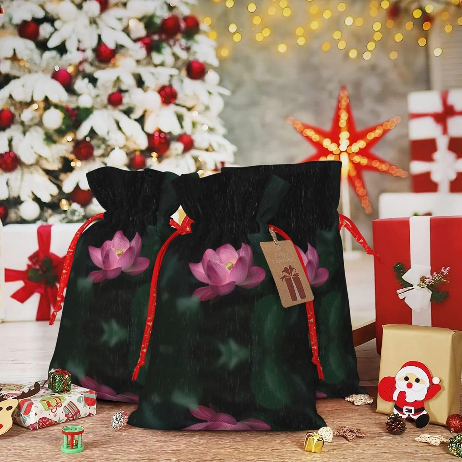 BORSE REGALO DI ALTO VALORE: la borsa con fiori di loto è dotata di sacchetti regalo con cordoncini colorati ed etichette. I sacchetti regalo sono aggiornati con un design con chiusura a coulisse, sacchetti regalo realizzati in poliestere, resistenti e riutilizzabili. Non si strappano come la carta, ottimi per incartare i regali. 10 secondi per incartare un regalo: il sacchetto con fiori di loto per confezionare facilmente i regali, è facile da usare, basta inserire il regalo nei sacchetti, far scorrere l'etichetta regalo attraverso il nastro, tirare il nastro, annodare un fiocco e il gioco è fatto. Puoi evitare il fastidio associato a carta da imballaggio, forbici, nastro adesivo e nastro, risparmiare tempo e molto conveniente. Dimensioni del sacchetto regalo: i sacchetti regalo in 2 dimensioni possono soddisfare le preferenze di diverse persone e sono sufficienti per l'uso quotidiano e la festa di Natale. La S misura 12 x 17,5 cm e la M misura 12 x 30 cm. Sacchetti regalo in formati assortiti sfusi, perfetti per confezionare regali di diverse dimensioni. Regalo nel regalo: questi sacchetti regalo con fiori di loto possono essere riutilizzati molte volte. Un set di sacchetti regalo riutilizzabili sarà un'aggiunta meravigliosa a qualsiasi regalo e migliorerà l'esperienza complessiva del regalo. Inoltre, abbiamo rinforzato il fondo per una maggiore stabilità e una struttura robusta con carichi pesanti. Non facile da rompere per un uso durevole e duraturo. Sacchetti regalo multifunzionali: questi sacchetti di fiori di loto possono essere utilizzati per conservare regali di Natale, giocattoli, bambole, cappelli di Natale, caramelle e regali durante una festa di Natale. Conservare i regali in questa borsa darà ai bambini più sorprese perché non sanno cosa c'è dentro.