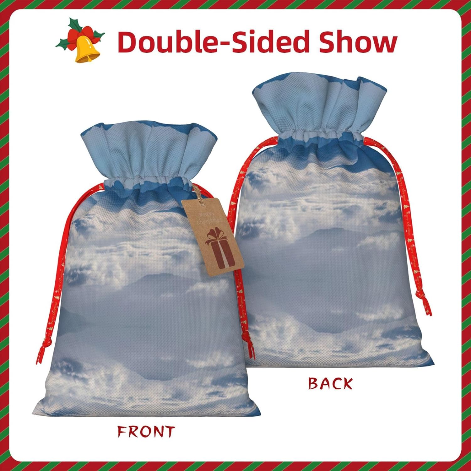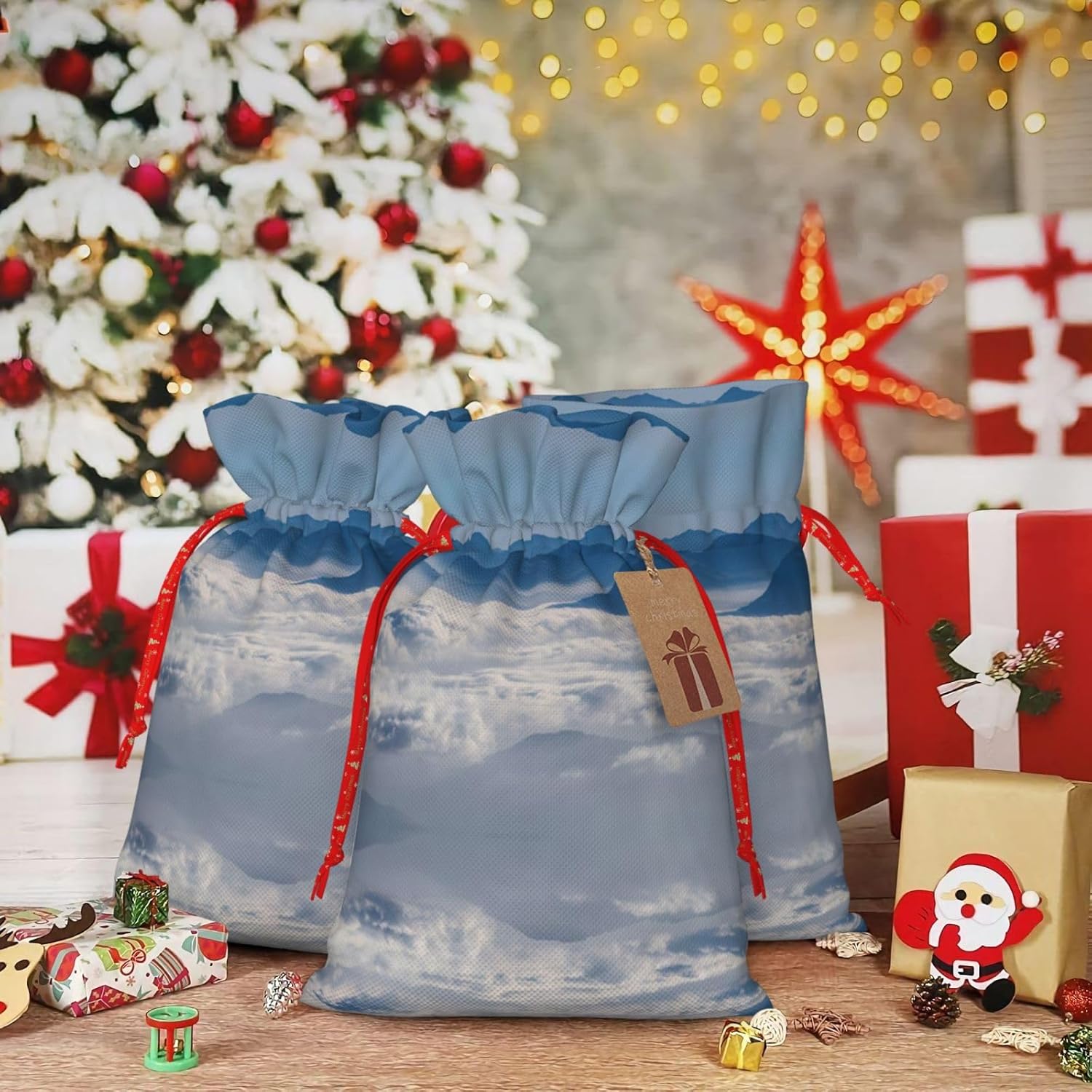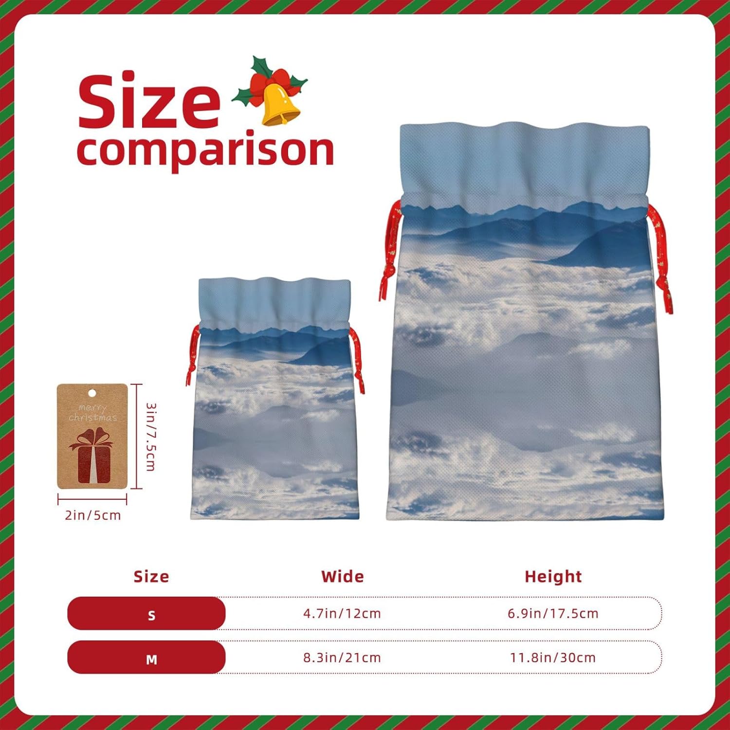 BORSE REGALO DI ALTO VALORE: la borsa paesaggio con montagne e nuvole è dotata di sacchetti regalo con cordoncini colorati ed etichette. I sacchetti regalo sono aggiornati con un design con chiusura a coulisse, sacchetti regalo realizzati in poliestere, resistenti e riutilizzabili. Non si strappano come la carta, ottimi per incartare i regali. 10 secondi per incartare un regalo: il paesaggio con montagne e nuvole per impacchettare facilmente il regalo, è facile da usare, basta inserire il regalo nei sacchetti, far scorrere l'etichetta regalo attraverso il nastro, tirare il nastro, annodare un fiocco e il gioco è fatto. Puoi evitare il fastidio associato a carta da imballaggio, forbici, nastro adesivo e nastro, risparmiare tempo e molto conveniente. Dimensioni del sacchetto regalo: i sacchetti regalo in 2 dimensioni possono soddisfare le preferenze di diverse persone e sono sufficienti per l'uso quotidiano e la festa di Natale. La S misura 12 x 17,5 cm e la M misura 12 x 30 cm. Sacchetti regalo in formati assortiti sfusi, perfetti per confezionare regali di diverse dimensioni. Regalo nel regalo: questi sacchetti regalo paesaggistici con montagne e nuvole possono essere riutilizzati molte volte. Un set di sacchetti regalo riutilizzabili sarà un'aggiunta meravigliosa a qualsiasi regalo e migliorerà l'esperienza complessiva del regalo. Inoltre, abbiamo rinforzato il fondo per una maggiore stabilità e una struttura robusta con carichi pesanti. Non facile da rompere per un uso durevole e duraturo. Sacchetti regalo multifunzionali: questi sacchetti regalo di Natale con montagne e nuvole possono essere utilizzati per conservare regali di Natale, giocattoli, bambole, cappelli di Natale, caramelle e regali durante una festa di Natale. Conservare i regali in questa borsa darà ai bambini più sorprese perché non sanno cosa c'è dentro.