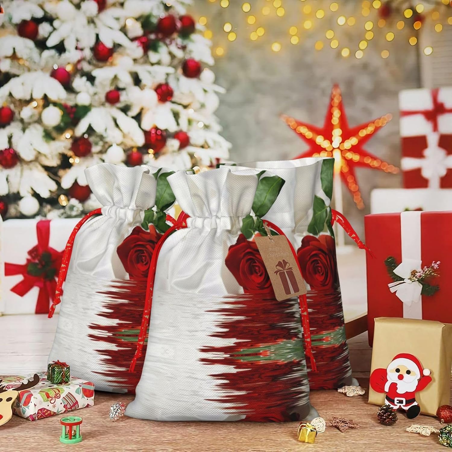 BORSE REGALO DI ALTO VALORE: la borsa rosa rossa è dotata di sacchetti regalo con cordoncini colorati ed etichette. I sacchetti regalo sono aggiornati con un design con chiusura a coulisse, sacchetti regalo realizzati in poliestere, resistenti e riutilizzabili. Non si strappano come la carta, ottimi per incartare i regali. 10 secondi per incartare un regalo: il sacchetto con rose rosse per incartare facilmente i regali, è facile da usare, basta inserire il regalo nei sacchetti, far scorrere l'etichetta regalo attraverso il nastro, tirare il nastro, annodare un fiocco e il gioco è fatto. Puoi evitare il fastidio associato a carta da imballaggio, forbici, nastro adesivo e nastro, risparmiare tempo e molto conveniente. Dimensioni del sacchetto regalo: i sacchetti regalo in 2 dimensioni possono soddisfare le preferenze di diverse persone e sono sufficienti per l'uso quotidiano e la festa di Natale. La S misura 12 x 17,5 cm e la M misura 12 x 30 cm. Sacchetti regalo in formati assortiti sfusi, perfetti per confezionare regali di diverse dimensioni. Regalo nel regalo: questi sacchetti regalo con rose rosse possono essere riutilizzati molte volte. Un set di sacchetti regalo riutilizzabili sarà un'aggiunta meravigliosa a qualsiasi regalo e migliorerà l'esperienza complessiva del regalo. Inoltre, abbiamo rinforzato il fondo per una maggiore stabilità e una struttura robusta con carichi pesanti. Non facile da rompere per un uso durevole e duraturo. Sacchetti regalo multifunzionali: questi sacchetti regalo natalizi con rose rosse possono essere utilizzati per conservare regali di Natale, giocattoli, bambole, cappelli natalizi, caramelle e regali durante una festa di Natale. Conservare i regali in questa borsa darà ai bambini più sorprese perché non sanno cosa c'è dentro.