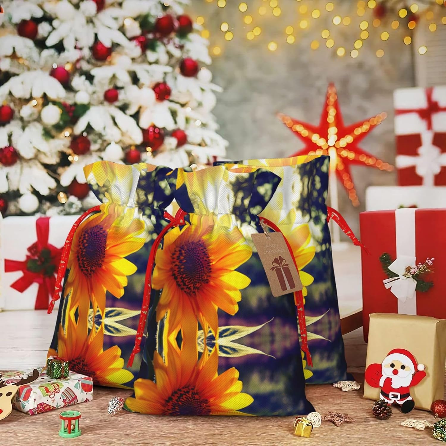 BORSE REGALO DI ALTO VALORE: la borsa girasole è dotata di sacchetti regalo con cordoncini colorati ed etichette. I sacchetti regalo sono aggiornati con un design con chiusura a coulisse, sacchetti regalo realizzati in poliestere, resistenti e riutilizzabili. Non si strappano come la carta, ottimi per incartare i regali. 10 secondi per incartare un regalo: il sacchetto girasole per confezionare facilmente i regali, è facile da usare, basta inserire il regalo nei sacchetti, far scorrere l'etichetta regalo attraverso il nastro, tirare il nastro, annodare un fiocco e il gioco è fatto. Puoi evitare il fastidio associato a carta da imballaggio, forbici, nastro adesivo e nastro, risparmiare tempo e molto conveniente. Dimensioni del sacchetto regalo: i sacchetti regalo in 2 dimensioni possono soddisfare le preferenze di diverse persone e sono sufficienti per l'uso quotidiano e la festa di Natale. La S misura 12 x 17,5 cm e la M misura 12 x 30 cm. Sacchetti regalo in formati assortiti sfusi, perfetti per confezionare regali di diverse dimensioni. REGALO NEL REGALO: questi sacchetti regalo con girasole possono essere riutilizzati molte volte. Un set di sacchetti regalo riutilizzabili sarà un'aggiunta meravigliosa a qualsiasi regalo e migliorerà l'esperienza complessiva del regalo. Inoltre, abbiamo rinforzato il fondo per una maggiore stabilità e una struttura robusta con carichi pesanti. Non facile da rompere per un uso durevole e duraturo. Sacchetti regalo multifunzionali: questi sacchetti regalo di Natale a forma di girasole possono essere utilizzati per conservare regali di Natale, giocattoli, bambole, cappelli di Natale, caramelle e regali durante la festa di Natale. Conservare i regali in questa borsa darà ai bambini più sorprese perché non sanno cosa c'è dentro.