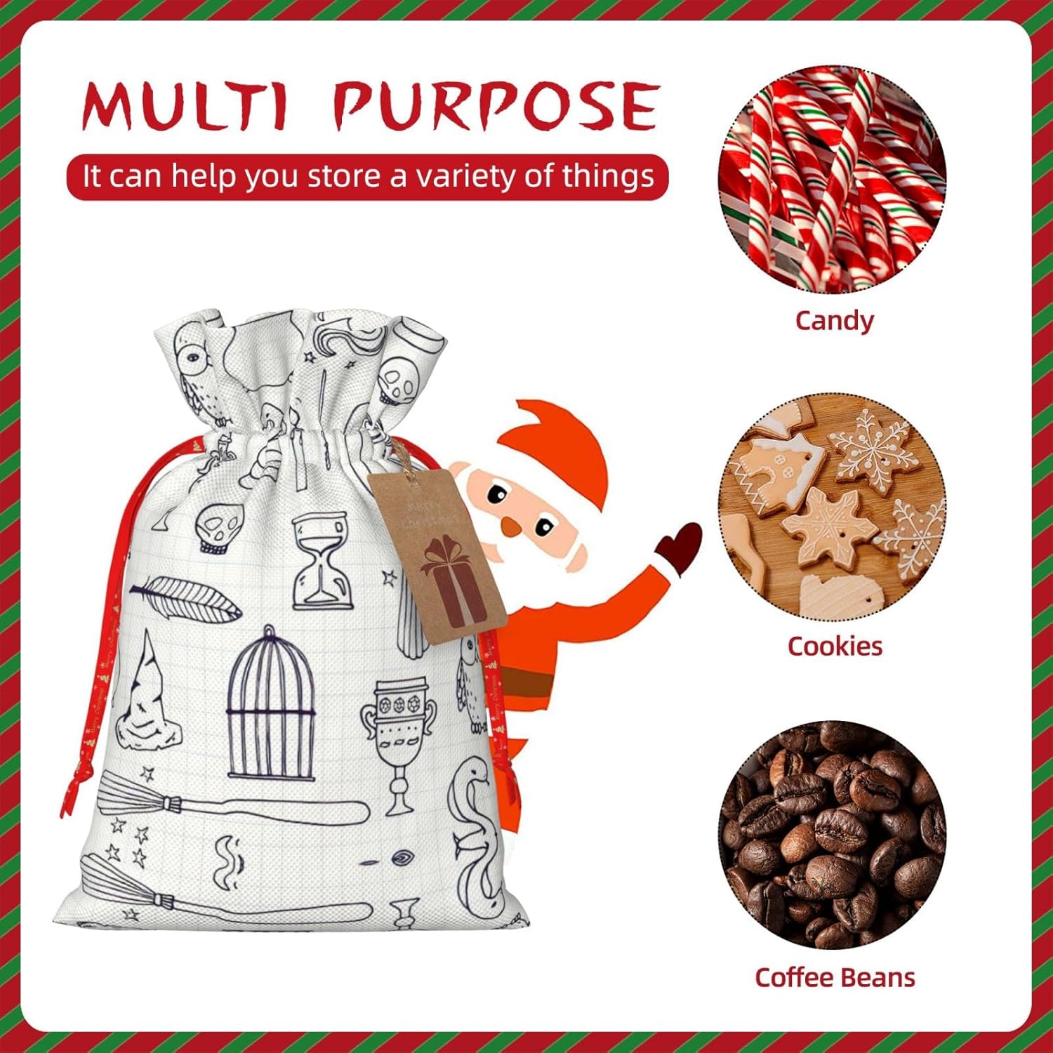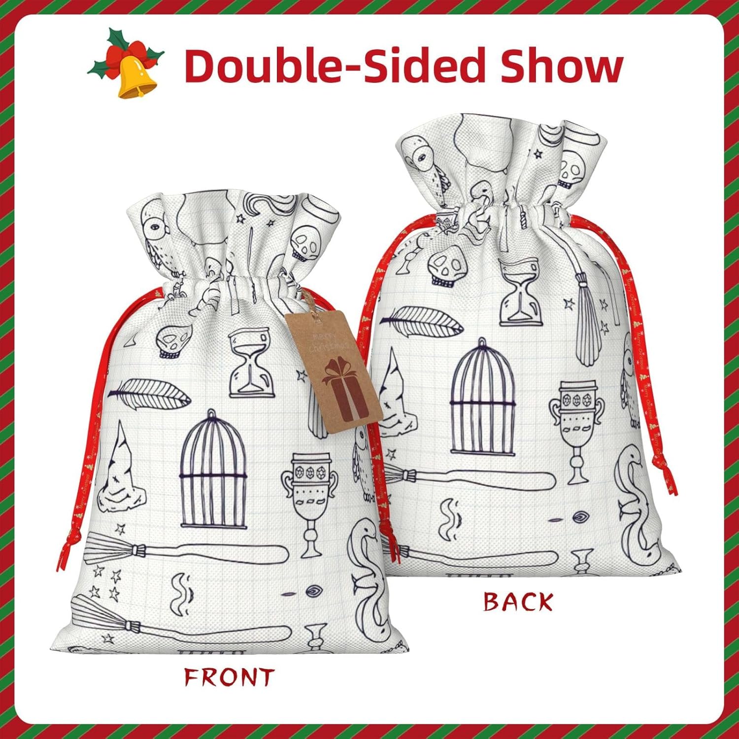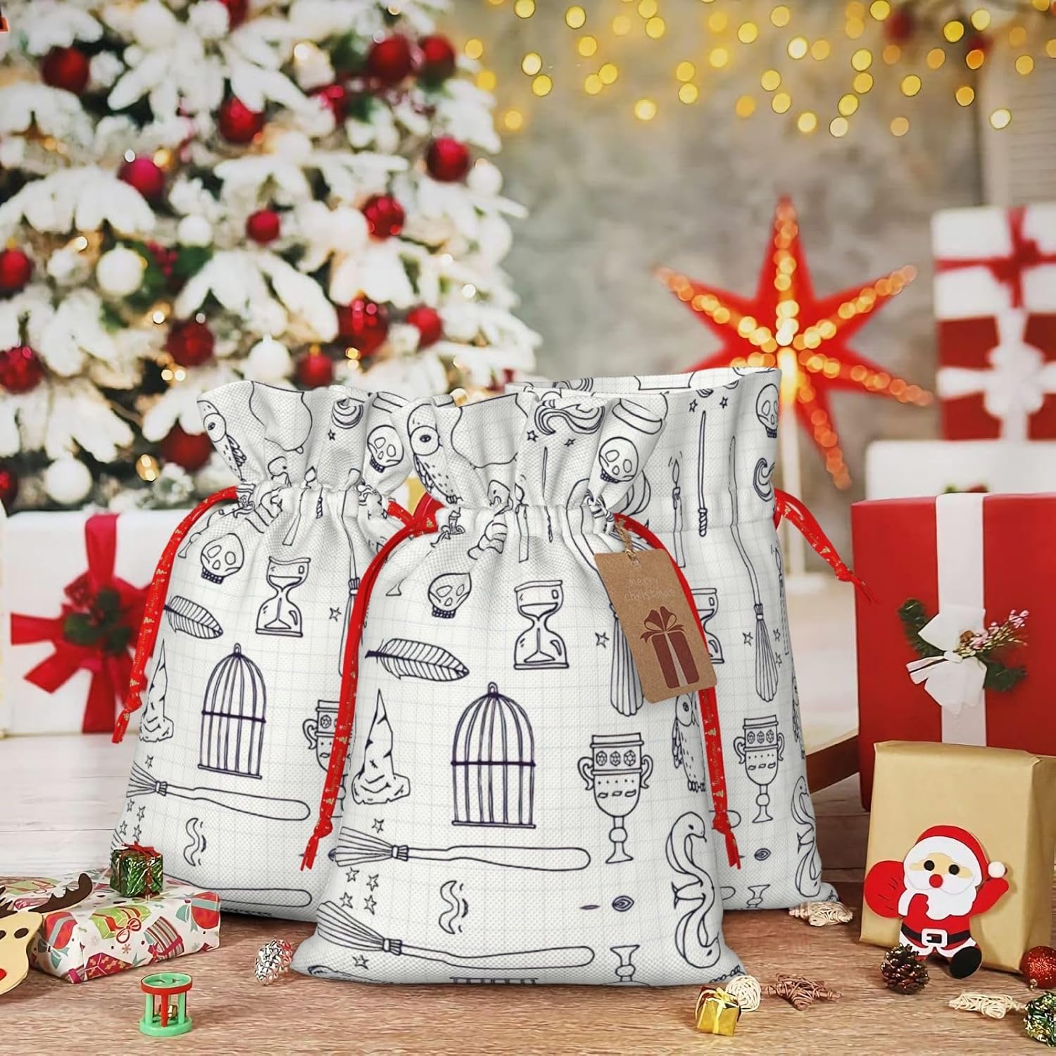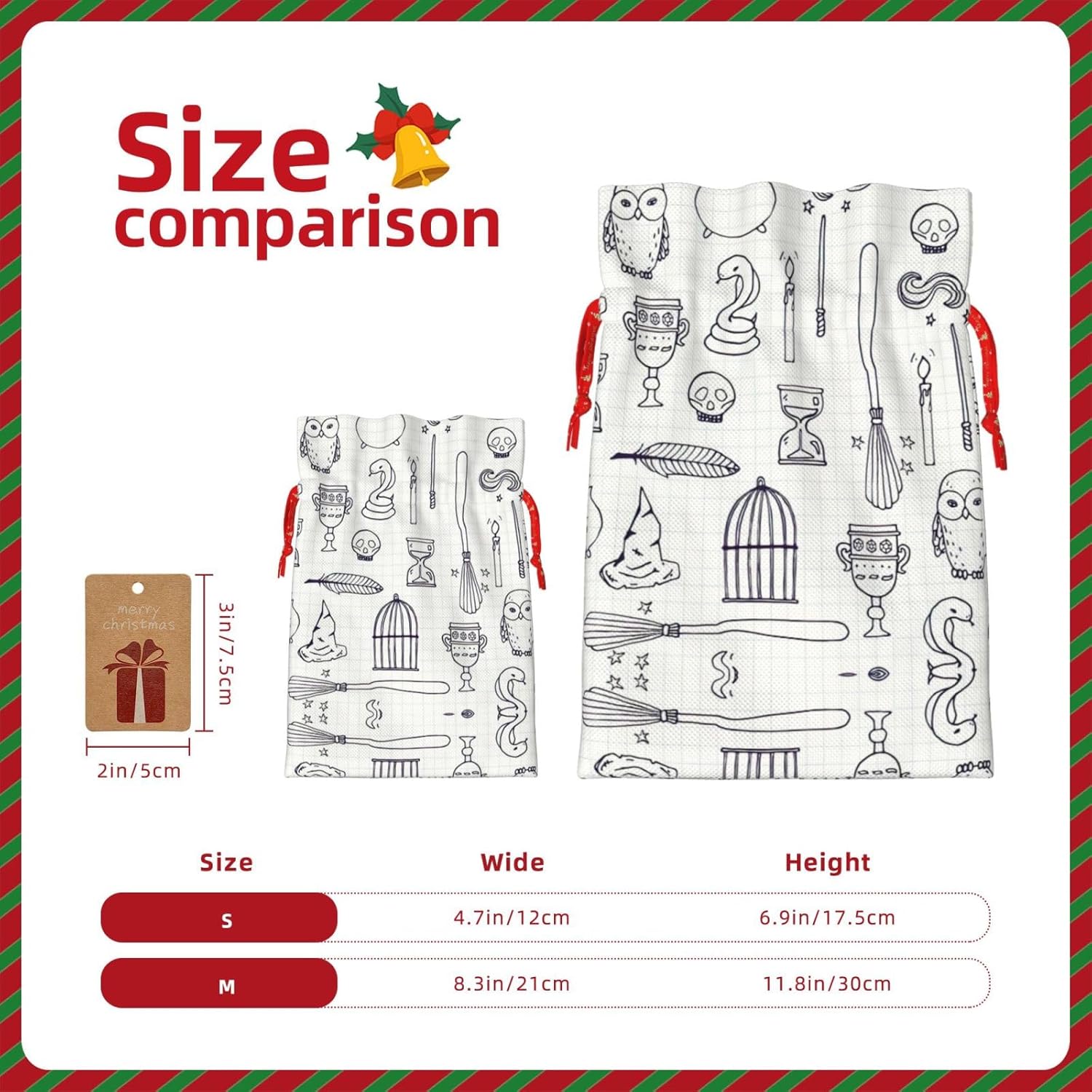 BORSE REGALO DI ALTO VALORE: varie borse per attrezzi da strega sono dotate di sacchetti regalo con cordoncini colorati ed etichette. I sacchetti regalo sono aggiornati con un design con chiusura a coulisse, sacchetti regalo realizzati in poliestere, resistenti e riutilizzabili. Non si strappano come la carta, ottimi per incartare i regali. 10 secondi per incartare un regalo: i diversi sacchetti per equipaggiamento da strega per confezionare facilmente i regali, sono facili da usare, basta inserire il regalo nei sacchetti, far scorrere l'etichetta regalo attraverso il nastro, tirare il nastro, annodare un fiocco e il gioco è fatto. Puoi evitare il fastidio associato a carta da imballaggio, forbici, nastro adesivo e nastro, risparmiare tempo e molto conveniente. Dimensioni del sacchetto regalo: i sacchetti regalo in 2 dimensioni possono soddisfare le preferenze di diverse persone e sono sufficienti per l'uso quotidiano e la festa di Natale. La S misura 12 x 17,5 cm e la M misura 12 x 30 cm. Sacchetti regalo in formati assortiti sfusi, perfetti per confezionare regali di diverse dimensioni. Regalo nel regalo: questi diversi sacchetti regalo con equipaggiamento da strega possono essere riutilizzati più volte. Un set di sacchetti regalo riutilizzabili sarà un'aggiunta meravigliosa a qualsiasi regalo e migliorerà l'esperienza complessiva del regalo. Inoltre, abbiamo rinforzato il fondo per una maggiore stabilità e una struttura robusta con carichi pesanti. Non facile da rompere per un uso durevole e duraturo. Sacchetti regalo multifunzionali: questi diversi sacchetti da strega possono essere utilizzati per conservare regali di Natale, giocattoli, bambole, cappelli di Natale, caramelle e regali durante una festa di Natale. Conservare i regali in questa borsa darà ai bambini più sorprese perché non sanno cosa c'è dentro.