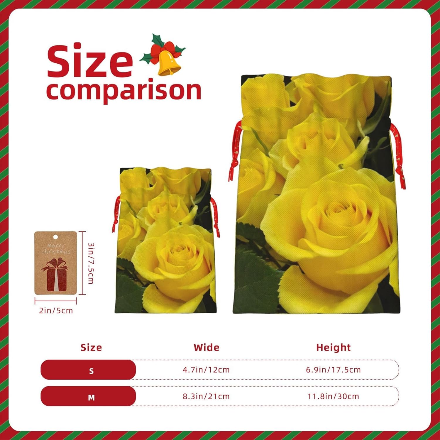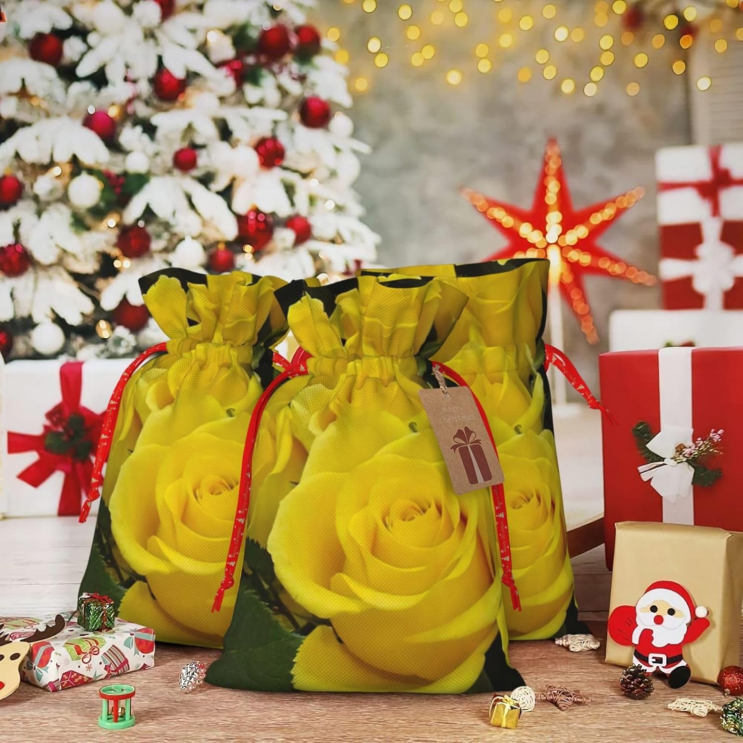 BORSE REGALO DI ALTO VALORE: la borsa rosa gialla è dotata di sacchetti regalo con cordoncini colorati ed etichette. I sacchetti regalo sono aggiornati con un design con chiusura a coulisse, sacchetti regalo realizzati in poliestere, resistenti e riutilizzabili. Non si strappano come la carta, ottimi per incartare i regali. 10 secondi per incartare un regalo: il sacchetto con rose gialle per incartare facilmente i regali, è facile da usare, basta inserire il regalo nei sacchetti, far scorrere l'etichetta regalo attraverso il nastro, tirare il nastro, annodare un fiocco e il gioco è fatto. Puoi evitare il fastidio associato a carta da imballaggio, forbici, nastro adesivo e nastro, risparmiare tempo e molto conveniente. Dimensioni del sacchetto regalo: i sacchetti regalo in 2 dimensioni possono soddisfare le preferenze di diverse persone e sono sufficienti per l'uso quotidiano e la festa di Natale. La S misura 12 x 17,5 cm e la M misura 12 x 30 cm. Sacchetti regalo in formati assortiti sfusi, perfetti per confezionare regali di diverse dimensioni. Regalo nel regalo: questi sacchetti regalo con rose gialle possono essere riutilizzati molte volte. Un set di sacchetti regalo riutilizzabili sarà un'aggiunta meravigliosa a qualsiasi regalo e migliorerà l'esperienza complessiva del regalo. Inoltre, abbiamo rinforzato il fondo per una maggiore stabilità e una struttura robusta con carichi pesanti. Non facile da rompere per un uso durevole e duraturo. Sacchetti regalo multifunzionali: questi sacchetti con rose gialle possono essere utilizzati per conservare regali di Natale, giocattoli, bambole, cappelli di Natale, caramelle e regali durante una festa di Natale. Conservare i regali in questa borsa darà ai bambini più sorprese perché non sanno cosa c'è dentro.