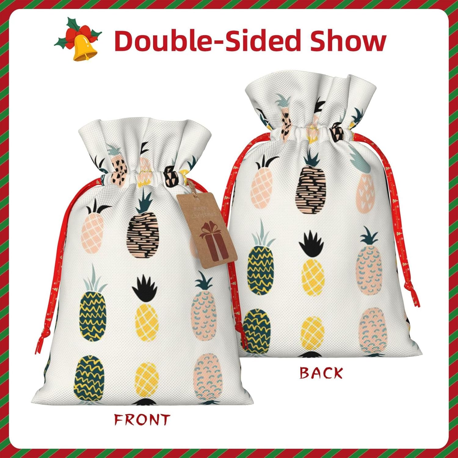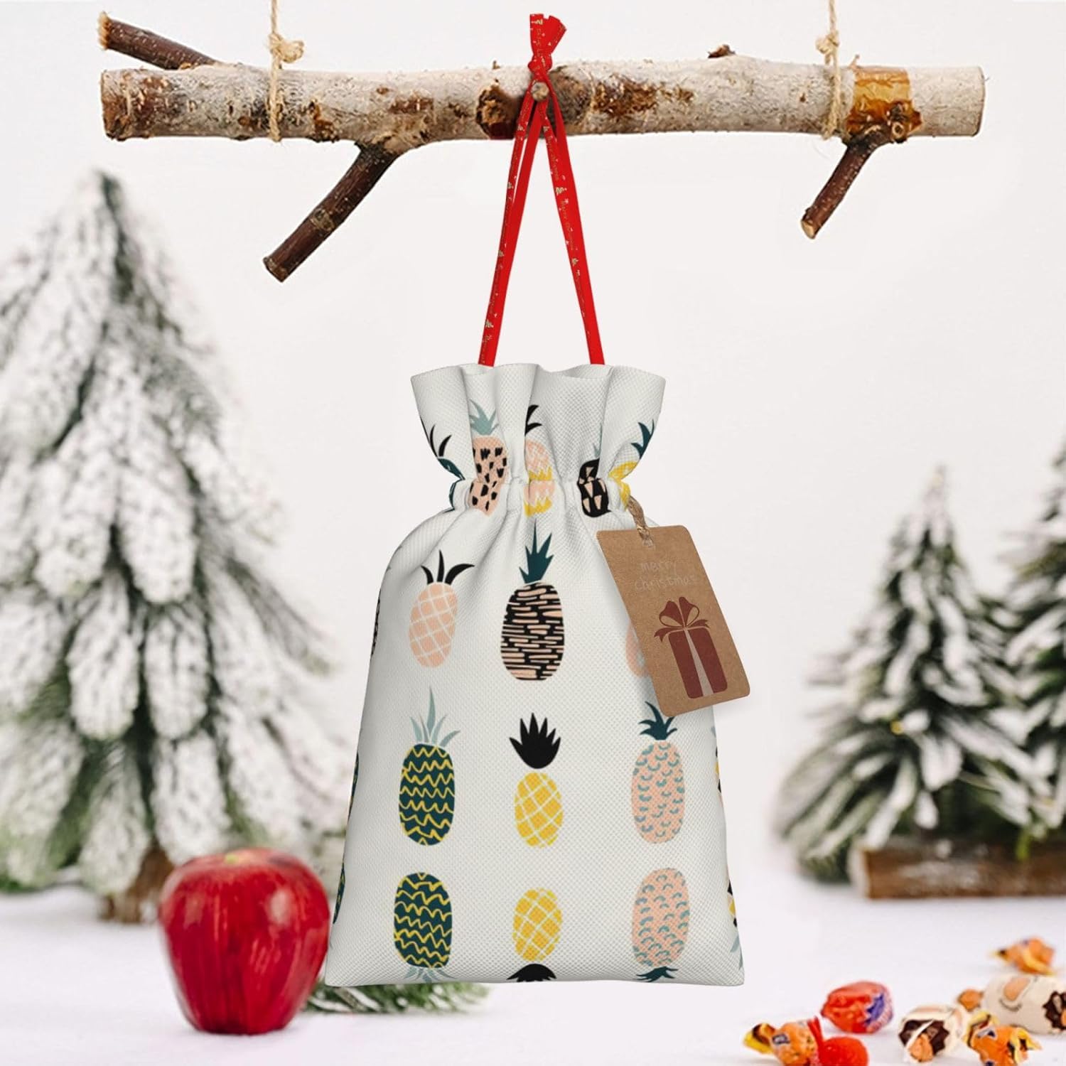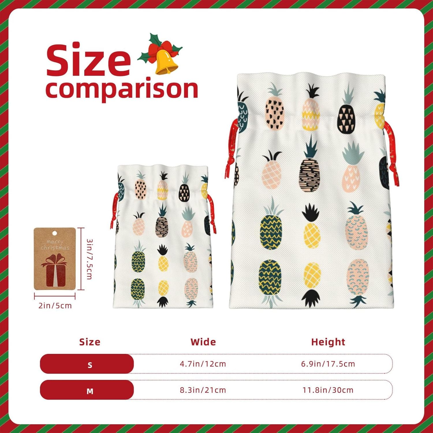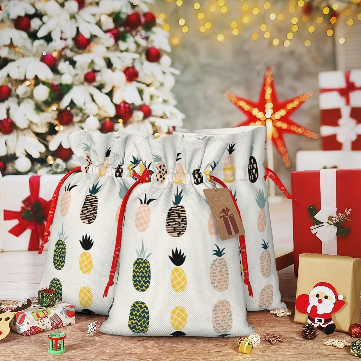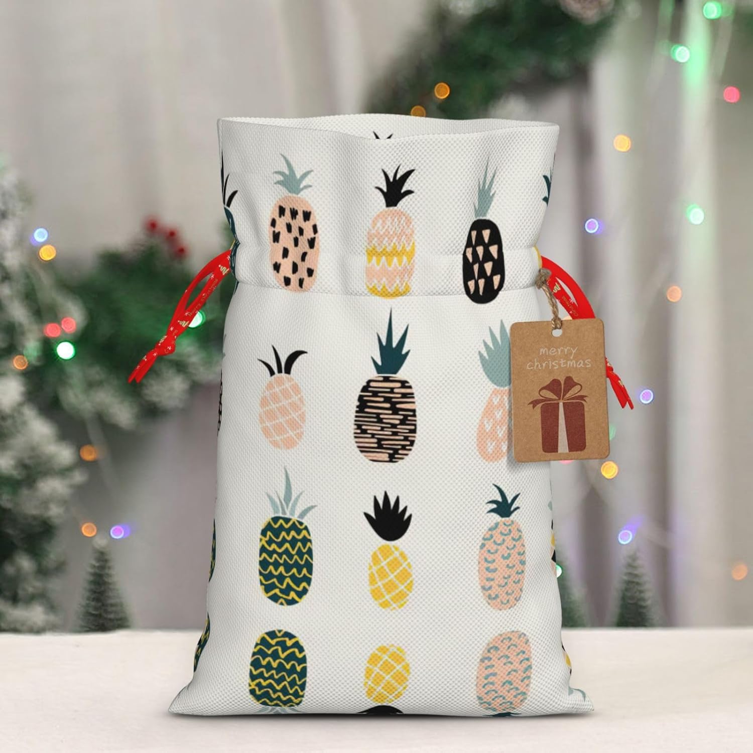 BORSE REGALO DI ALTO VALORE: la borsa a forma di ananas è dotata di sacchetti regalo con cordoncini colorati ed etichette. I sacchetti regalo sono aggiornati con un design con chiusura a coulisse, sacchetti regalo realizzati in poliestere, resistenti e riutilizzabili. Non si strappano come la carta, ottimi per incartare i regali. 10 secondi per incartare un regalo: il sacchetto all'ananas per confezionare facilmente i regali, è facile da usare, basta inserire il regalo nei sacchetti, far scorrere l'etichetta regalo attraverso il nastro, tirare il nastro, annodare un fiocco e il gioco è fatto. Puoi evitare il fastidio associato a carta da imballaggio, forbici, nastro adesivo e nastro, risparmiare tempo e molto conveniente. Dimensioni del sacchetto regalo: i sacchetti regalo in 2 dimensioni possono soddisfare le preferenze di diverse persone e sono sufficienti per l'uso quotidiano e la festa di Natale. La S misura 12 x 17,5 cm e la M misura 12 x 30 cm. Sacchetti regalo in formati assortiti sfusi, perfetti per confezionare regali di diverse dimensioni. Regalo nel regalo: questi sacchetti regalo con ananas possono essere riutilizzati più volte. Un set di sacchetti regalo riutilizzabili sarà un'aggiunta meravigliosa a qualsiasi regalo e migliorerà l'esperienza complessiva del regalo. Inoltre, abbiamo rinforzato il fondo per una maggiore stabilità e una struttura robusta con carichi pesanti. Non facile da rompere per un uso durevole e duraturo. Sacchetti regalo multifunzionali: questi sacchetti regalo di Natale a forma di ananas possono essere utilizzati per conservare regali di Natale, giocattoli, bambole, cappelli di Natale, caramelle e regali durante la festa di Natale. Conservare i regali in questa borsa darà ai bambini più sorprese perché non sanno cosa c'è dentro.