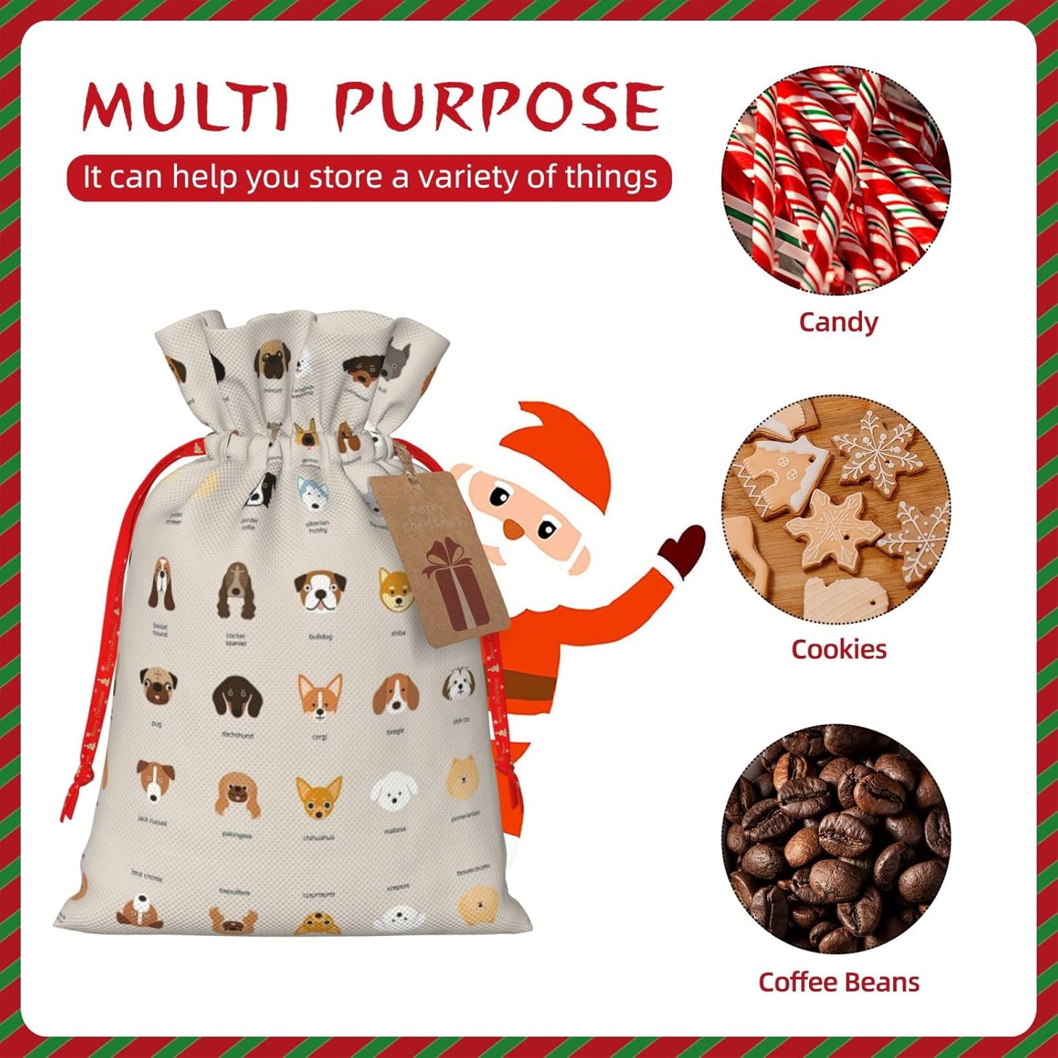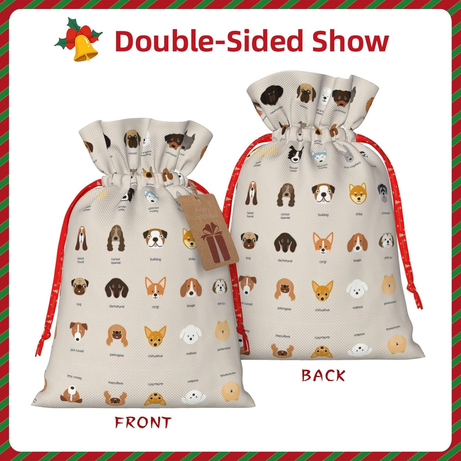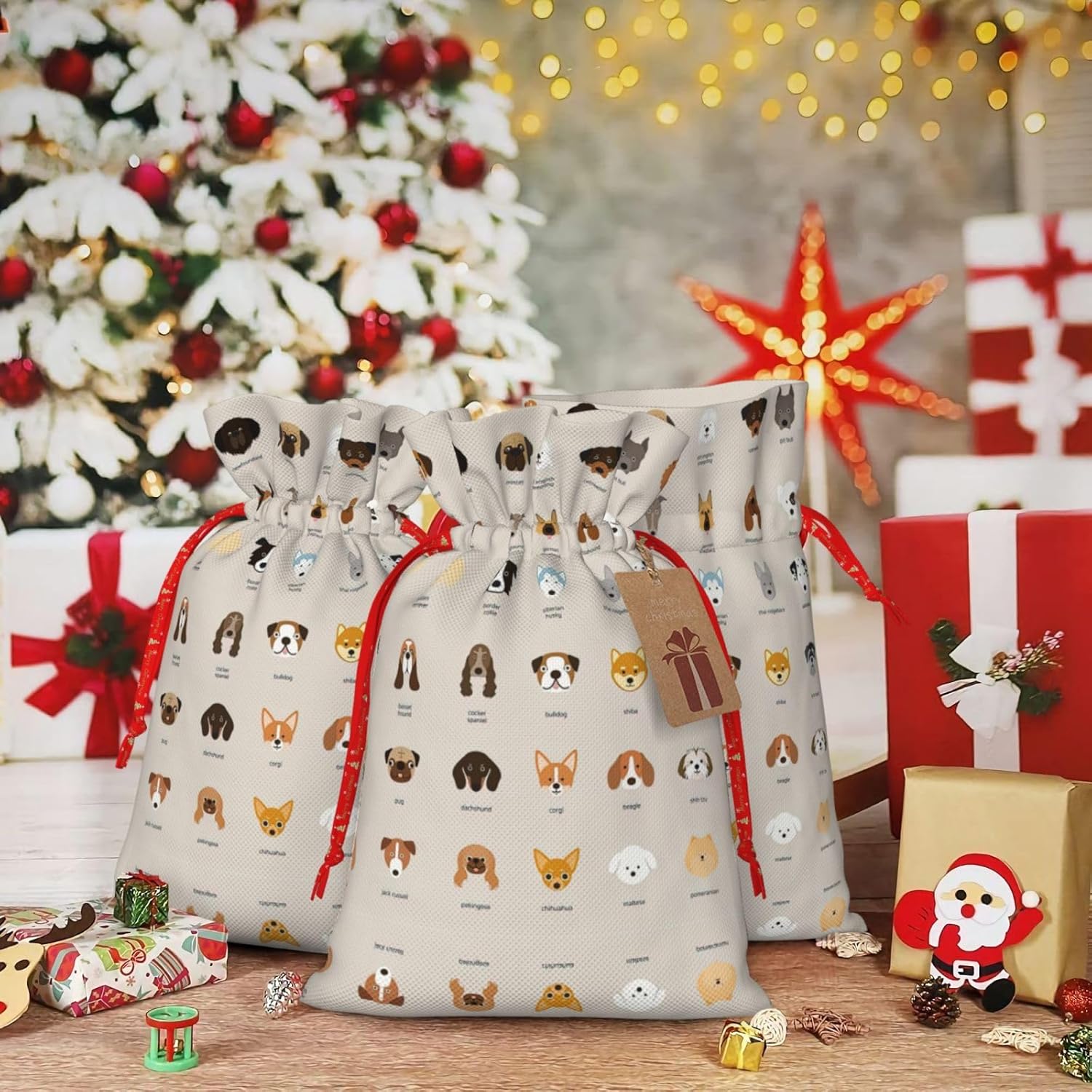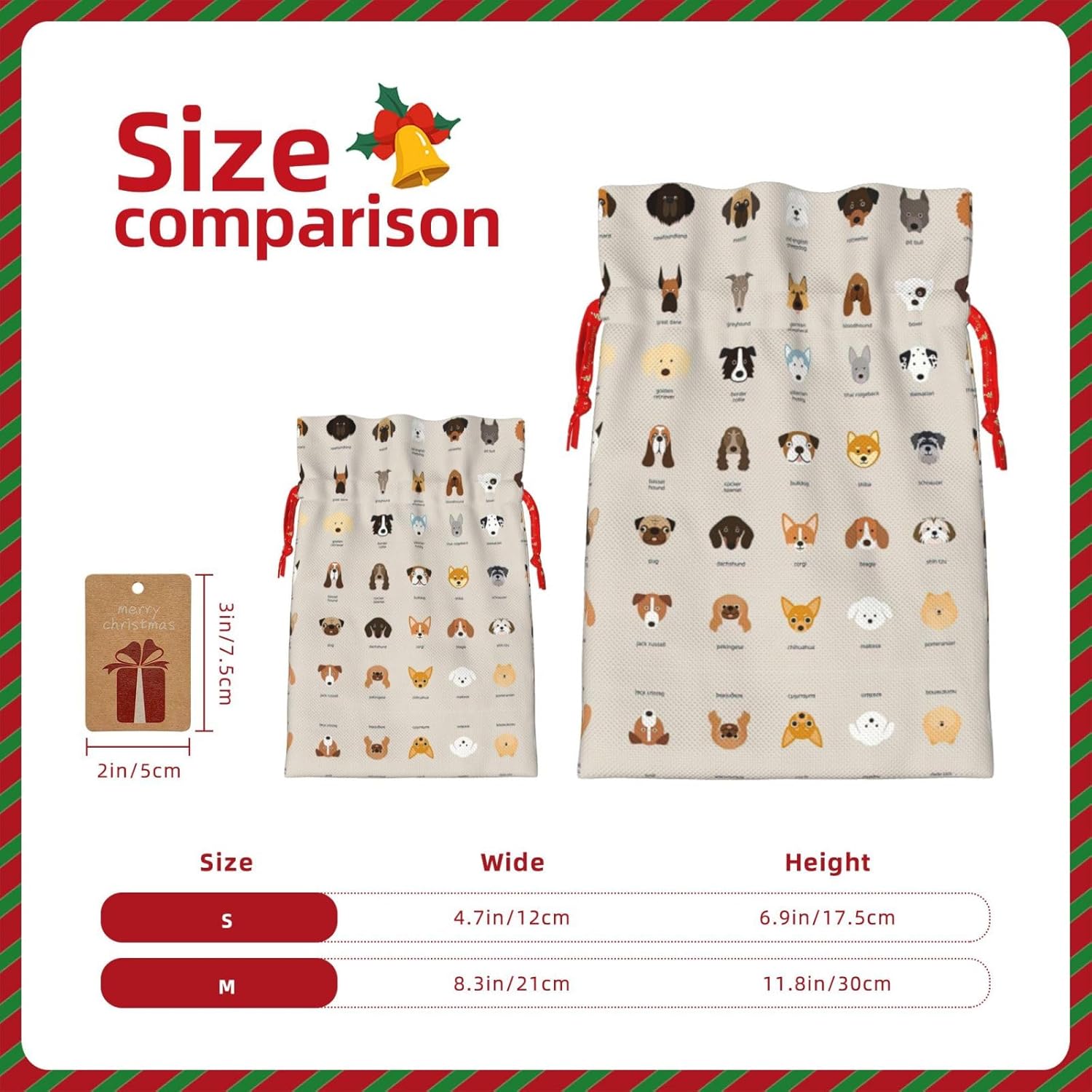 BORSE REGALO DI ALTO VALORE: la borsa per razze di cani è dotata di sacchetti regalo con cordoncini colorati ed etichette. I sacchetti regalo sono aggiornati con un design con chiusura a coulisse, sacchetti regalo realizzati in poliestere, resistenti e riutilizzabili. Non si strappano come la carta, ottimi per incartare i regali. 10 secondi per incartare un regalo: la borsa per cani per confezionare facilmente i regali, è facile da usare, basta inserire il regalo nelle buste, far scorrere l'etichetta regalo attraverso il nastro, tirare il nastro, annodare un fiocco e il gioco è fatto. Puoi evitare il fastidio associato a carta da imballaggio, forbici, nastro adesivo e nastro, risparmiare tempo e molto conveniente. Dimensioni del sacchetto regalo: i sacchetti regalo in 2 dimensioni possono soddisfare le preferenze di diverse persone e sono sufficienti per l'uso quotidiano e la festa di Natale. La S misura 12 x 17,5 cm e la M misura 12 x 30 cm. Sacchetti regalo in formati assortiti sfusi, perfetti per confezionare regali di diverse dimensioni. REGALO NEL REGALO: questi sacchetti regalo di razza canina possono essere riutilizzati più volte. Un set di sacchetti regalo riutilizzabili sarà un'aggiunta meravigliosa a qualsiasi regalo e migliorerà l'esperienza complessiva del regalo. Inoltre, abbiamo rinforzato il fondo per una maggiore stabilità e una struttura robusta con carichi pesanti. Non facile da rompere per un uso durevole e duraturo. Sacchetti regalo multifunzionali: questi sacchetti regalo natalizi per cani possono essere utilizzati per conservare regali di Natale, giocattoli, bambole, cappelli natalizi, caramelle e regali durante una festa di Natale. Conservare i regali in questa borsa darà ai bambini più sorprese perché non sanno cosa c'è dentro.