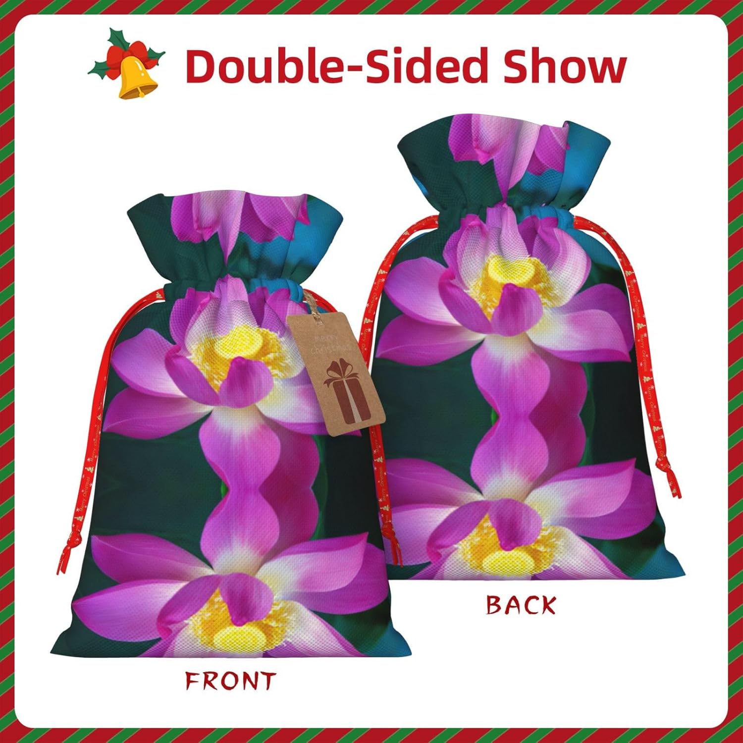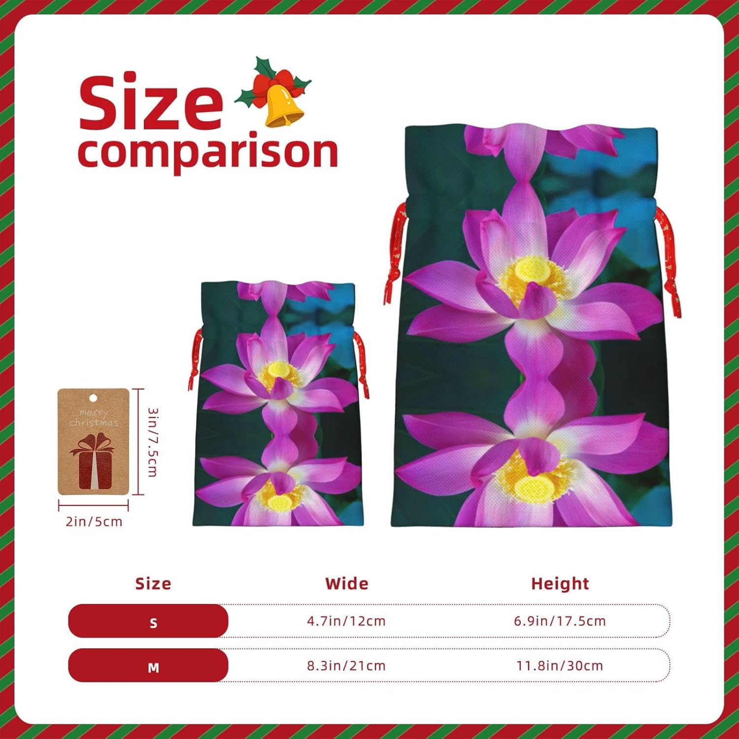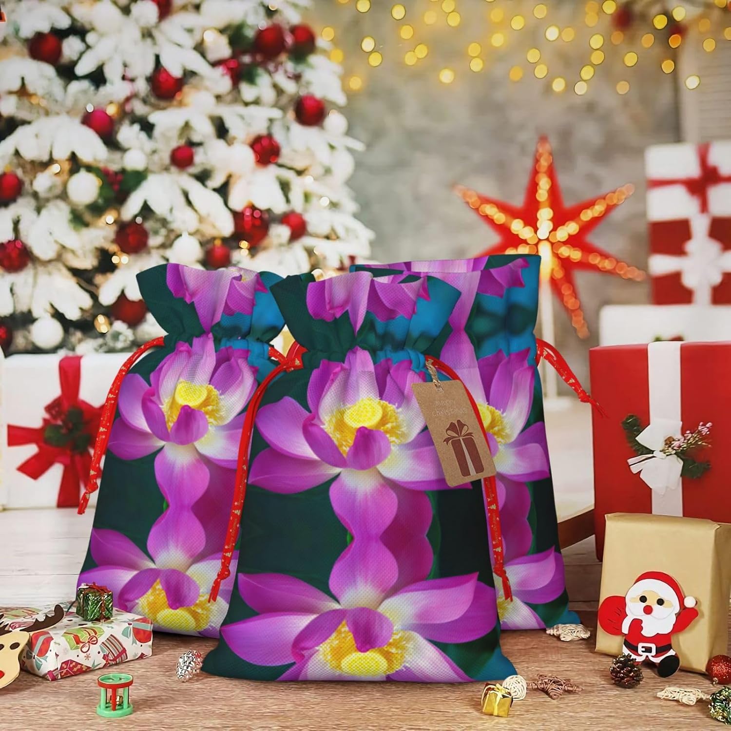 BORSE REGALO DI ALTO VALORE: la borsa con fiori di loto è dotata di sacchetti regalo con cordoncini colorati ed etichette. I sacchetti regalo sono aggiornati con un design con chiusura a coulisse, sacchetti regalo realizzati in poliestere, resistenti e riutilizzabili. Non si strappano come la carta, ottimi per incartare i regali. 10 secondi per incartare un regalo: il sacchetto con fiori di loto per confezionare facilmente i regali, è facile da usare, basta inserire il regalo nei sacchetti, far scorrere l'etichetta regalo attraverso il nastro, tirare il nastro, annodare un fiocco e il gioco è fatto. Puoi evitare il fastidio associato a carta da imballaggio, forbici, nastro adesivo e nastro, risparmiare tempo e molto conveniente. Dimensioni del sacchetto regalo: i sacchetti regalo in 2 dimensioni possono soddisfare le preferenze di diverse persone e sono sufficienti per l'uso quotidiano e la festa di Natale. La S misura 12 x 17,5 cm e la M misura 12 x 30 cm. Sacchetti regalo in formati assortiti sfusi, perfetti per confezionare regali di diverse dimensioni. Regalo nel regalo: questi sacchetti regalo con fiori di loto possono essere riutilizzati molte volte. Un set di sacchetti regalo riutilizzabili sarà un'aggiunta meravigliosa a qualsiasi regalo e migliorerà l'esperienza complessiva del regalo. Inoltre, abbiamo rinforzato il fondo per una maggiore stabilità e una struttura robusta con carichi pesanti. Non facile da rompere per un uso durevole e duraturo. Sacchetti regalo multifunzionali: questi sacchetti di fiori di loto possono essere utilizzati per conservare regali di Natale, giocattoli, bambole, cappelli di Natale, caramelle e regali durante una festa di Natale. Conservare i regali in questa borsa darà ai bambini più sorprese perché non sanno cosa c'è dentro.