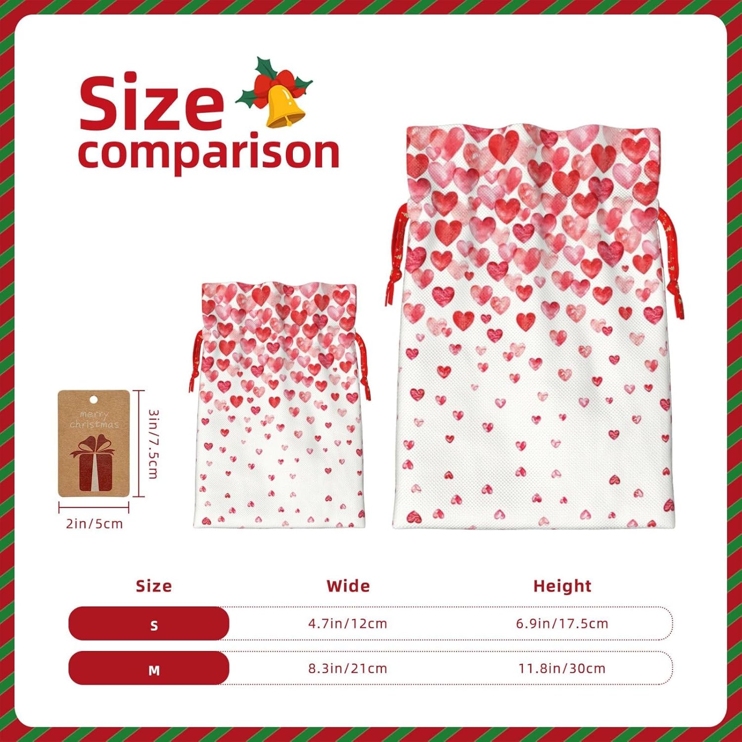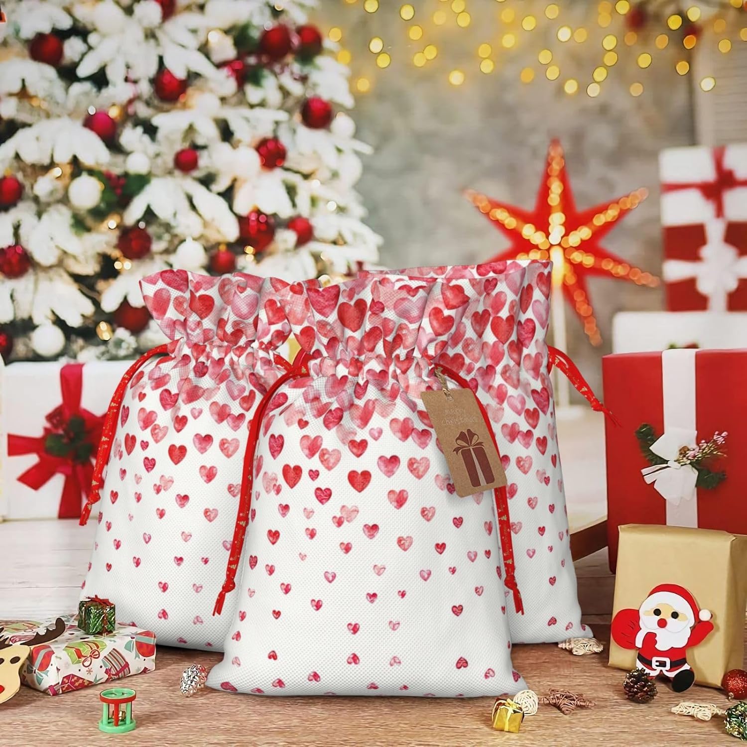 BORSE REGALO DI ALTO VALORE: la borsa con cuori rossi cadenti è dotata di sacchetti regalo con cordoncini colorati ed etichette. I sacchetti regalo sono aggiornati con un design con chiusura a coulisse, sacchetti regalo realizzati in poliestere, resistenti e riutilizzabili. Non si strappano come la carta, ottimi per incartare i regali. 10 secondi per incartare un regalo: il sacchetto a forma di cuori rossi per confezionare facilmente i regali, è facile da usare, basta inserire il regalo nei sacchetti, far scorrere l'etichetta regalo attraverso il nastro, tirare il nastro, annodare un fiocco e il gioco è fatto. Puoi evitare il fastidio associato a carta da imballaggio, forbici, nastro adesivo e nastro, risparmiare tempo e molto conveniente. Dimensioni del sacchetto regalo: i sacchetti regalo in 2 dimensioni possono soddisfare le preferenze di diverse persone e sono sufficienti per l'uso quotidiano e la festa di Natale. La S misura 12 x 17,5 cm e la M misura 12 x 30 cm. Sacchetti regalo in formati assortiti sfusi, perfetti per confezionare regali di diverse dimensioni. Regalo nel regalo: questi sacchetti regalo a forma di cuore rosso possono essere riutilizzati più volte. Un set di sacchetti regalo riutilizzabili sarà un'aggiunta meravigliosa a qualsiasi regalo e migliorerà l'esperienza complessiva del regalo. Inoltre, abbiamo rinforzato il fondo per una maggiore stabilità e una struttura robusta con carichi pesanti. Non facile da rompere per un uso durevole e duraturo. Sacchetti regalo multifunzionali: questi sacchetti regalo di Natale con cuori rossi possono essere utilizzati per conservare regali di Natale, giocattoli, bambole, cappelli di Natale, caramelle e regali durante la festa di Natale. Conservare i regali in questa borsa darà ai bambini più sorprese perché non sanno cosa c'è dentro.