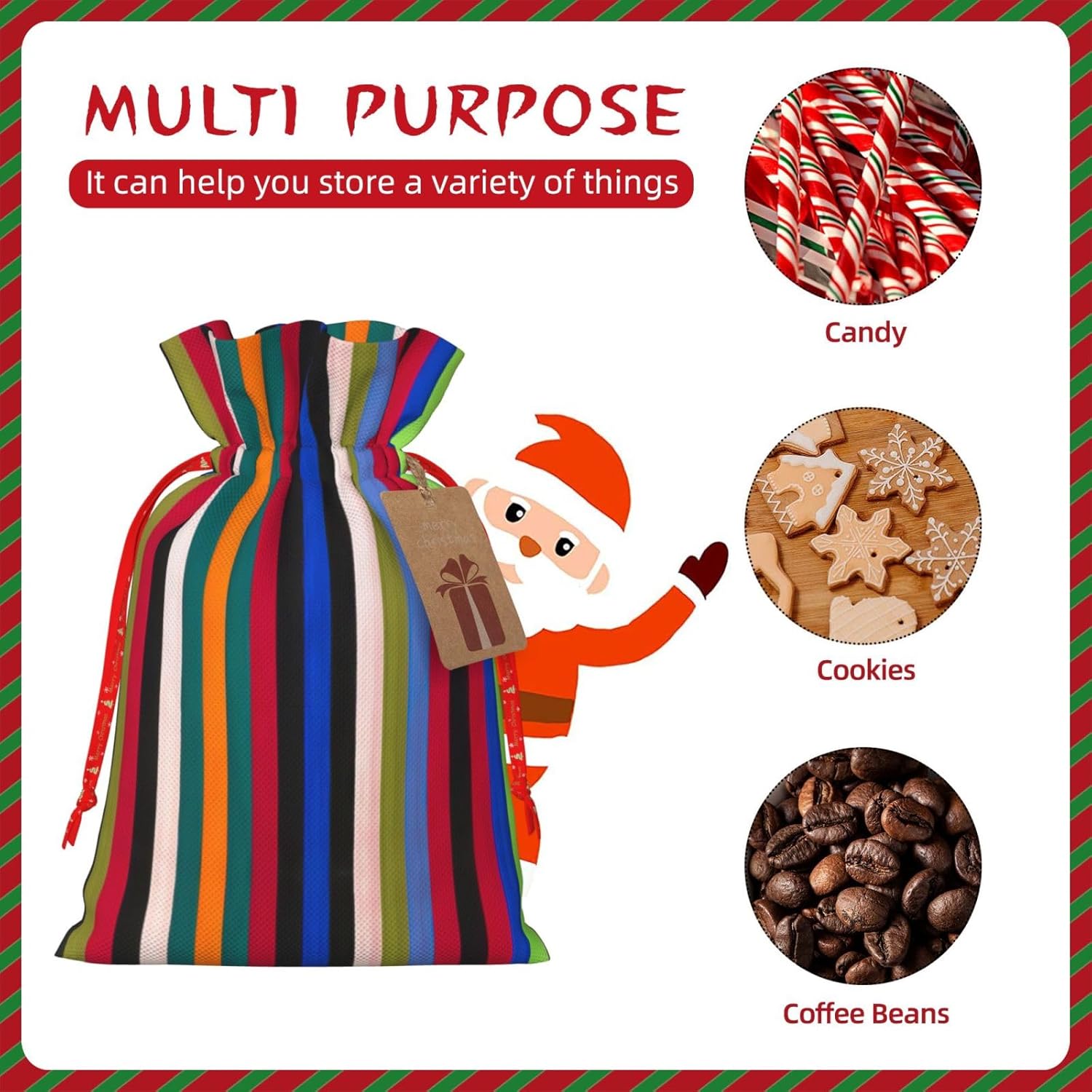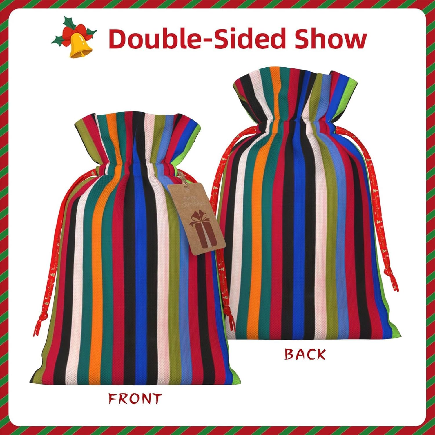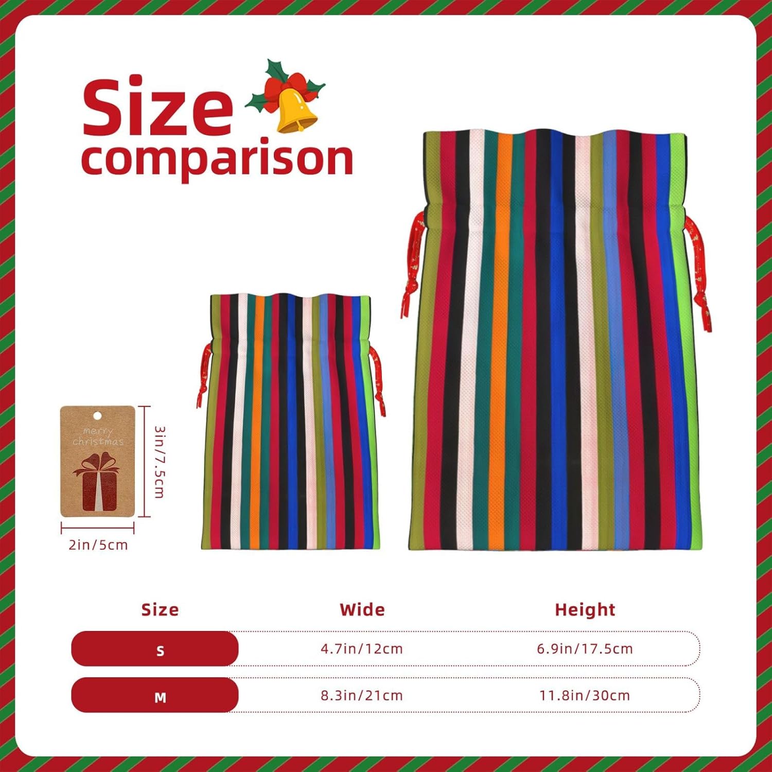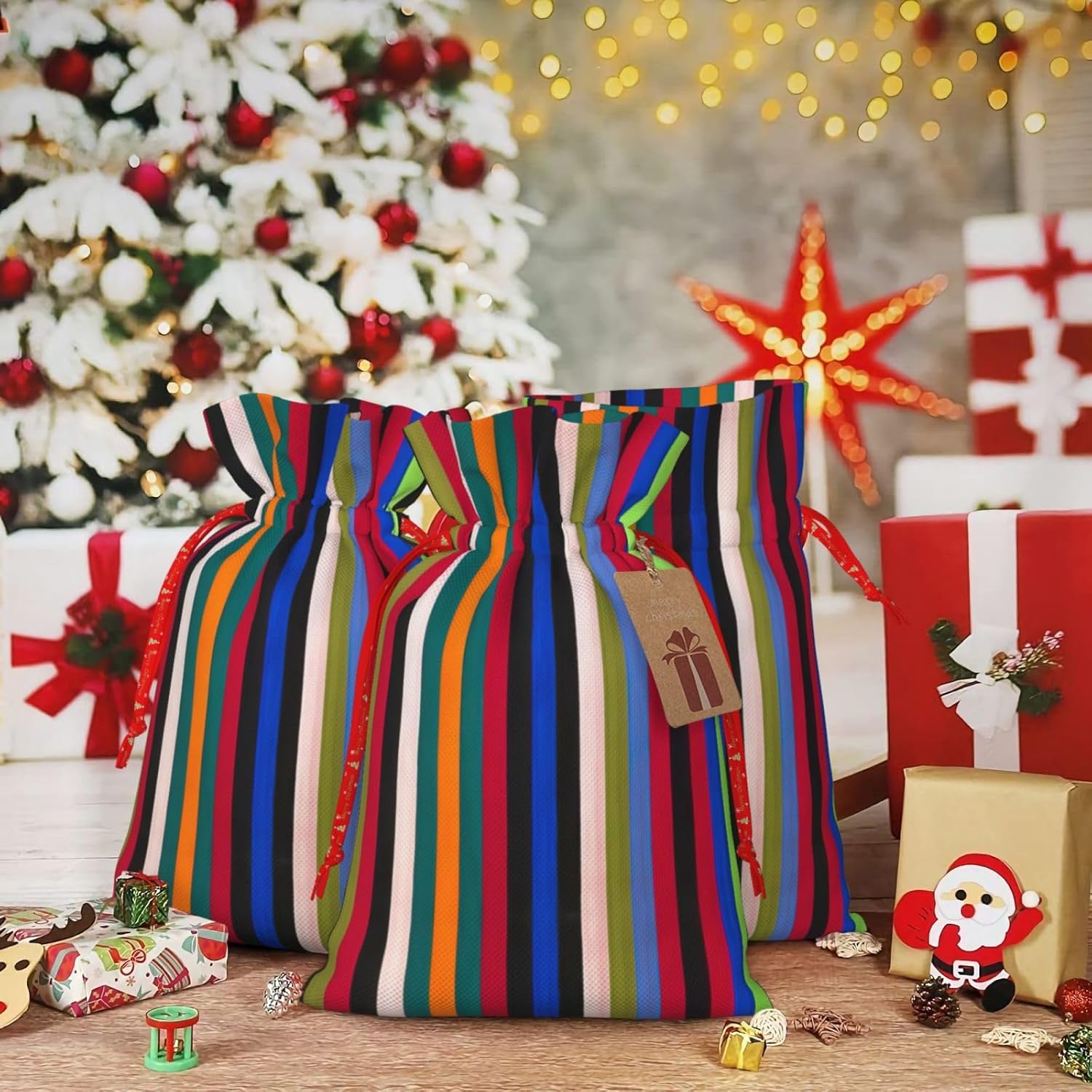 BORSE REGALO DI ALTO VALORE: la borsa tote verticale a righe colorate è dotata di sacchetti regalo con cordoncini colorati ed etichette. I sacchetti regalo sono aggiornati con un design con chiusura a coulisse, sacchetti regalo realizzati in poliestere, resistenti e riutilizzabili. Non si strappano come la carta, ottimi per incartare i regali. 10 secondi per incartare un regalo: il sacchetto verticale a strisce colorate per confezionare facilmente i regali, è facile da usare, basta inserire il regalo nei sacchetti, far scorrere l'etichetta regalo attraverso il nastro, tirare il nastro, annodare un fiocco e il gioco è fatto. Puoi evitare il fastidio associato a carta da imballaggio, forbici, nastro adesivo e nastro, risparmiare tempo e molto conveniente. Dimensioni del sacchetto regalo: i sacchetti regalo in 2 dimensioni possono soddisfare le preferenze di diverse persone e sono sufficienti per l'uso quotidiano e la festa di Natale. La S misura 12 x 17,5 cm e la M misura 12 x 30 cm. Sacchetti regalo in formati assortiti sfusi, perfetti per confezionare regali di diverse dimensioni. REGALO NEL REGALO: questi sacchetti regalo colorati a strisce verticali possono essere riutilizzati molte volte. Un set di sacchetti regalo riutilizzabili sarà un'aggiunta meravigliosa a qualsiasi regalo e migliorerà l'esperienza complessiva del regalo. Inoltre, abbiamo rinforzato il fondo per una maggiore stabilità e una struttura robusta con carichi pesanti. Non facile da rompere per un uso durevole e duraturo. Sacchetti regalo multifunzionali: questi sacchetti verticali a strisce colorate possono essere utilizzati per conservare regali di Natale, giocattoli, bambole, cappelli di Natale, caramelle e regali durante una festa di Natale. Conservare i regali in questa borsa darà ai bambini più sorprese perché non sanno cosa c'è dentro.