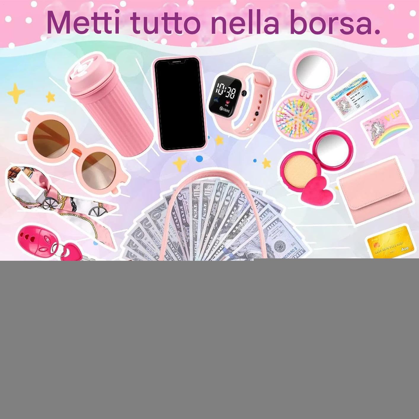 Resistenza Assoluta: La combinazione di gomma e spugna garantisce superfici levigate, lunga durata nel e massima tranquillità durante il gioco per bambini piccoli Regalo Creativo: Progettata per incarnare il sogno principesco delle bambine, questa borsa potenzia l'autostima nei giochi di gruppo, stimola la creatività e diventa un regalo memorabile per feste di compleanno o celebrazioni, arricchendo i momenti quotidiani in famiglia Maneggevolezza: Chiusura robusta permette di riordinare in sicurezza il set completo di accessori inclusa la sciarpa alla moda, potenziando nei giovani utenti la capacità di esplorare la creatività e affinare la percezione dello stile con attività divertenti Sviluppo Cognitivo: Attraverso l'uso di carte e monete giocattolo in scenari di vita reale, potenzia le competenze comunicative e la logica dei bambini durante attività di gioco simbolico. Gioco Coinvolgente: Stimola il divertimento nel gioco di ruolo con accessori come borsette, telefoni e orologi che incoraggiano storie interattive e sviluppano abilità sociali durante il gioco per bambine piccole