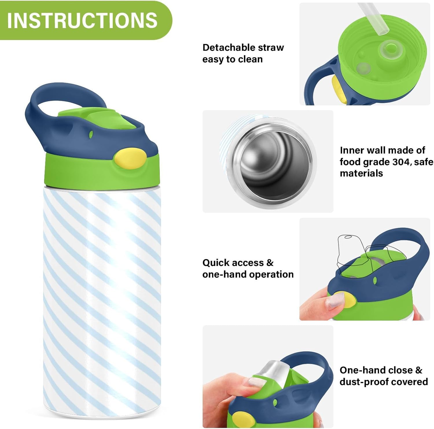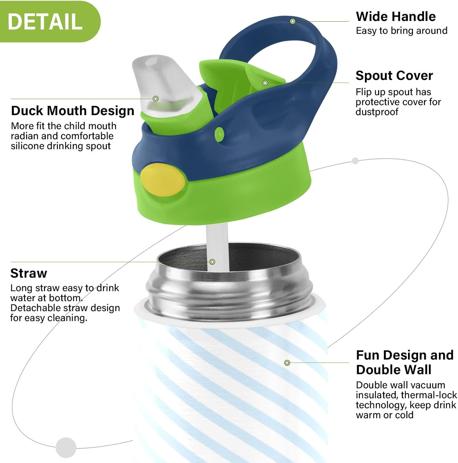 Materiali di qualità: la borraccia per bambini (19,5 x 7 cm) utilizza tritan e silicone alimentare. Ideale per pratica sportiva o picnic. Non adatta a bambini di età inferiore ai 3 anni Design portatile: l'ampio manico e il gancio per coperchio rendono le bottiglie d'acqua sportive facili da trasportare. I bambini possono appenderlo alle loro borse, evitando il fastidio di cadere durante la ricreazione o i viaggi in autobus. Funzionamento con una sola mano: il becco d'anatra si adatta alla bocca dei bambini, con una copertura antipolvere. L'interruttore a pulsante della borraccia per bambini è semplice da usare con una sola mano, in modo che i bambini possano bere mentre tengono una palla o un notebook. Blocco di sicurezza: il blocco del pulsante impedisce lo scoppio accidentale del becco d'anatra. Previene le perdite quando viene gettato nello zaino, mantenendo asciutti snack e compiti. Facile da pulire: tutte le parti della borraccia sono rimovibili per una pulizia accurata senza sporcare. Usa un detergente neutro e acqua calda: semplice per i genitori mantenere la pulizia per l'uso quotidiano.