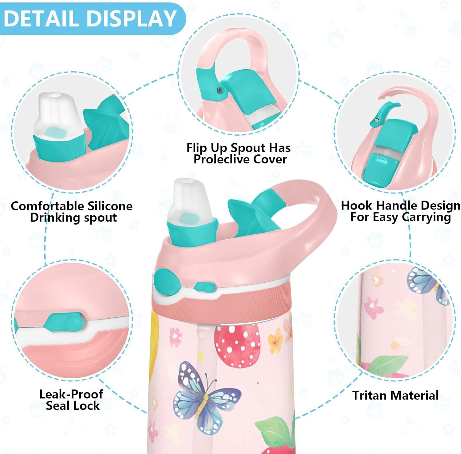 Materiale: questa borraccia da 16 x 7,5 cm con capacità di 480 ml è realizzata in tritan e silicone alimentare. Perfetto per le giornate scolastiche o per lo sport, è privo di elementi nocivi, affrontando le preoccupazioni dei genitori sui materiali non sicuri. Non adatto a bambini di età inferiore ai 3 anni! Design portatile: l'ampio manico e il gancio per coperchio rendono la borraccia per bambini facile da trasportare. I bambini possono appenderlo alle loro borse, evitando il fastidio di cadere durante la ricreazione o i viaggi in autobus. Funzionamento amichevole: il becco d'anatra si adatta bene, con una copertura antipolvere. L'interruttore a pulsante delle bottiglie d'acqua sportive consente l'uso con una sola mano, in modo che i bambini possano idratarsi senza mettere giù i loro giocattoli o attrezzi sportivi. Blocco per evitare fuoriuscite: il blocco del pulsante della bottiglia d'acqua impedisce al becco d'anatra di fuoriuscire per errore. Niente più fuoriuscite negli zaini, mantenendo il pranzo e i libri asciutti. Facile da pulire: tutte le parti della borraccia per bambini possono essere smontate per evitare l'accumulo di sporco. Pulire con detergente neutro e acqua calda.