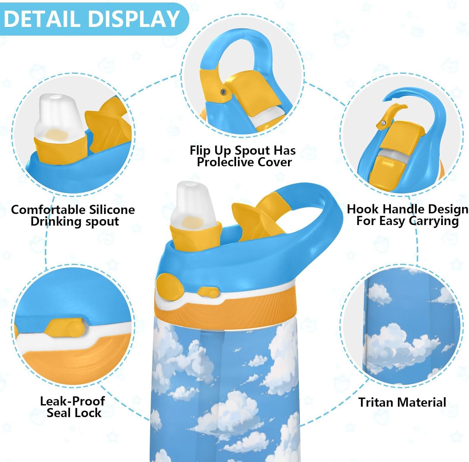 Materiale di sicurezza: corpo in Tritan e beccuccio in silicone per uso alimentare per una durata e una sicurezza Può contenere 480 ml di acqua, perfetto per l'idratazione quotidiana. Non adatto a bambini di età inferiore ai 3 anni Design portatile: l'ampia maniglia è facile da afferrare per i bambini e il gancio del coperchio consente di attaccare la bottiglia d'acqua a uno zaino. Niente più bottiglie perse durante le uscite o le attività dopo la scuola. Funzionamento intuitivo: il beccuccio d'anatra si adatta bene, con una copertura antipolvere. L'interruttore a pulsante della bottiglia d'acqua per bambini consente l'uso con una sola mano, in modo che i bambini possano idratarsi senza mettere i giocattoli o le attrezzature sportive. Previene fuoriuscite: il pulsante di blocco impedisce l'apertura accidentale del beccuccio d'anatra. Mantiene le bevande all'interno, proteggendo zaini e vestiti durante i viaggi o i giochi. Facile da pulire: tutte le parti della bottiglia d'acqua sportiva possono essere smontate per evitare l'accumulo di sporco. Pulire con detergente neutro e acqua calda.