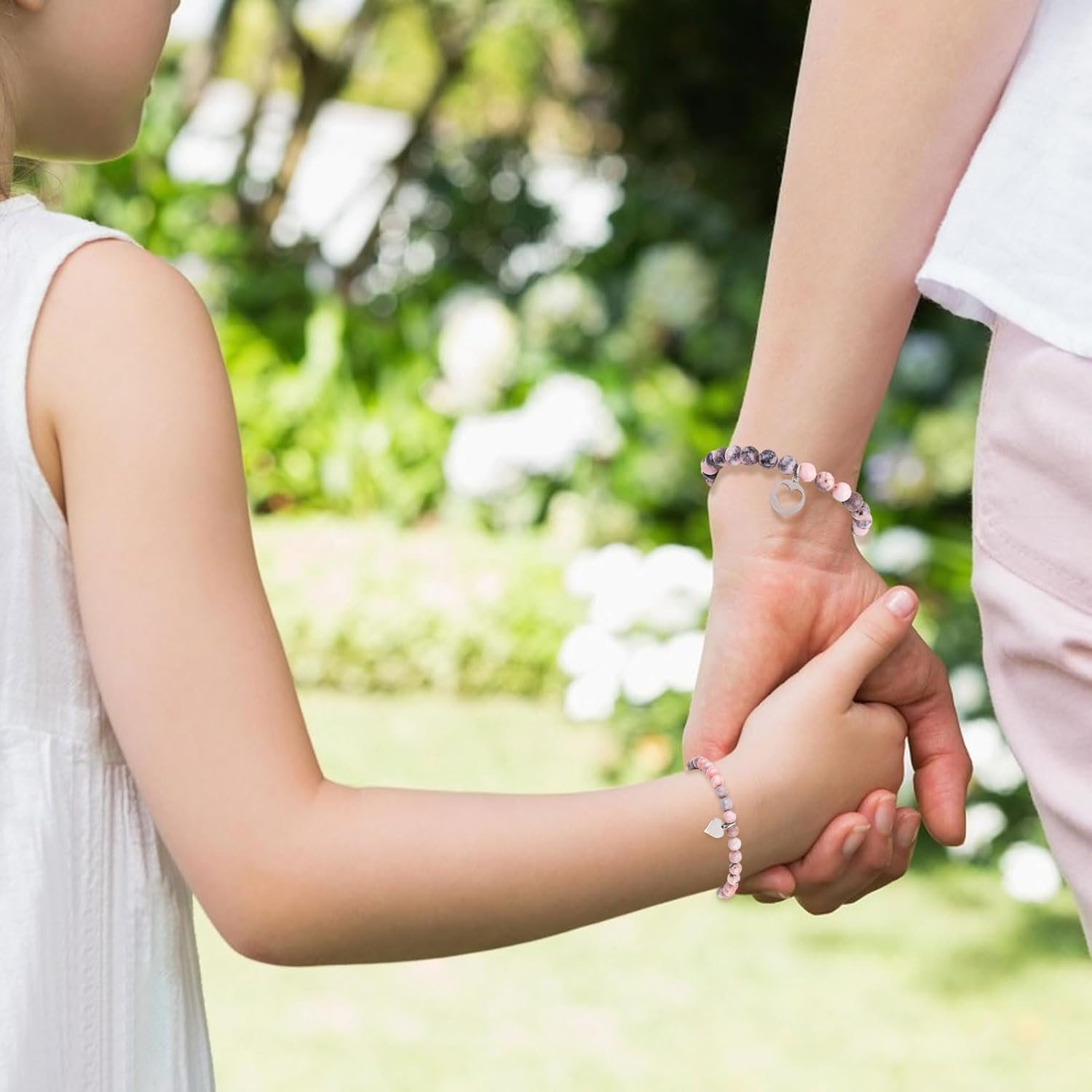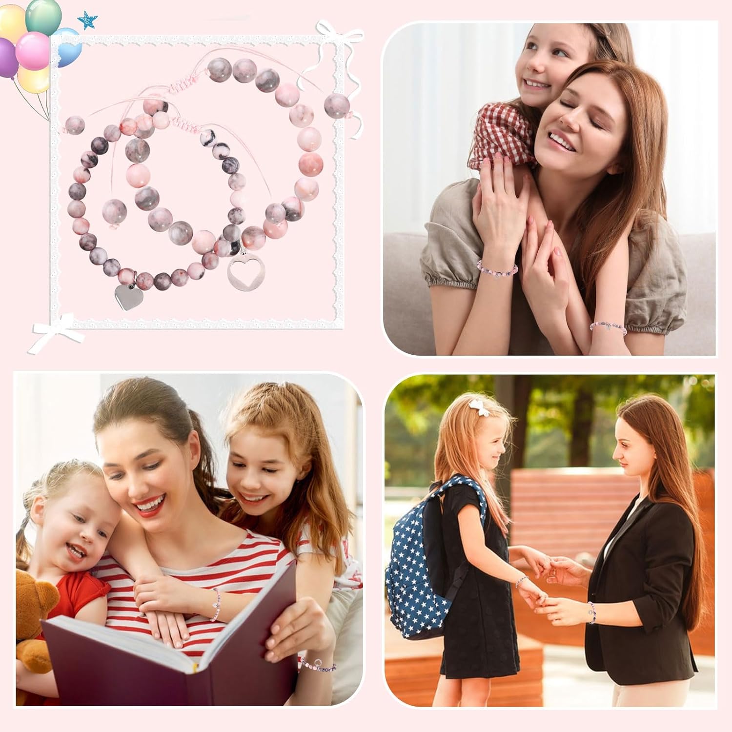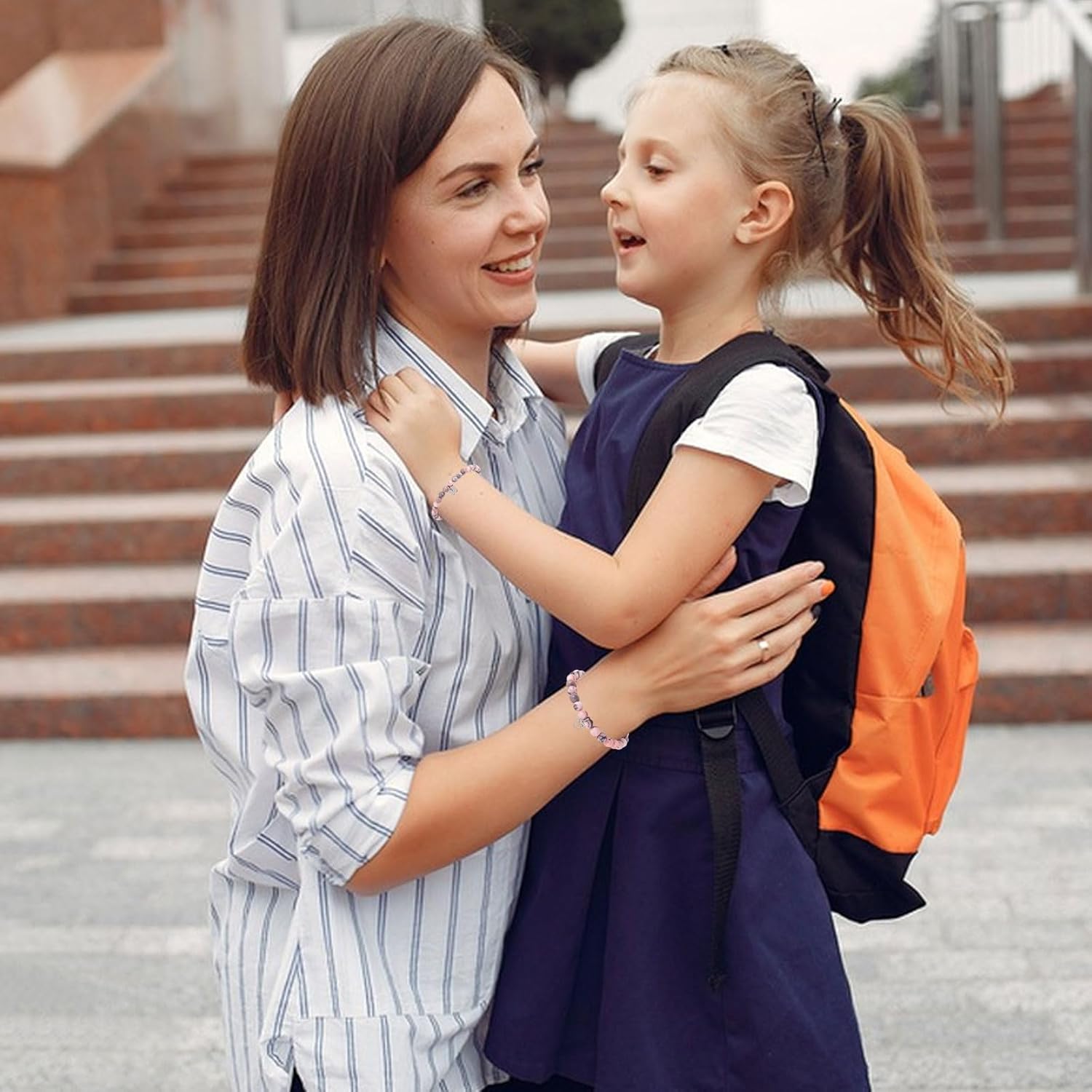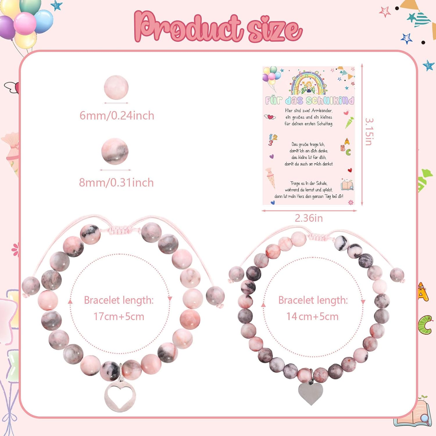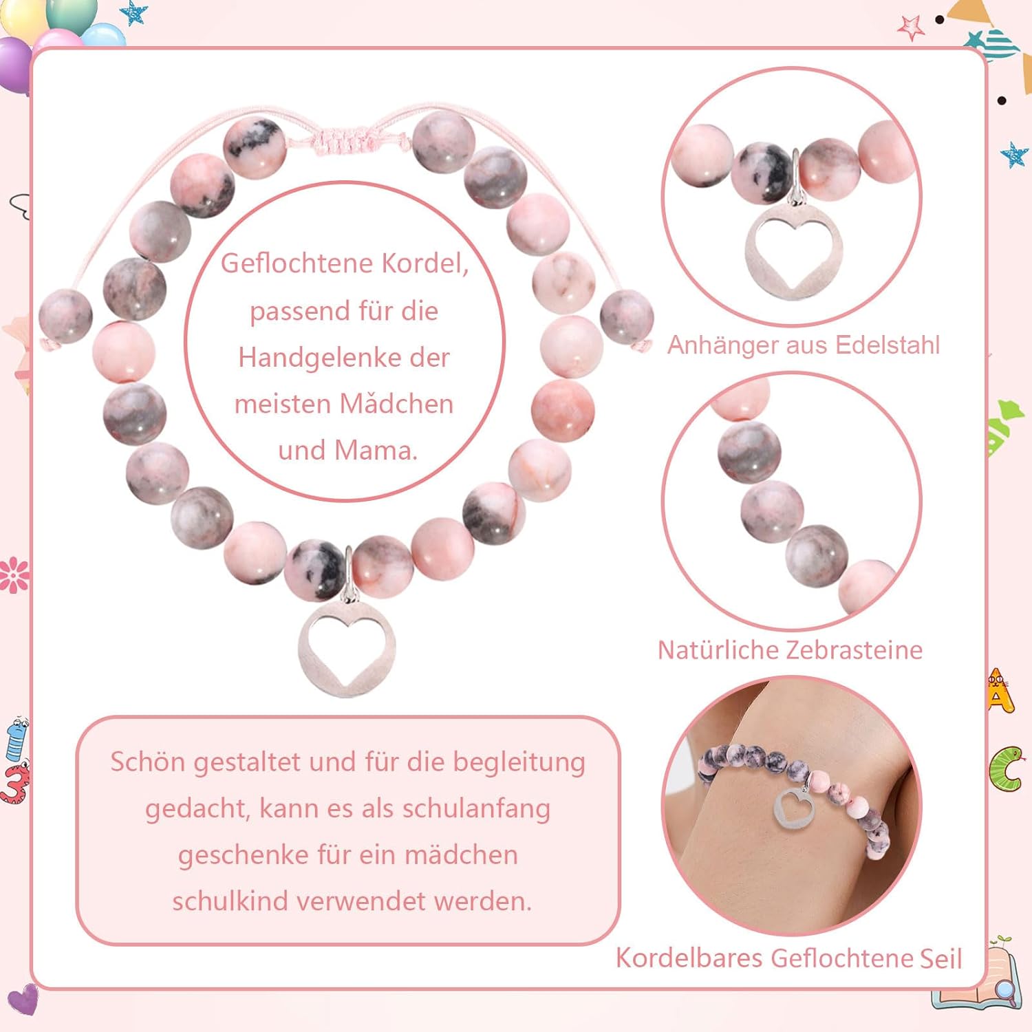I braccialetti madre-figlia per il rientro a scuola rendono visibile in modo amorevole il legame speciale tra madre e figlio. Che sia per l'inizio dell'anno scolastico, per la laurea o come simbolo di amore e incoraggiamento, sono regali significativi. Il braccialetto madre-figlia è realizzato con pietre naturali e i ciondoli del braccialetto sono in acciaio inossidabile. Con le loro proprietà ipoallergeniche e antiossidanti, sono comodi da indossare sulla pelle della maggior parte dei bambini e degli adulti. Il braccialetto per la madre è di ca. 17 cm di lunghezza e il braccialetto per la figlia è di ca. 14 centimetri di lunghezza. Il cordone intrecciato rosa è regolabile in lunghezza, elastico e non sbiadisce o si rompe facilmente. Il pacchetto di braccialetti per l'iscrizione scolastica per madre e figlia comprende due braccialetti e una tessera di iscrizione scolastica in una graziosa confezione regalo. I braccialetti sono disponibili in diversi design e si abbinano perfettamente alle uniformi scolastiche. Sono l'accessorio perfetto per la scuola e il tempo libero. Se hai domande, ti preghiamo di contattarci, ti daremo una risposta soddisfacente entro 24 ore.