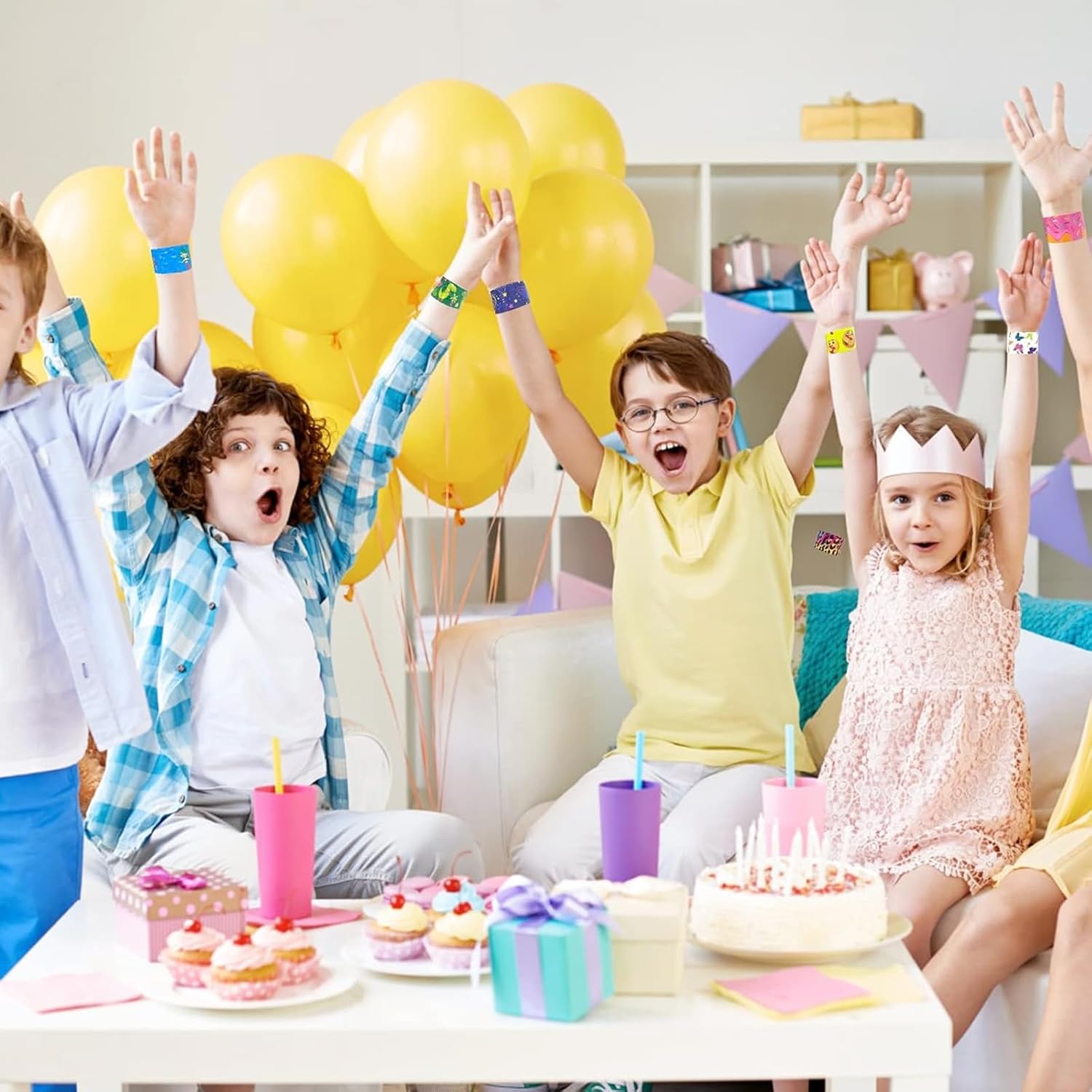 Regalo ideal y de moda para un grupo de niñas en su cumpleaños. Incluye 24 pulseras magnéticas muy coloridas con diseños diferentes para que cada participante del cumpleaños elija la que más le gusta.