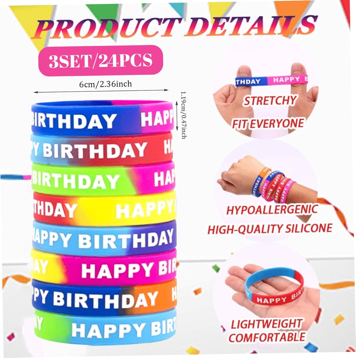 Comfort elastico: realizzati in gomma elastica, questi braccialetti adattano comodamente sia agli adulti che ai bambini, garantendo che rimangano saldamente ai polsi durante il gioco attivo senza perdere forma o spezzarsi. Facile da distribuire: leggero e compatto, ogni braccialetto è facile da distribuire singolarmente o in set, semplificando l'organizzazione per insegnanti, organizzatori di feste e coordinatori di eventi. Materiali sicuri e adatti ai bambini: Realizzati con materiali in gomma non tossici e sicuri per la pelle, questi braccialetti sono delicati sulla pelle sensibile, offrendo tranquillità a genitori ed educatori mantenendo i bambini eleganti. Varietà di colori vivaci: il set comprende 24 braccialetti di gomma elastica colorata che donano un'atmosfera vivace e festosa a qualsiasi evento, perfetti per rallegrare compleanni, aule, feste e carnevali con tonalità allegre. Bomboniere multiuso: ideali per feste di compleanno, premi in classe o omaggi di carnevale, questi braccialetti versatili fungono da bomboniere divertenti e convenienti che i bambini adorano collezionare e condividere.