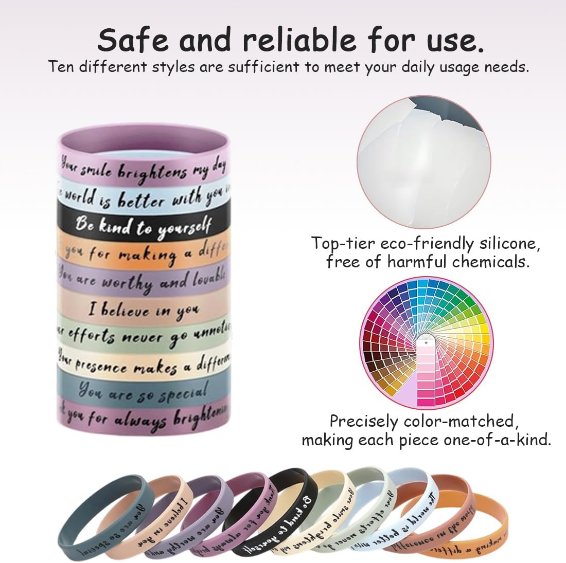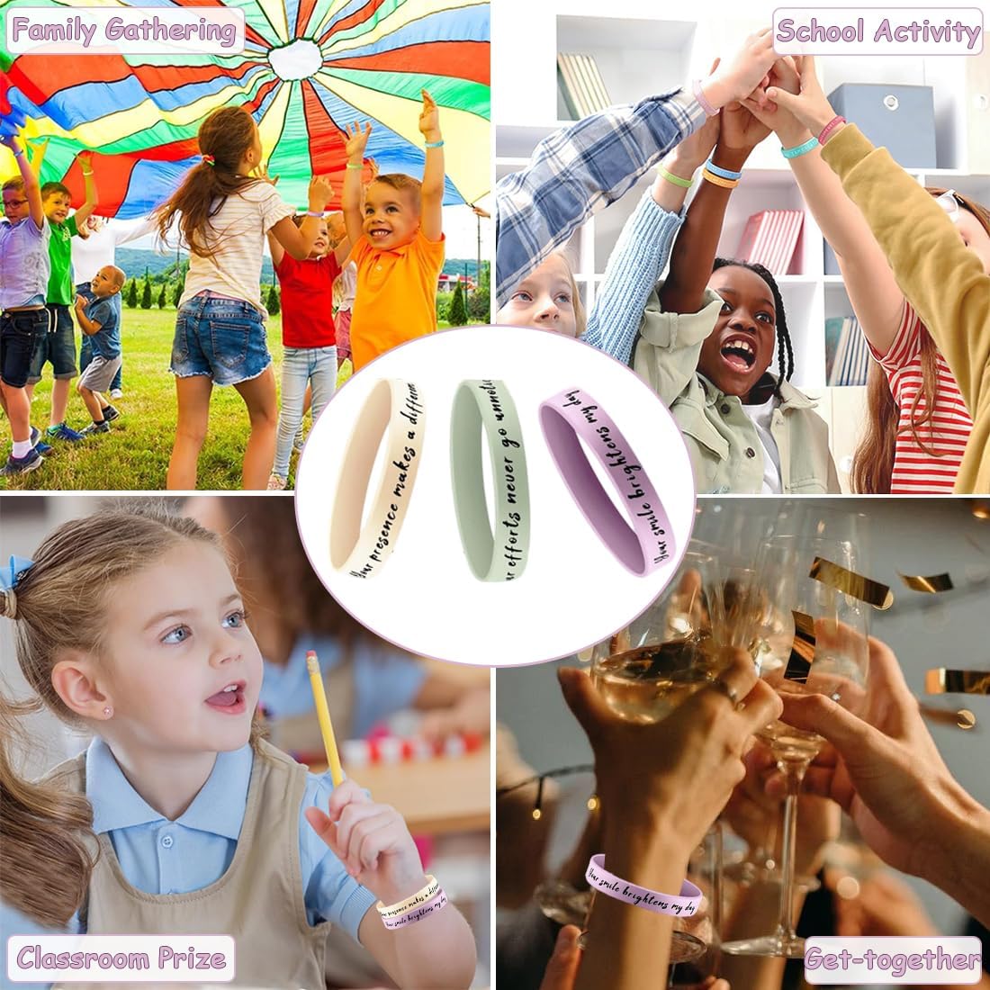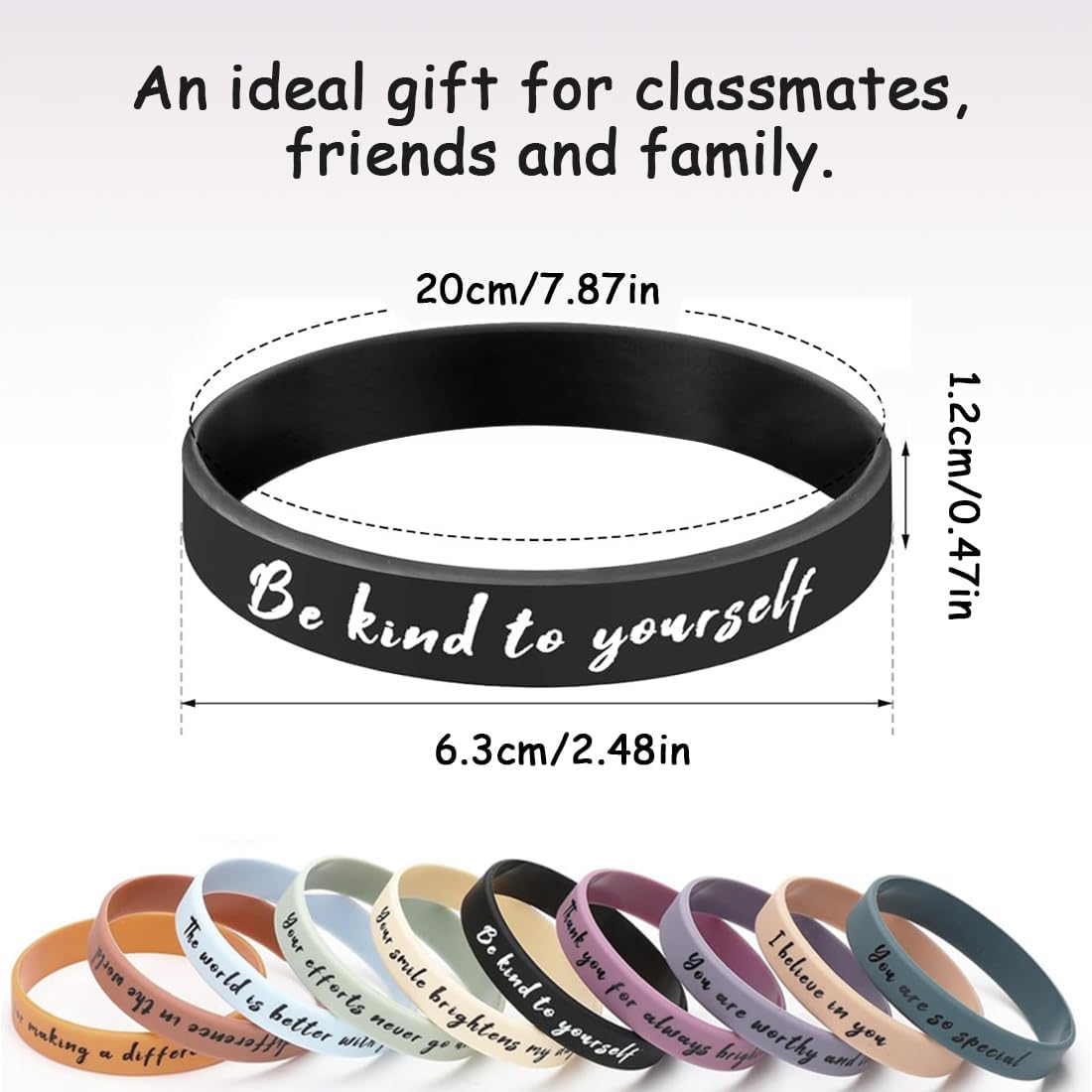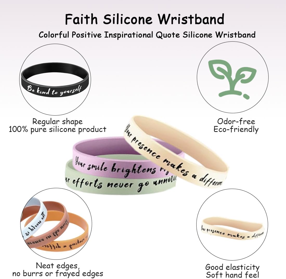 【Contenuto della confezione】: 10 braccialetti in silicone (versione inglese) stampati con frasi motivazionali in vari stili. Questi braccialetti non sono solo pratici, ma anche una fonte di ispirazione, ispirando te e gli altri e promuovendo uno stile di vita positivo e sano. 【Materiali di alta qualità】: I nostri braccialetti motivazionali in silicone sono realizzati con materiali di alta qualità, inodori, morbidi e riutilizzabili. 【Dimensioni adatte】: I braccialetti in silicone hanno una circonferenza di circa 21 cm e si adattano alla maggior parte dei polsi. 【Regalo ideale】: I nostri braccialetti in silicone sono il regalo di incoraggiamento perfetto per studenti, colleghi o membri del team. Sono ideali anche per feste a tema e cerimonie di laurea. Qualunque sia l'occasione, sono un regalo unico e significativo. 【Occasioni adatte】: I nostri braccialetti motivazionali non sono adatti solo per uso personale, ma anche per eventi sportivi, feste a tema, attività di gruppo, cerimonie di laurea e altro ancora. Sono compagni di vita positivi e stimolanti.
