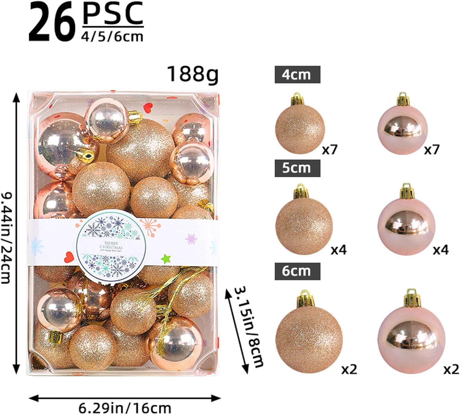 Mix e creatività: con diverse dimensioni e colori, è possibile mescolare e creare e accattivanti display, permettendo alla tua creatività di brillare durante le festività natalizie. Arcobaleno di feste: svela un mondo di splendore natalizio con questi set rettangolari contenenti un assortimento di palline di Natale colorate da 4 cm, 5 cm e 6 cm. Questi ornamenti versatili sia per spazi commerciali che per ambienti domestici. Opzioni di decorazione: sia per vestire il tuo albero di Natale, aggiungere al tuo negozio o migliorare l'atmosfera festiva della tua casa, questo set di Natale offre molteplici possibilità di decorazione. Confezione pronta per il regalo: confezionato in un elegante rettangolare, questo set non è perfetto per l'auto-decorazione, ma è anche un delizioso regalo per amici e familiari per le loro case. Versatile finezza festiva: il tuo Natale con questo assortimento di palline colorate. Dalle esposizioni scintillanti negli spazi commerciali agli ornamenti per alberi a casa, questi ornamenti offrono una finitura versatile e festosa.