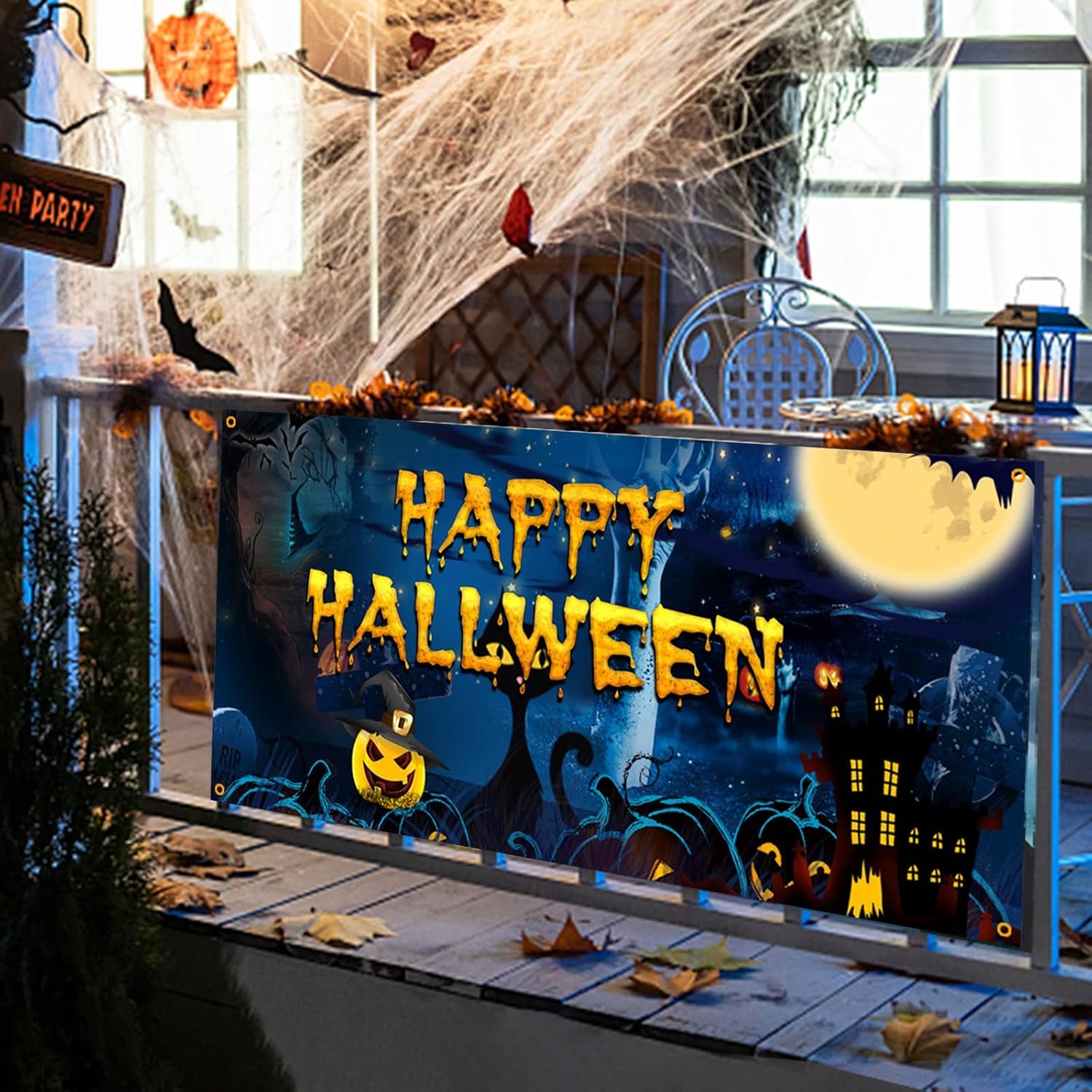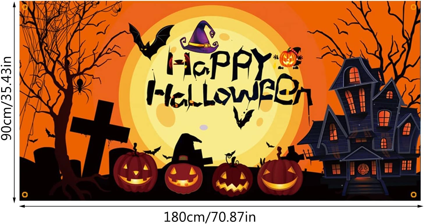 Design speciale: il design Wansheng è progettato da noi stessi. Lo striscione ha le lettere "Halloween" e i disegni di zucche, castelli e palloncini, che hanno attirato l'attenzione di tutti voi. La confezione include: uno striscione di Halloween da 180 cm x 90 cm con lettere di Halloween oversize stampate su di esso per una facile lettura. Grandi dimensioni Halloween Party Puntelli. Applicazione: molto adatto per feste di Halloween. Puoi usarlo per decorare stanze, pareti e giardini. Questo lascerà un momento indimenticabile per il tuo Halloween. Alta qualità: lo striscione di Halloween è realizzato in fibra di poliestere di alta qualità, durevole. Può essere piegato senza occupare troppo spazio. È leggero e facile da riporre e trasportare. Facile da appendere: puoi appendere la laurea con il nastro. Lo striscione ha quattro fori in acciaio che usavano per appendere con il nastro.