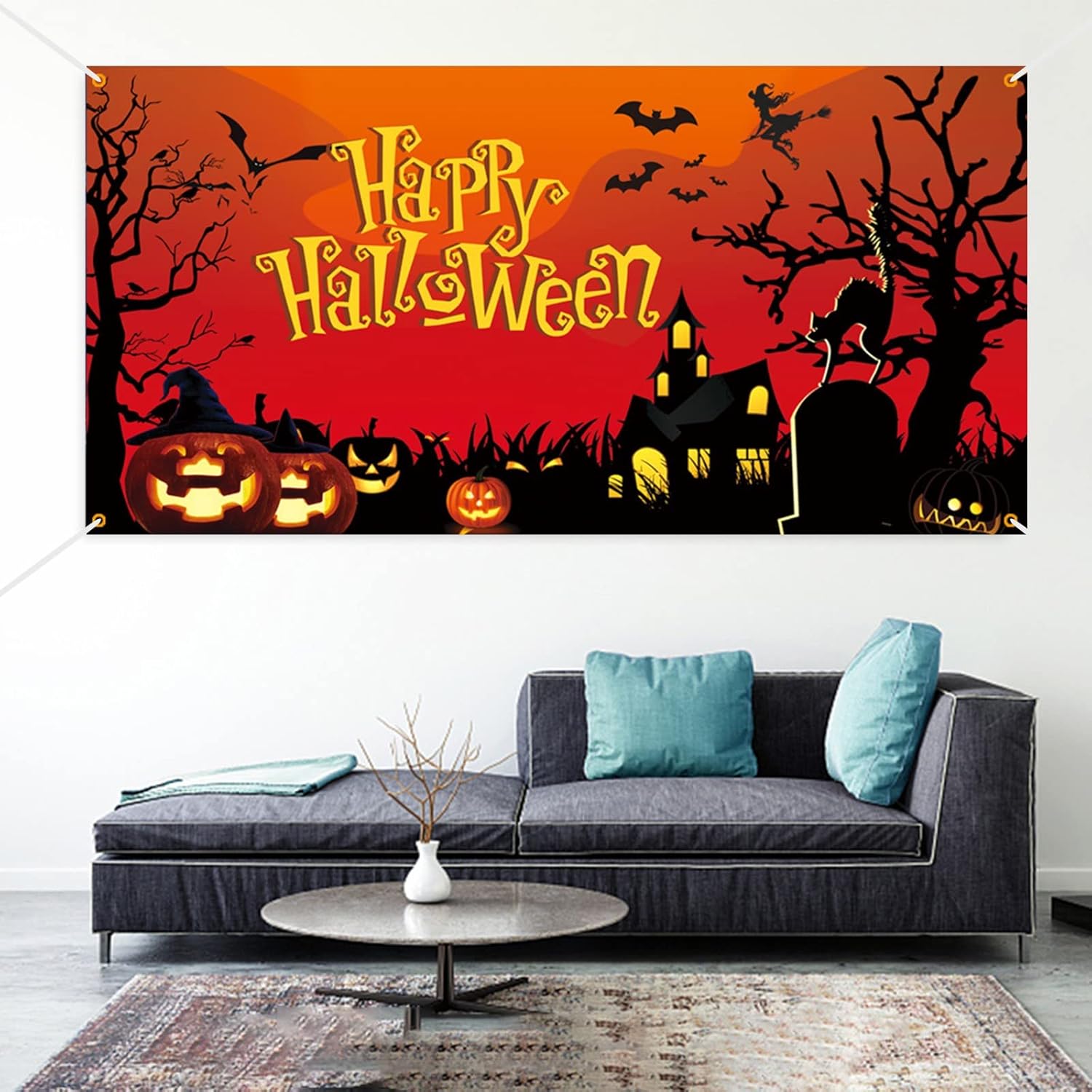 Design speciale: il design Wansheng è progettato da noi stessi. Lo striscione ha le lettere "Halloween" e i disegni di zucche, castelli e palloncini, che hanno attirato l'attenzione di tutti voi. La confezione include: uno striscione di Halloween da 180 cm x 90 cm con lettere di Halloween oversize stampate su di esso per una facile lettura. Grandi dimensioni Halloween Party Puntelli. Applicazione: molto adatto per feste di Halloween. Puoi usarlo per decorare stanze, pareti e giardini. Questo lascerà un momento indimenticabile per il tuo Halloween. Alta qualità: lo striscione di Halloween è realizzato in fibra di poliestere di alta qualità, durevole. Può essere piegato senza occupare troppo spazio. È leggero e facile da riporre e trasportare. Facile da appendere: puoi appendere la laurea con il nastro. Lo striscione ha quattro fori in acciaio che usavano per appendere con il nastro.
