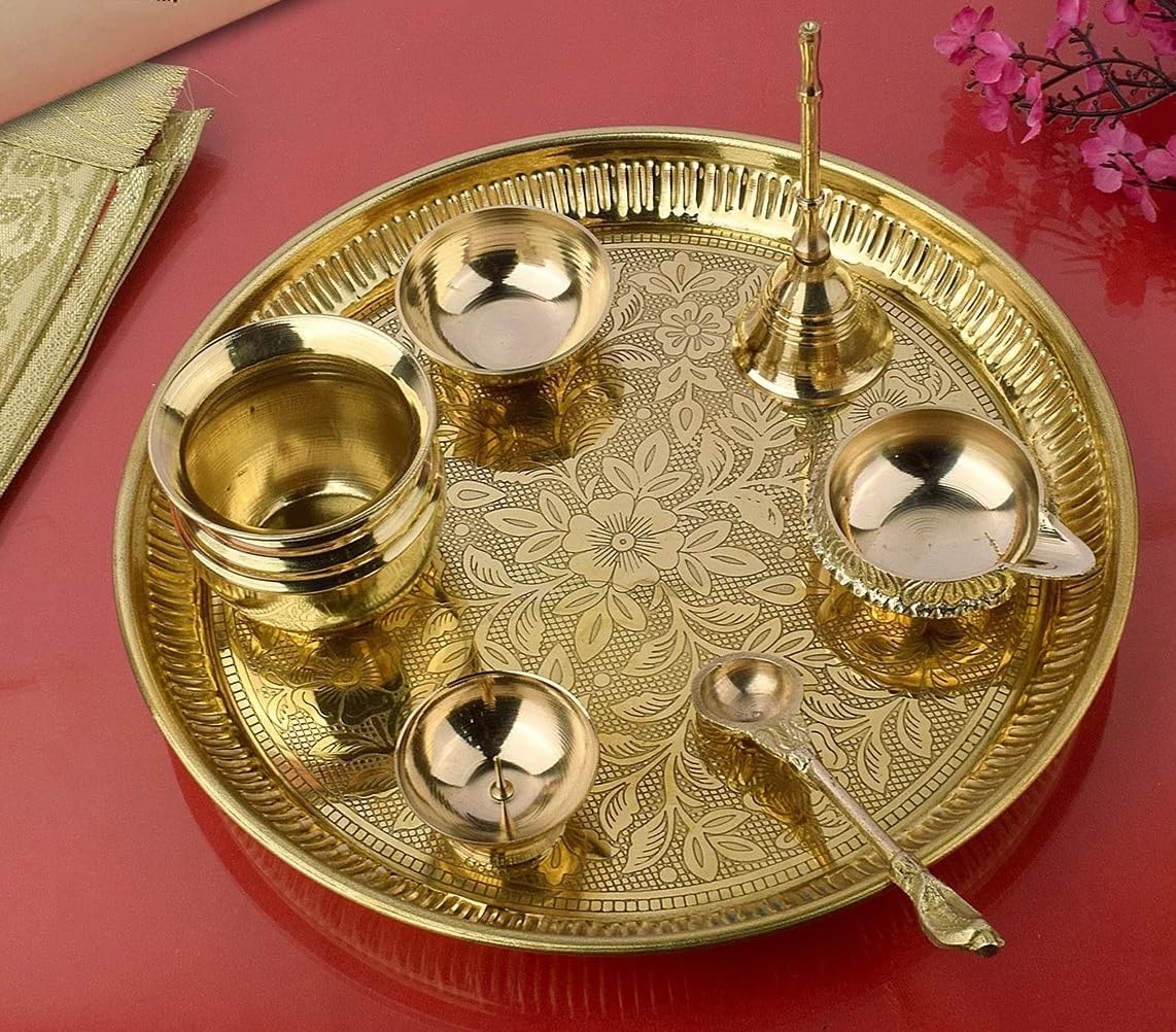 Contenuto della confezione: set Pooja thali da 7 pezzi (1 thali, 1 pentola, 1 katori, 1 cucchiaio, 1 diya, 1 campanella, 1 porta incenso) Dimensioni approssimative dell'articolo: Thali - Diametro: 8-10 pollici (20,3-25,5 cm); Profondità: 1 pollice (2,5 cm); Katori - Altezza: 0,3 pollici (0,7 cm); Diametro: 1,5 pollici (3,8 cm). P.S.: il colore del prodotto potrebbe variare leggermente a seconda della fotocamera e delle impostazioni del monitor. Colore: dorato; materiale: ottone (Nota: il design del vaso può variare) Bellissimo set pooja thali in ottone per pooja, havan e altri rituali pooja. Ideale per decorazioni diwali, raksha bandhan, navratri e altre occasioni speciali.
