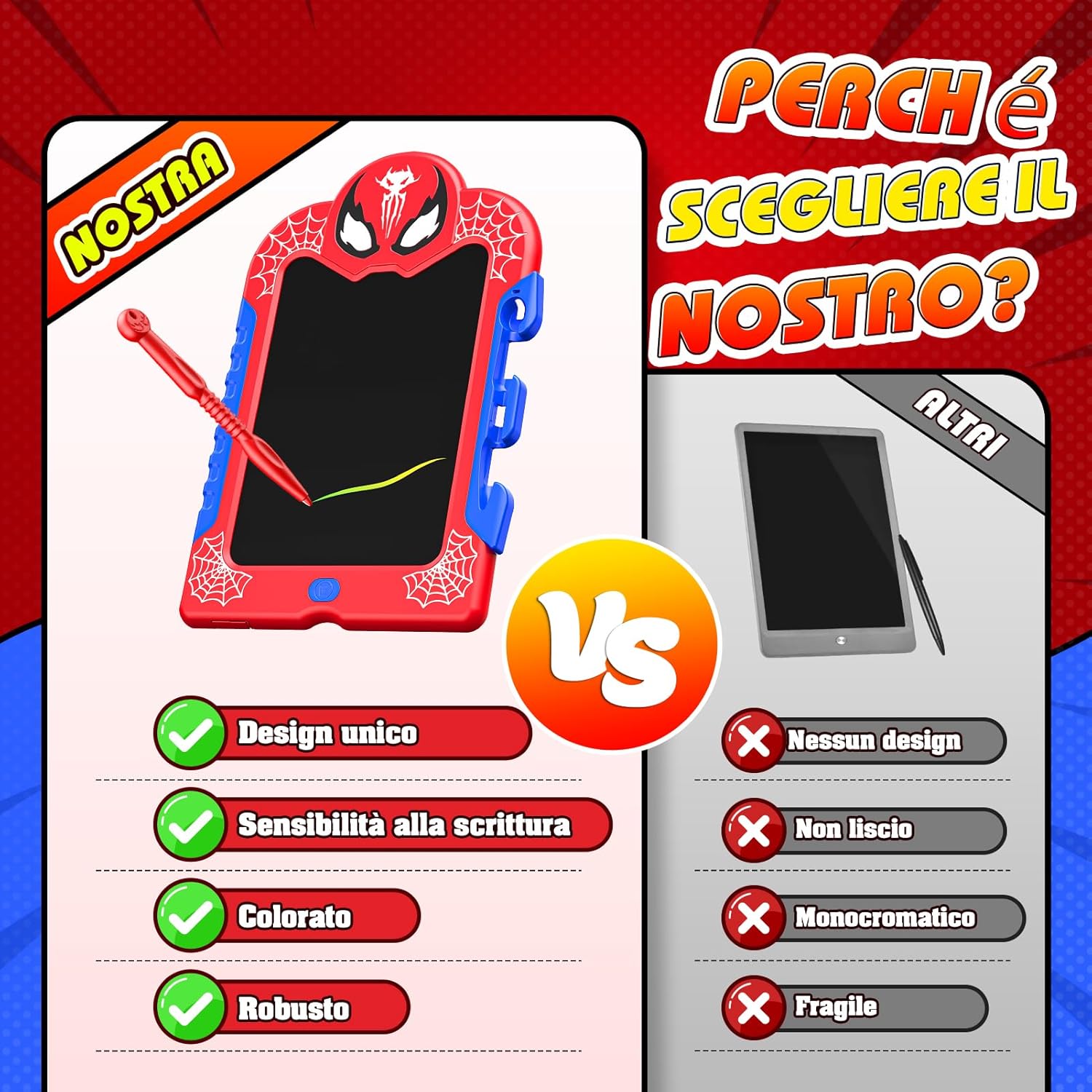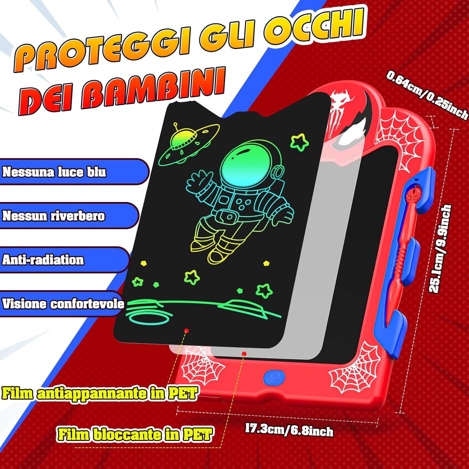 😎【Design unico e originale】Grazie al suo design moderno e accattivante, questo giochi per bambini di 2-3 anni trasforma il disegno in un'avventura. La combinazione di colori nero scuro e rosso acceso, insieme ai motivi, scatenano la creatività e rendono ogni sessione di disegno un'esperienza coinvolgente. 🧠【L'immaginazione senza limiti】Ogni bambino è nato con un'anima artistica. Con questo regalo per bambini di 2-3 anni, possono disegnare liberamente, creare storie e organizzare idee. Ideale per sviluppare la creatività, la fantasia e le abilità cognitive! 👁️【Schermo sicuro & funzionale】 realizzato con materiali premium, questo gioco per bambini di 2-8 anni offre uno schermo anti-caschi, impermeabile e dotato di un filtro antiriflesso per proteggere gli occhi. I colori vividi e le sfumature di spessore consentono di creare opere d'arte senza stress visivo. 🎒【Portatile e multiproprio】Con dimensioni compatte e leggero da trasportare, è perfetto per viaggi in auto, aereo o per la scuola. Puoi inserirlo facilmente in uno zaino o in una borsa, mantenendo i bambini concentrati e occupati anche durante le corse quotidiane. 🎁【Regalo ideale per ogni occasione】Ideal per bambini di 2-8 anni, è perfetto per la rientrata scolastica, compleanni, Natale, Pasqua e qualsiasi altro evento speciale. Un'opzione originale che combina divertimento, creatività e sviluppo motorio.