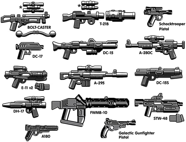 Armi personalizzate di alta qualità compatibili con molte minifigure di vari produttori di mattoncini Riproduzioni dettagliate di Blaster di film, serie e videogiochi Sono incluse 14 diverse armi: 1 bullone caster, composto da tre parti, 1 T-21B, tre parti, 1 A180, 1 E-11 V2 con caricatore rimovibile, 1 A-280C, 1 pistola Shocktrooper - 1 X A-295 – 1 X DC-15 – 1 X DC-15S – 1 X DH-17 – 1 X FWMB-10 – 1 X STW-48 con caricatore estraibile – 1 X DC-17 – 1 pistola Galactic Gunfighter In plastica ABS