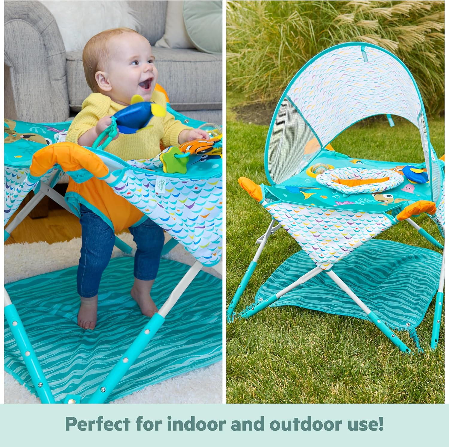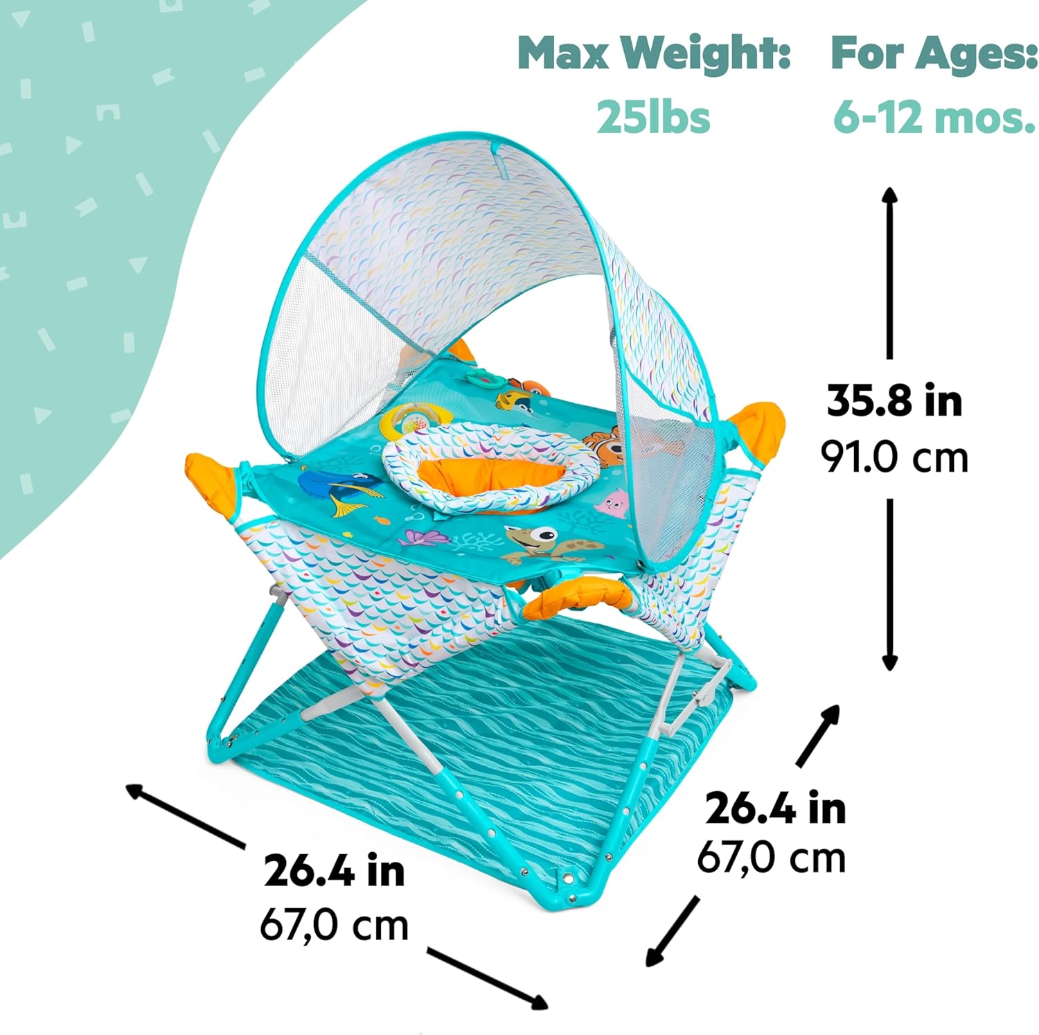 Il Pop ‘N Jump Alla ricerca di Nemo Disney Baby di Bright Starts è un jumper portatile compatto che si sistema in pochi secondi per offrire ai bambini uno spazio divertente e confortevole per giocare Questo jumper portatile salvaspazio è progettato per l'uso in ambienti interni ed esterni; la cappottina rimovibile offre ombra; dimensioni: 91,0 cm (A) x 67,0 cm (L) x 67,0 cm (P). 3 altezze regolabili che crescono con il bambino; i più piccoli ameranno i giocattoli sensoriali a tema Nemo, tra cui una pallina rotante, un sonaglio, un massaggiagengive e un libro con specchietto Per bambini da 6 a 12 mesi o fino a 11 kg; design facile da pulire con sedile lavabile in lavatrice Grazie all'innovativo design pieghevole, il leggero Pop ‘N Jump si sistema in modo semplice e veloce e si ripone nella borsa per il trasporto con tracolla inclusa