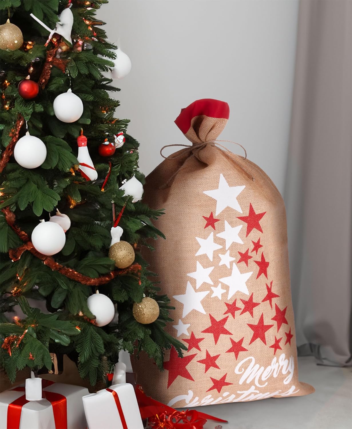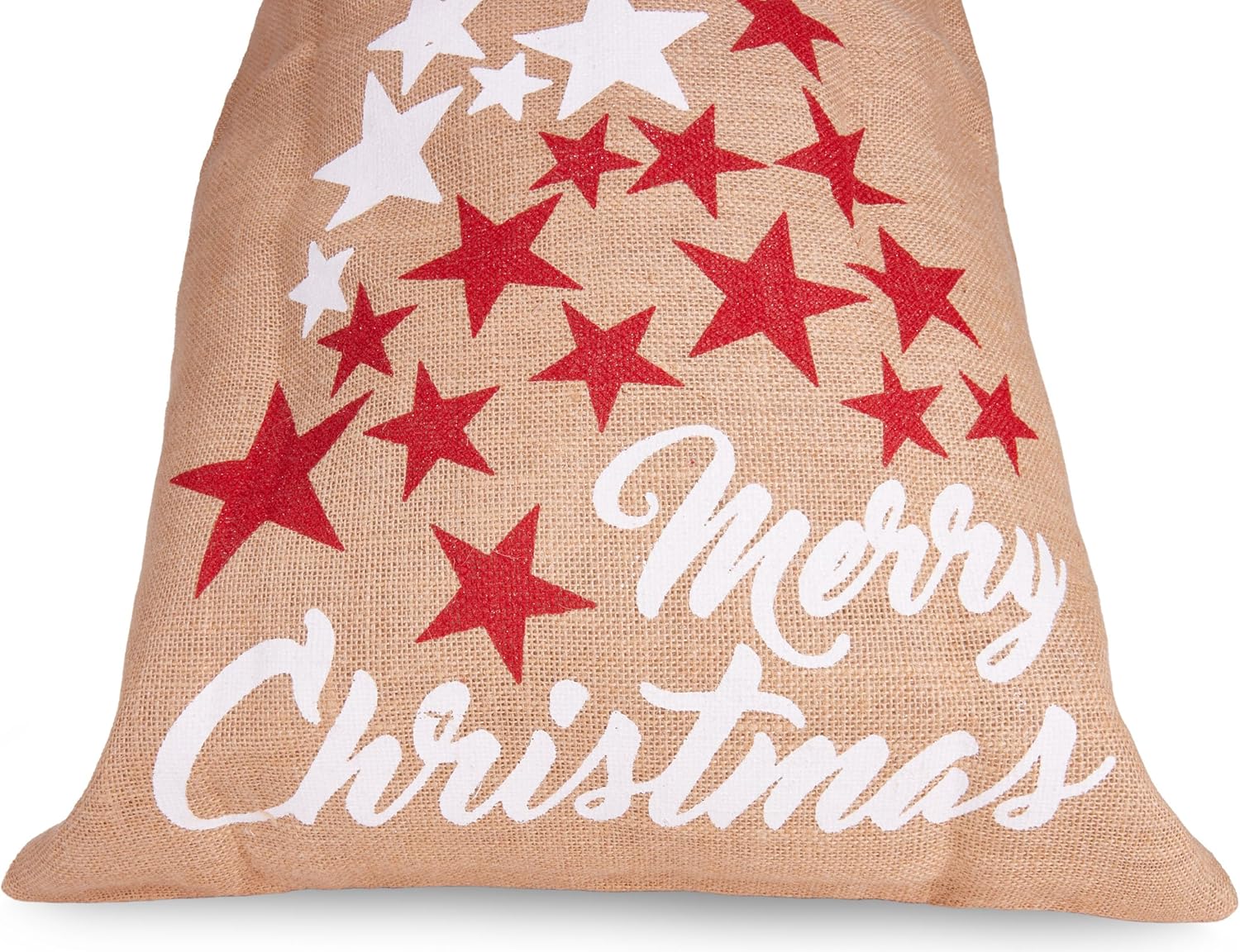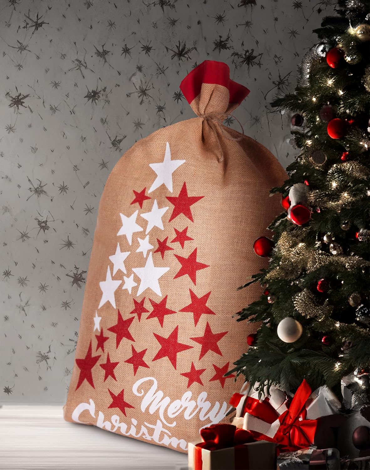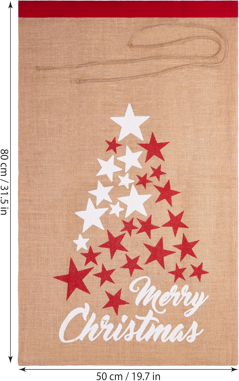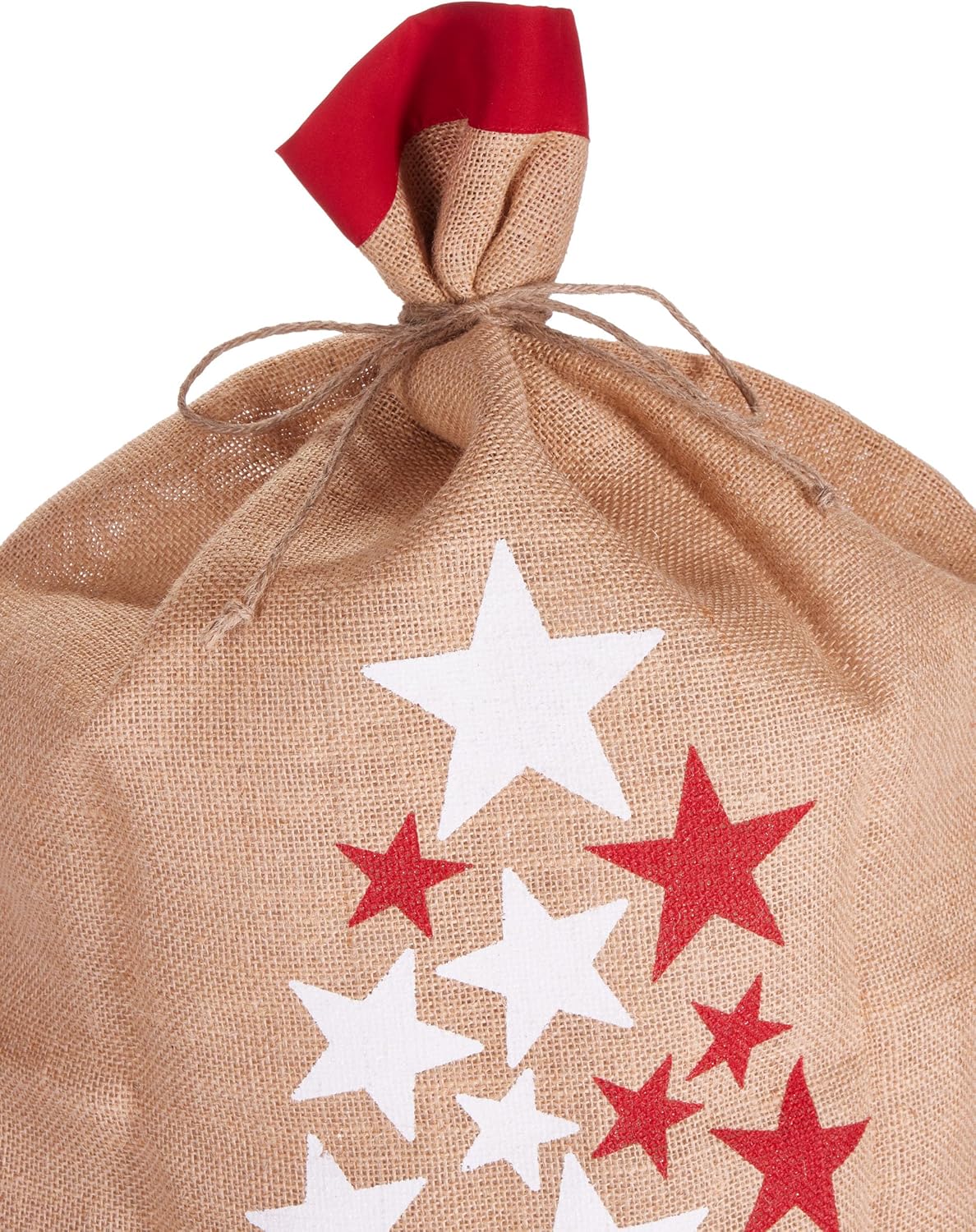 BRUBAKER Sacco natalizio stelle bianco rosso - Buon Natale - Sacco regalo natalizio 80 cm - Sacco Babbo Natale sacco in iuta con cordino per confezionare i regali - sacco in iuta