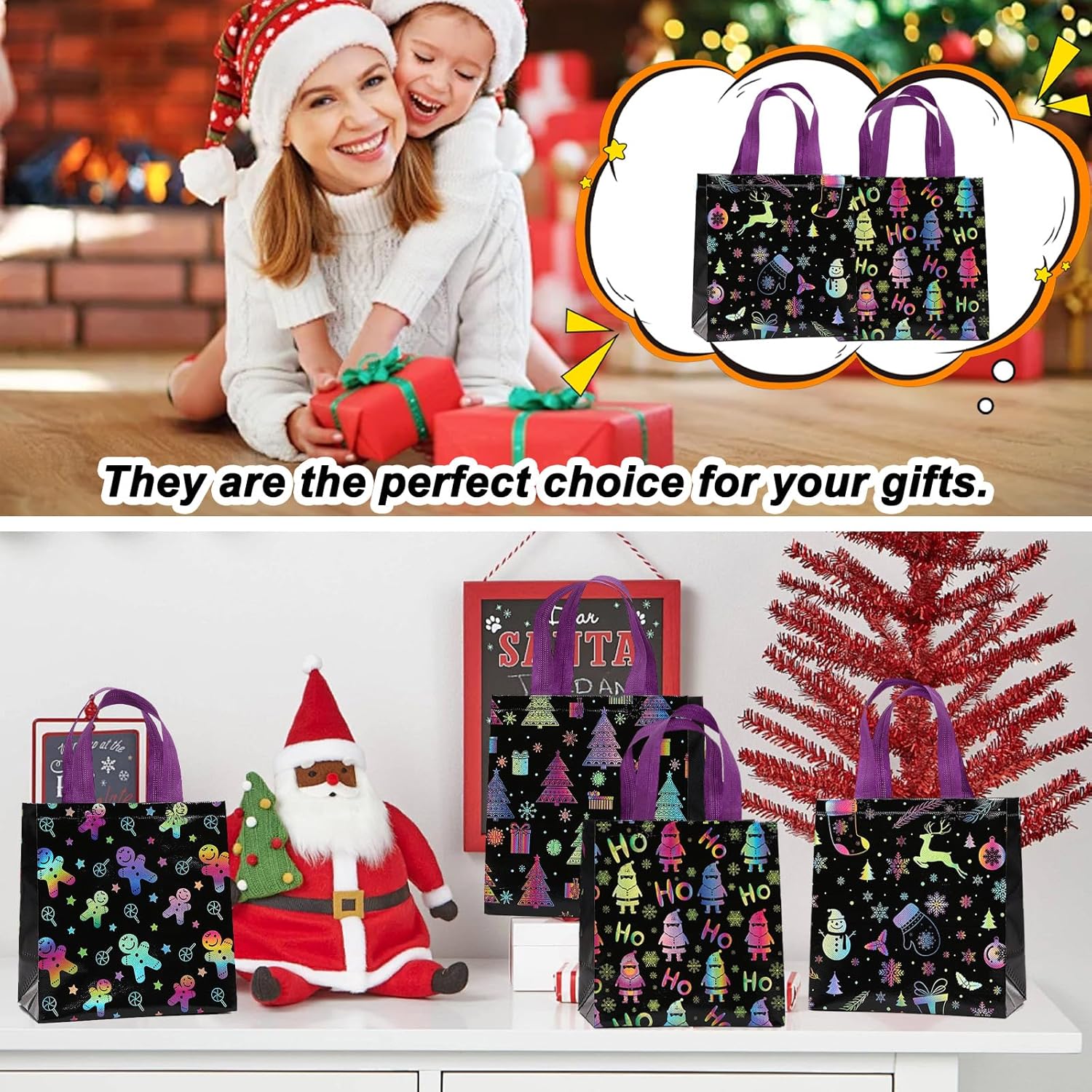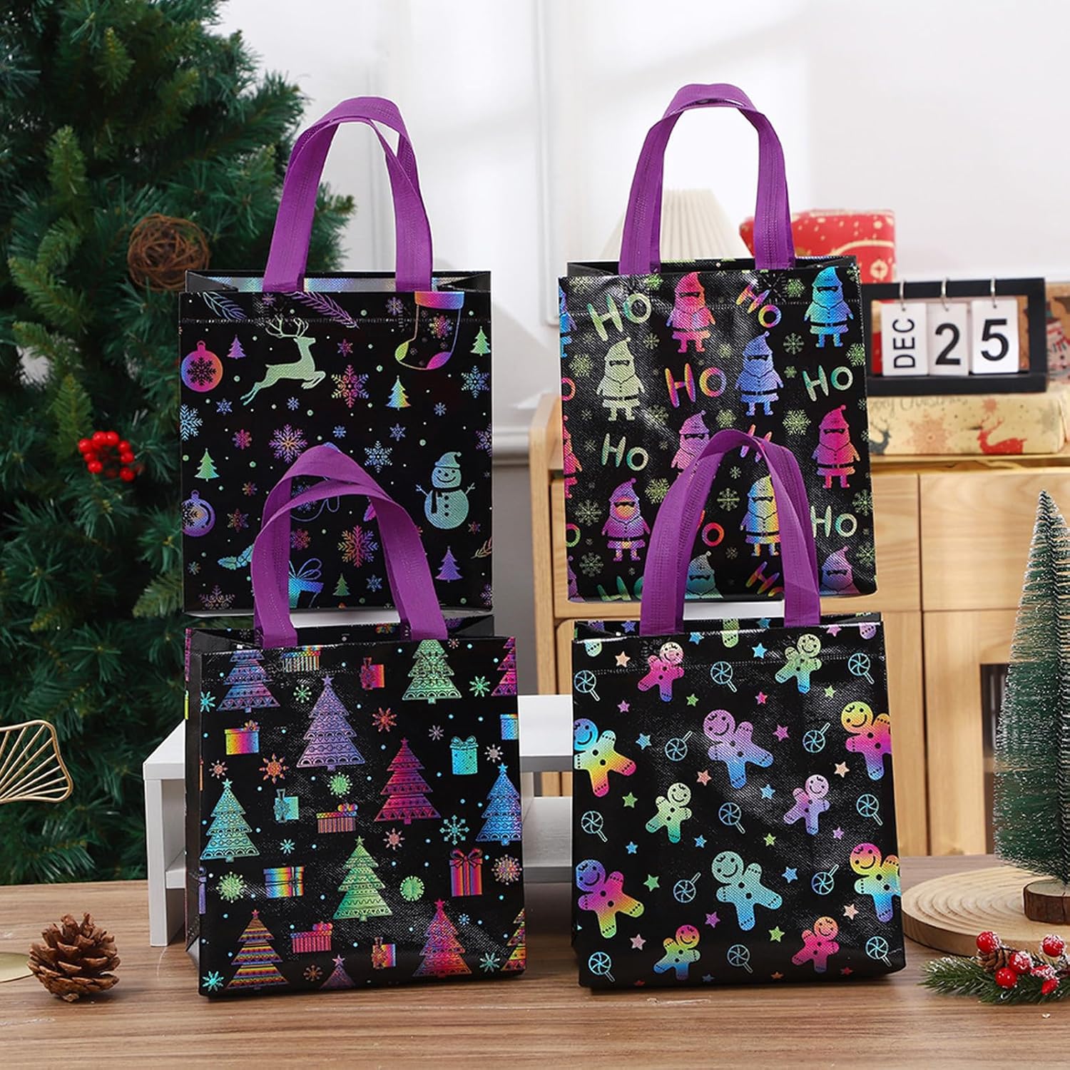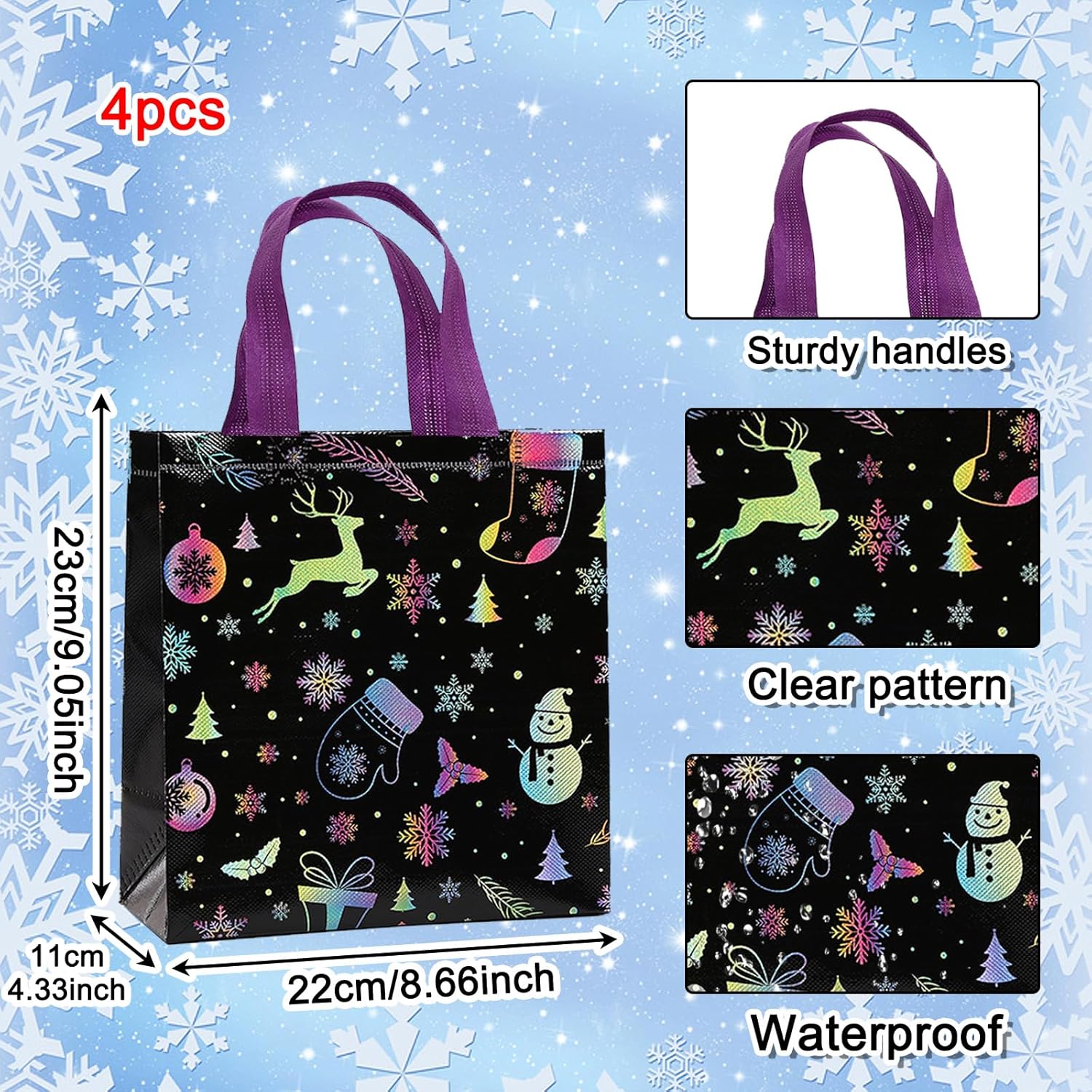 【Pratici sacchetti regalo di Natale】Questi sacchetti di stoffa natalizi in un set di 4 design natalizi neri (23x22x11 cm) - Ideali come sacchetti regalo di Natale grandi per dolci, giocattoli e sorprese festive. Borse natalizie perfette da conservare e regalare. 【Materiale di alta qualità】 Realizzate in tessuto non tessuto resistente e impermeabile, queste borse natalizie sono altamente riutilizzabili e rispettose dell'ambiente. Abbastanza resistente da poter essere utilizzato più volte, a differenza dei sacchetti di carta usa e getta. 【Varietà festosa di design】 Ogni sacchetto regalo di Natale mostra motivi incantevoli come Babbo Natale, pupazzo di neve e albero di Natale. Colori vivaci e motivi adatti ai bambini rendono queste borse natalizie un vero e proprio eye-catcher ad ogni festa di Natale. 【Confezione regalo di Natale ideale】 Con il loro ampio spazio di archiviazione, questi sacchetti regalo di Natale sono perfetti per confezionare regali, dolcetti o decorazioni natalizie. Facile da riempire, trasportare e riporre. 【Perfetto per le occasioni festive】 Che si tratti di feste di Natale, bazar dell'Avvento o decorazioni per la casa, questi sacchetti regalo di Natale possono essere utilizzati in vari modi. Crea un'atmosfera festosa e semplifica la consegna dei regali.