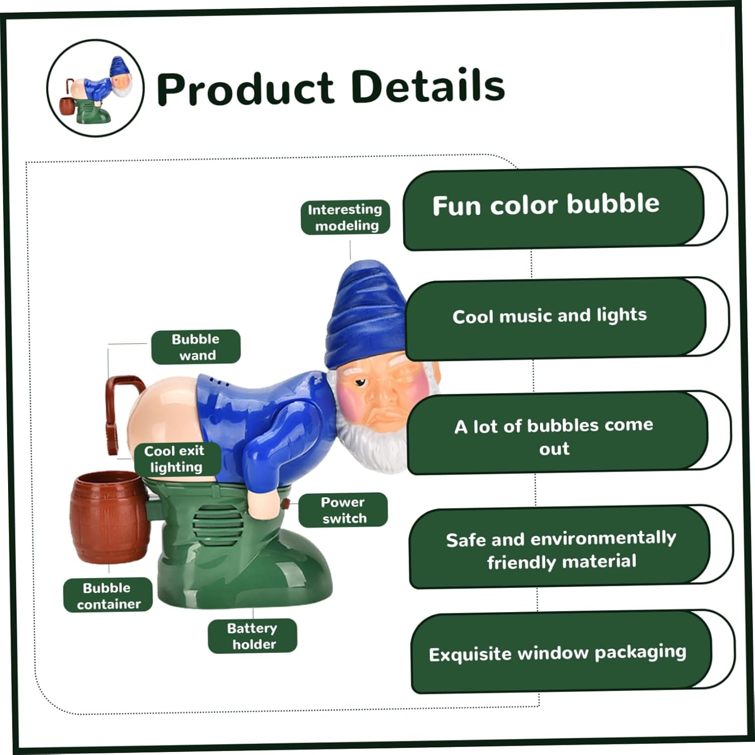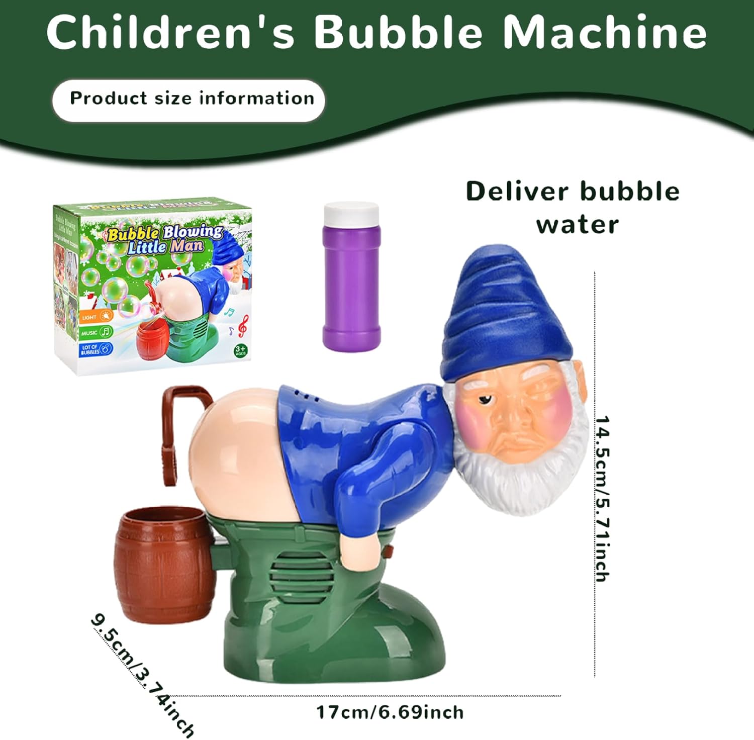 Affermato la batteria per un uso conveniente: questa macchina per soffiante a bolle è alimentata a batteria 3 x AA (non include), rendendo facile da usare e trasportare..Puoi portarlo ovunque tu vada a goderti bolle e intrattenimento in viaggio. Ideale per feste e regali: questa macchina per soffiante a bolle è un accessorio ideale per feste e regali..Aggiunge un tocco divertente e festivo a qualsiasi celebrazione e rende ottimo per bambini e adulti che amano bolle e intrattenimento. Divertente e festoso: questa macchina per il ventilatore a forma di gnomo di Natale è un'aggiunta divertente e festosa a qualsiasi festa o decorazione..La macchina produce bolle con un design di scoreggia divertente, aggiungendo un tocco giocoso alle tue celebrazioni. Viene fornito con acqua a bolle: la macchina del ventilatore a bolle viene fornita con acqua a bolle, che consente di usarla proprio fuori dalla scatola..Goditi il divertimento e l'intrattenimento istantanei con questa comoda e pratica macchina a bolle. Effetti di luce e sonori: la macchina del ventilatore a bolle presenta effetti di luce e sonori che migliorano il valore di intrattenimento della macchina..Le luci colorate e i suoni giocosi creano un'atmosfera divertente e coinvolgente per bambini e adulti.